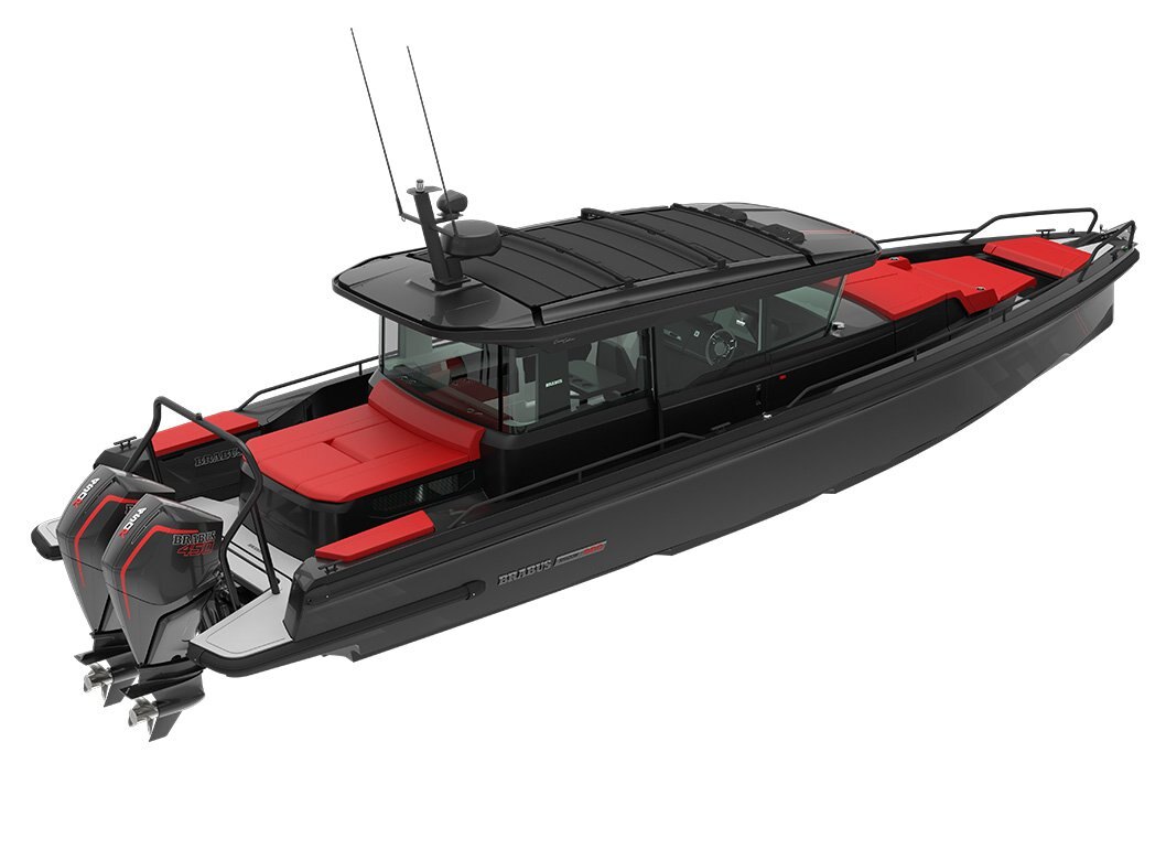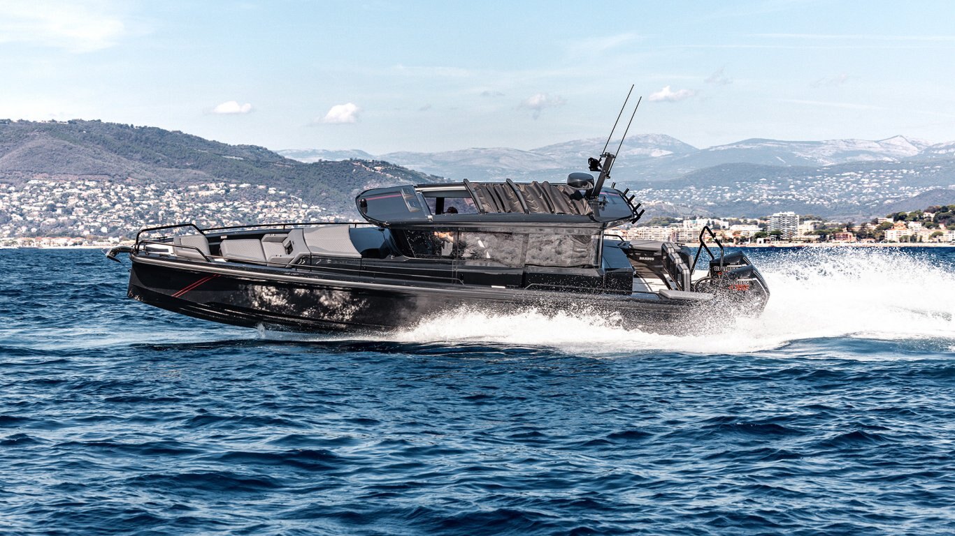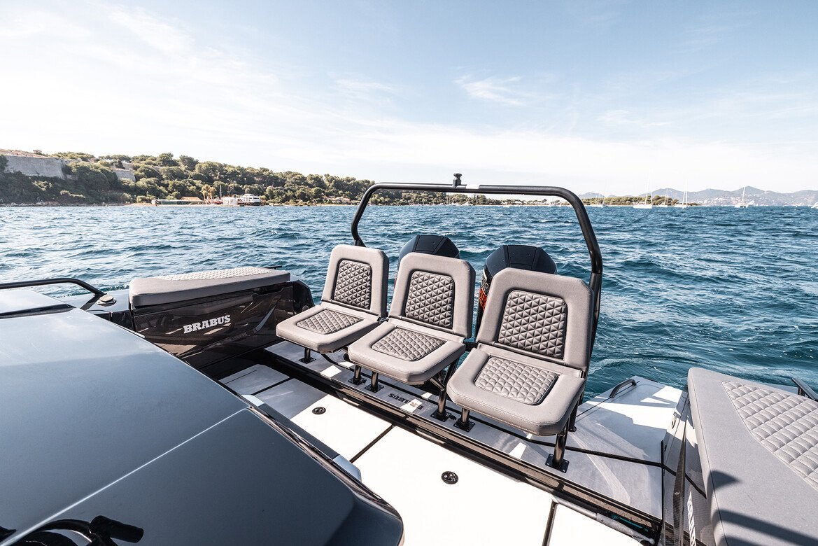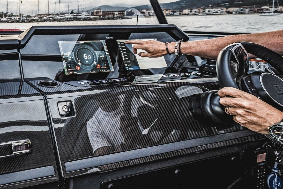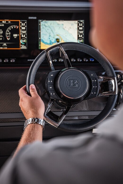 Electronics - The BRABUS Shadow 900 features a Simrad®️ dual touch -screen full width, ‘Glass Helm Information Display' with an updated BRABUS User-Interface, including G-shock monitoring, access to the boat’s main navigation, engine management, on board entertainment and driving-assist features. With the extended Navigation Package the helm is expanded into a four screen “bridge” setup that includes additional functions like displaying the speed for the passengers, audio controls and also a digital Panerai watch.
