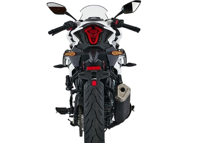 The integrated frame design reduces overall weight resulting in quicker acceleration, improved maneuverability, and effortless handling. Suspension A high-quality 37mm upside-down front fork and rear monoshock provide exceptional damping capabilities. The upside-down fork enhances front-end stability and responsiveness, offering precise feedback and improved control during cornering. |