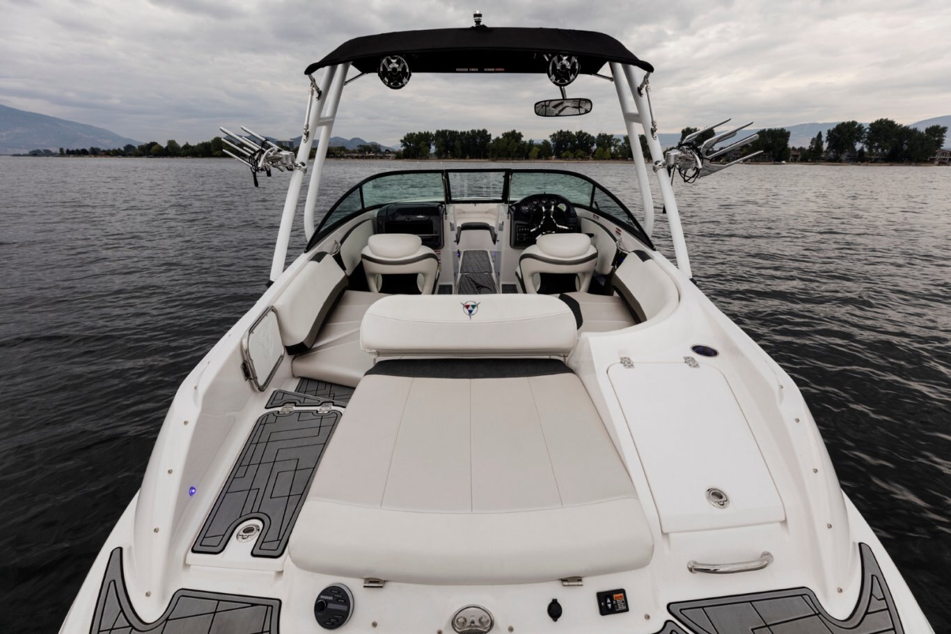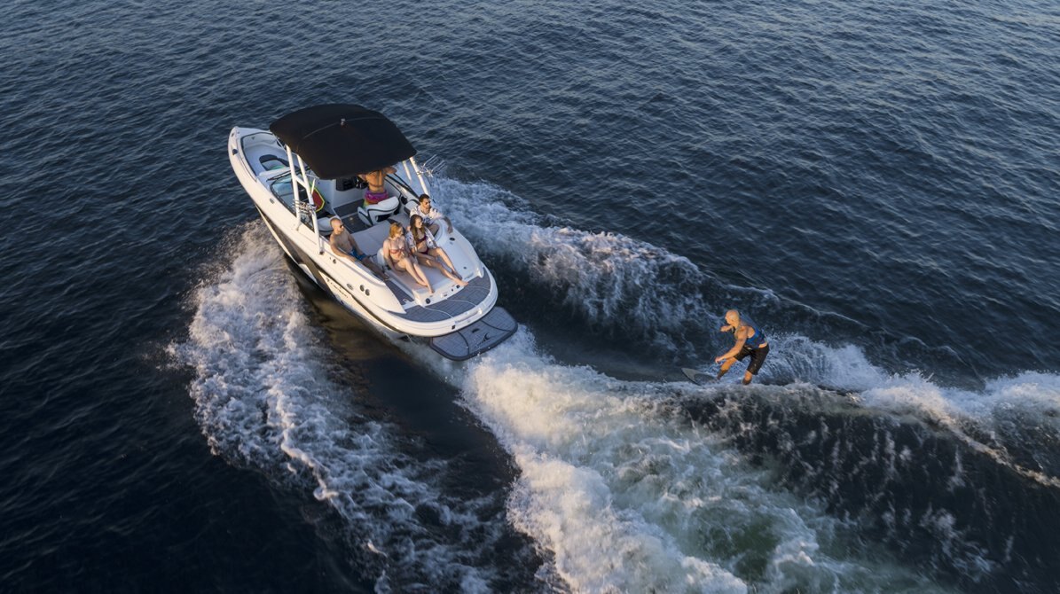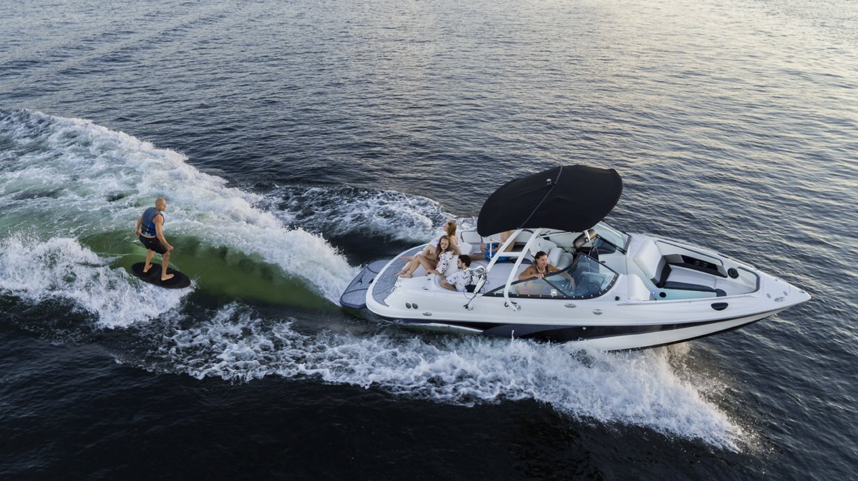 - Premium tower package (incl. bimini top, tow mirror, chrome tower speakers, LED lights, Typhoon rotating board racks wake/surf combo)