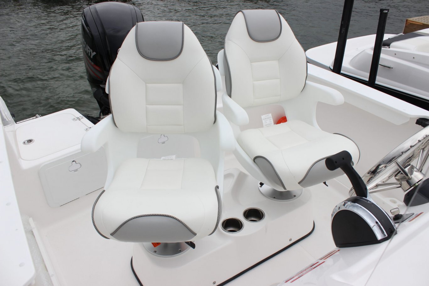 LED courtesy lighting Glove compartment (lockable) Stainless steel cup holders/ice box Drink holders 88 litre (98 qt) portable cooler Down rigger mounting surface Built-in tackle box Deck rod holders 30-gal bait tank 36-gal fish storage tanks (2) Cockpit rod storage Transom fold away aft bench seat w/removable back rest 29″ (avg.) interior free board Swivel bucket seats w/fore & aft slider base w/fold-down jump seats Hard top package Gunnel rod storage Gunnel side storage Console storage Fuel gauge Speedometer Hard top with sliding side windows