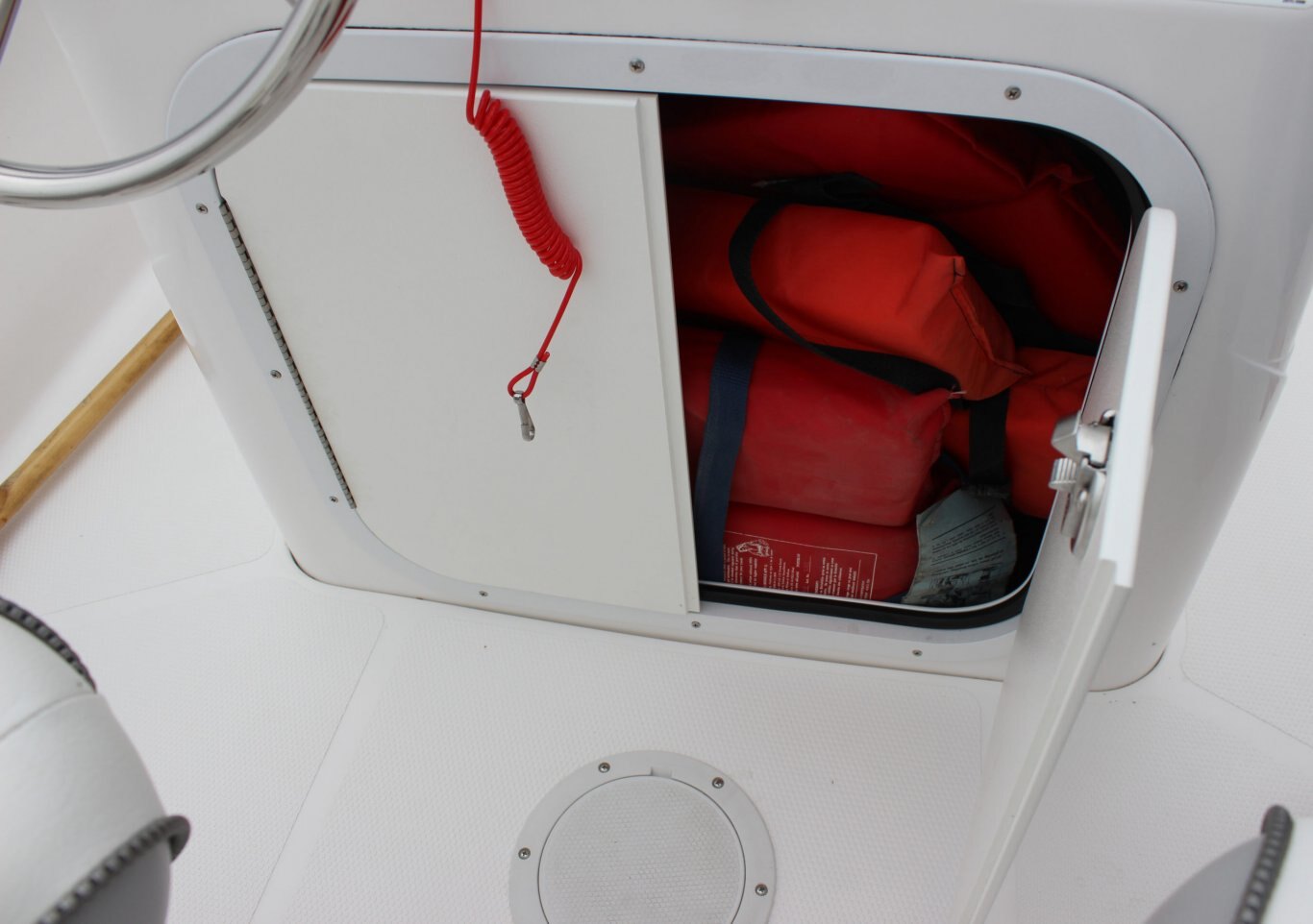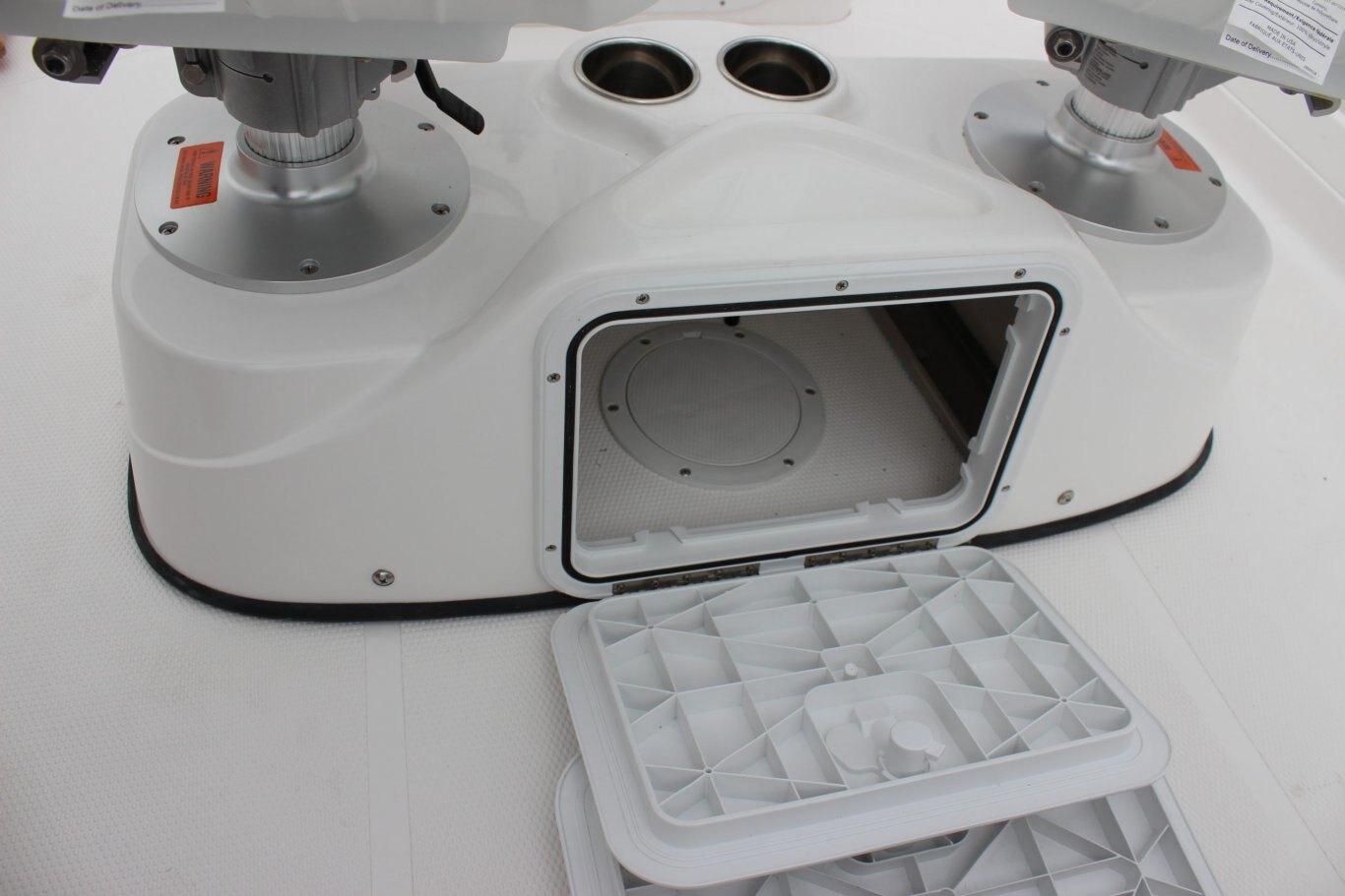 Color coded electrical system w/fused circuit protection Kicker® KMC100 Media Center, AM/FM, Bluetooth, USB, iPod 2 Kicker® exterior speakers 2 Kicker® interior speakers Dash light dimmer Seastar® hydraulic steering Heavy duty articulated wiper (starboard) Heavy duty articulated wiper (port) Compass w/5″ bezel in lighted binnacle Electric horn Trim tabs with indicators Powerpoints (5) Automatic bilge pumps Multi-battery switch Engine room lighting Fresh & grey water tanks w/monitors Battery tray Fresh water dock inlet Remote spotlight (hard top only) anchor roll Bow rope locker w/hawse pie Integrated LED docking lights Full-width twin o/b aluminum bracket & dive ladder Enviro responsible resin Dual portable fuel tanks (24L/6 USG x2) Starboard swim platform w/ladder Raw water wash down system