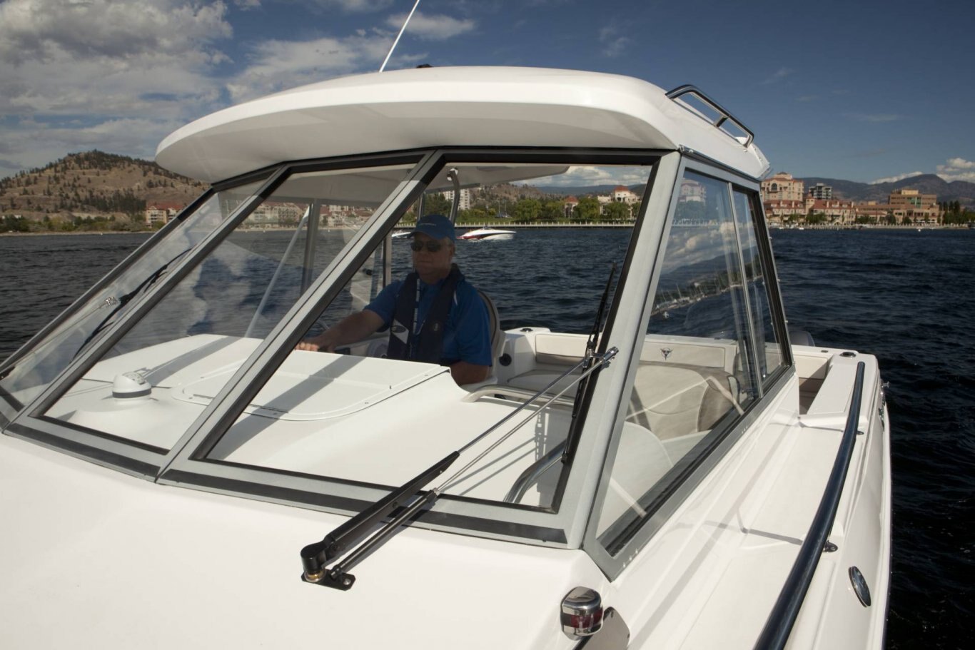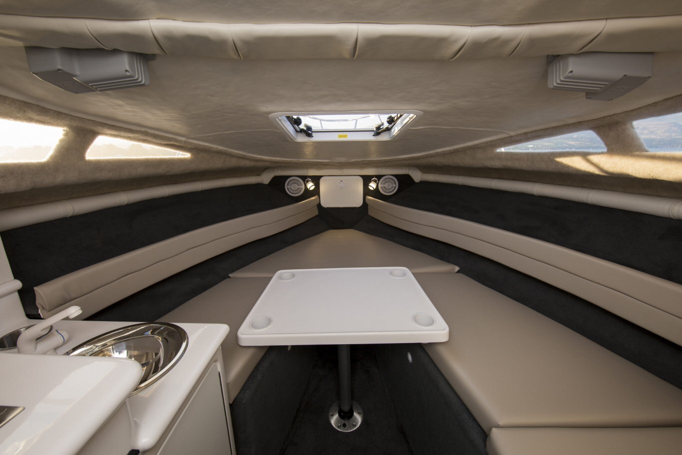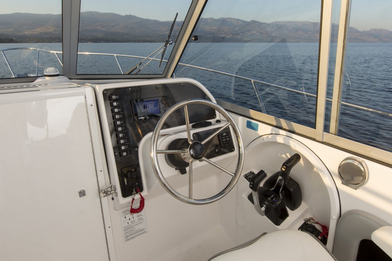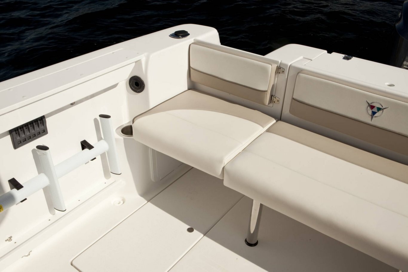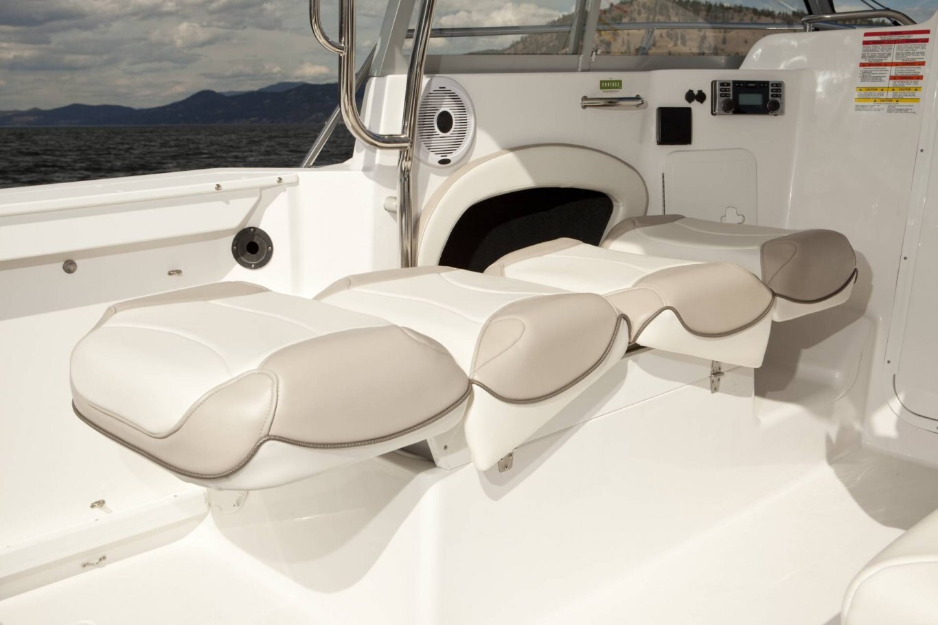 Color coded electrical system w/fused circuit protection Kicker® KMC100 Media Center, AM/FM, Bluetooth, USB, iPod 2 Kicker® exterior speakers 2 Kicker® interior speakers Dash light dimmer Seastar® hydraulic steering Heavy duty articulated wiper (starboard) Heavy duty articulated wiper (port) Compass w/5″ bezel in lighted binnacle Electric horn Trim tabs with indicators Powerpoints (5) Automatic bilge pumps Multi-battery switch Engine room lighting Fresh & grey water tanks w/monitors Battery tray Fresh water dock inlet Remote spotlight (hard top only) anchor roll Bow rope locker w/hawse pie Integrated LED docking lights Full-width twin o/b aluminum bracket & dive ladder Enviro responsible resin Dual portable fuel tanks (24L/6 USG x2) Starboard swim platform w/ladder Raw water wash down system