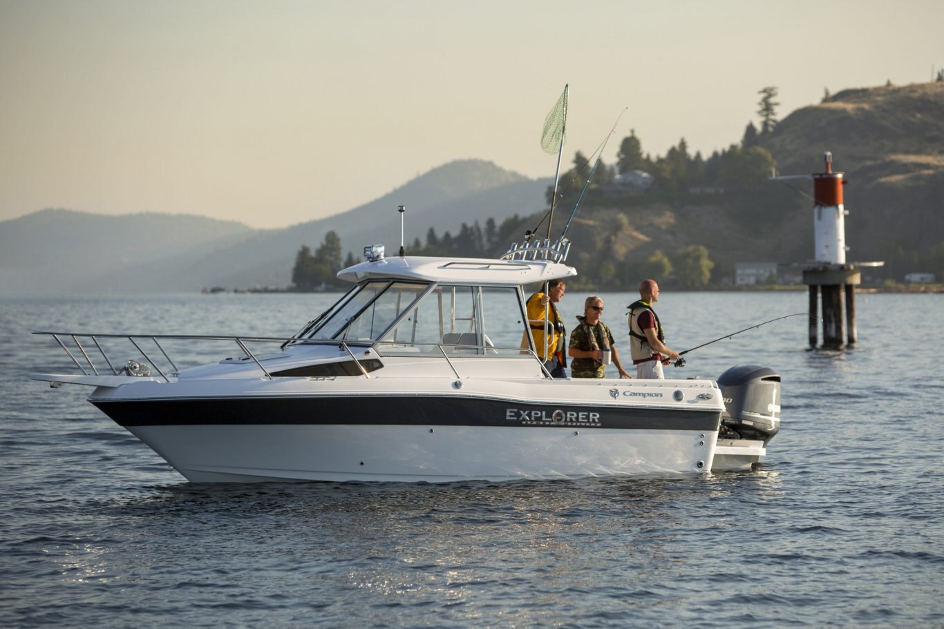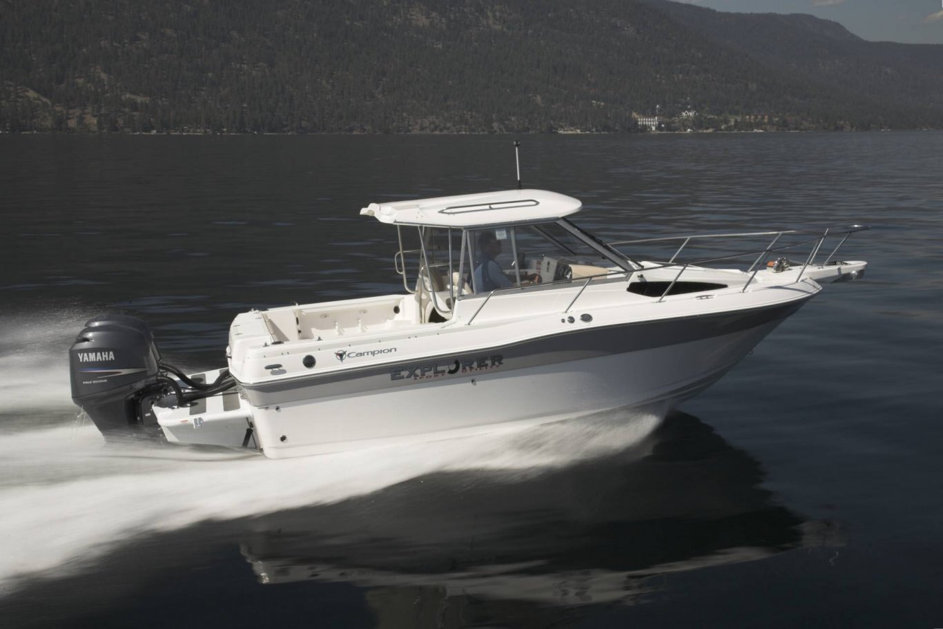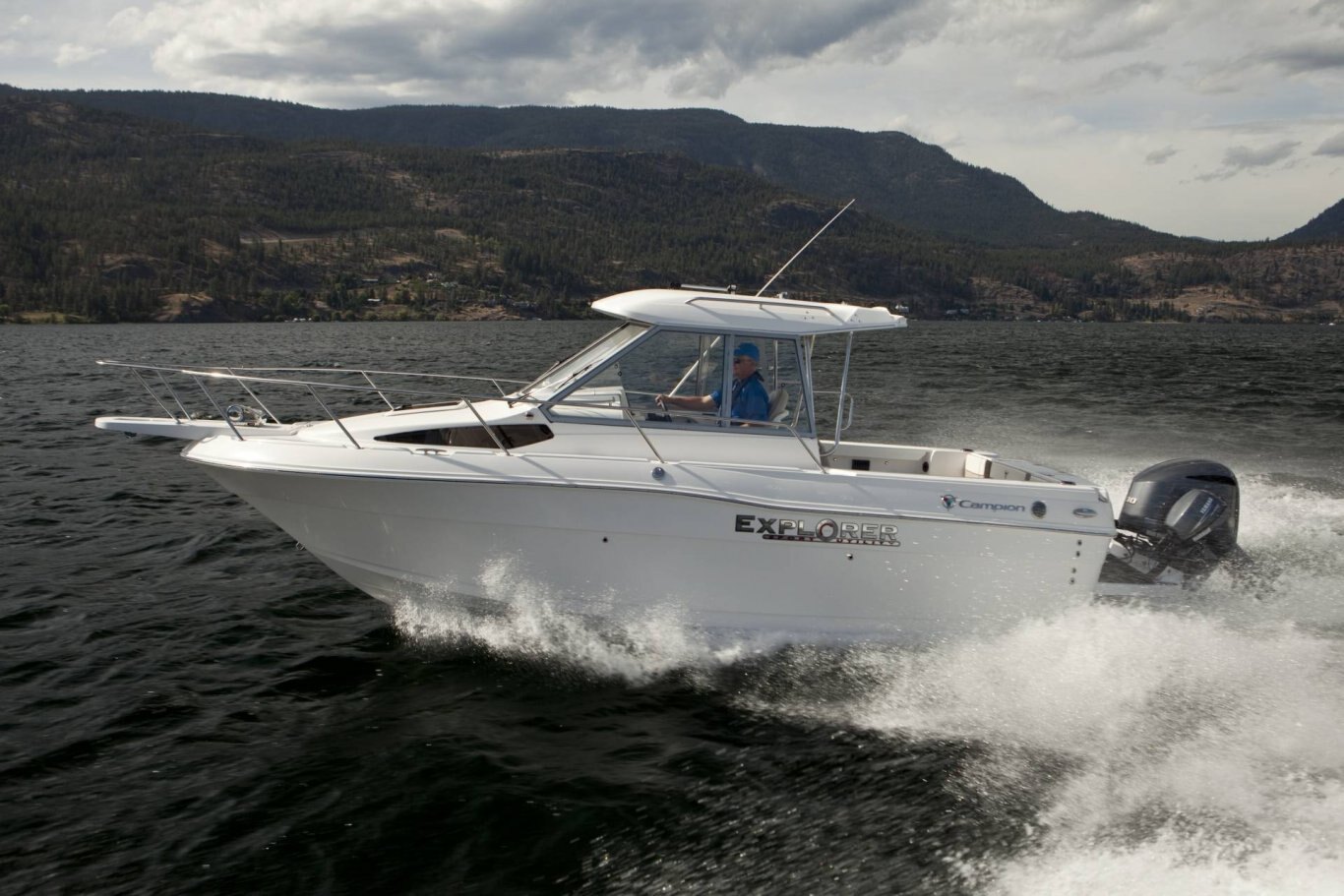 Apex hull Three-dimensional woven fiberglass XL stringer grid Composite transom Corecell sandwich laminate Kevlar laminate reinforcement Uni-bond deck joint Walk-thru transom Fore deck walk around Campion Marine Deck, cockpit & liner Full interior fiberglass liner Enhanced sound insulation Bow pulpit w/stainless steel 5 Mooring cleats Built-in Kicker motor transom mount Fiberglass hull liner Fiberglass cockpit w/overboard drainage