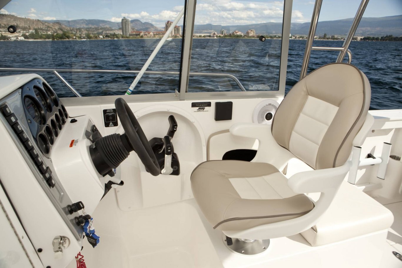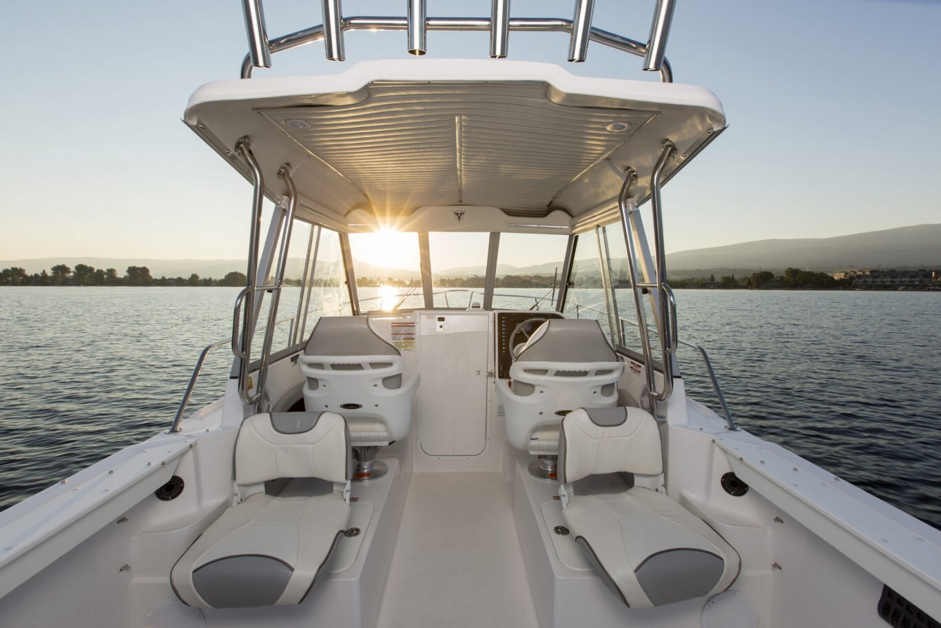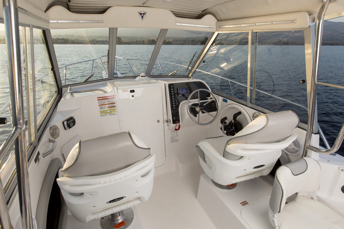 LED courtesy lighting Glove compartment (lockable) Stainless steel cup holders/ice box Drink holders 88 litre (98 qt) portable cooler Down rigger mounting surface Built-in tackle box Deck rod holders 30-gal bait tank 36-gal fish storage tanks (2) Cockpit rod storage Transom fold away aft bench seat w/removable back rest 29″ (avg.) interior free board Swivel bucket seats w/fore & aft slider base w/fold-down jump seats Hard top package Gunnel rod storage Gunnel side storage Console storage Fuel gauge Speedometer Hard top with sliding side windows