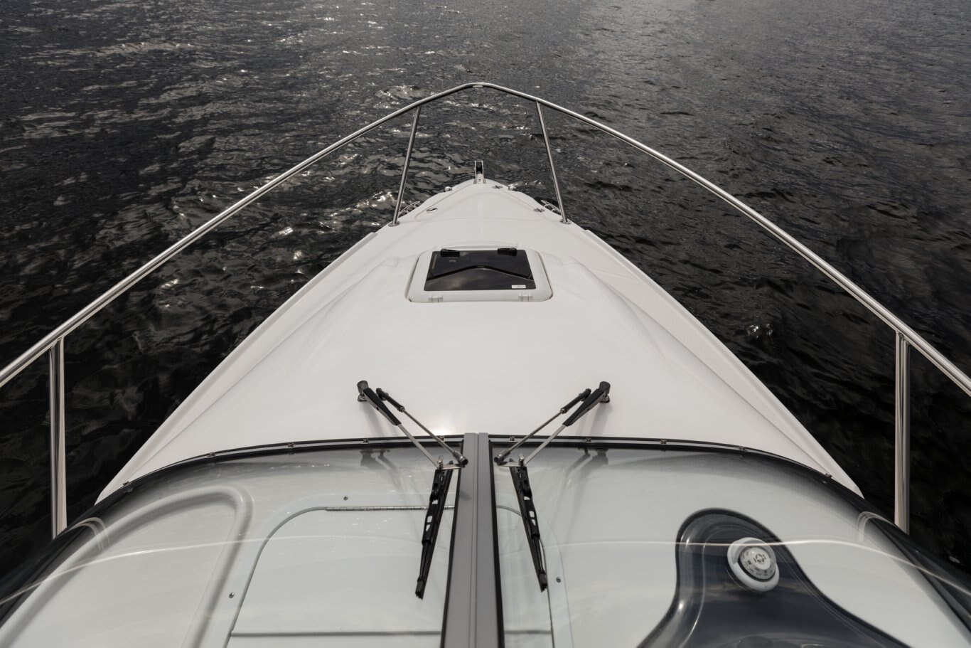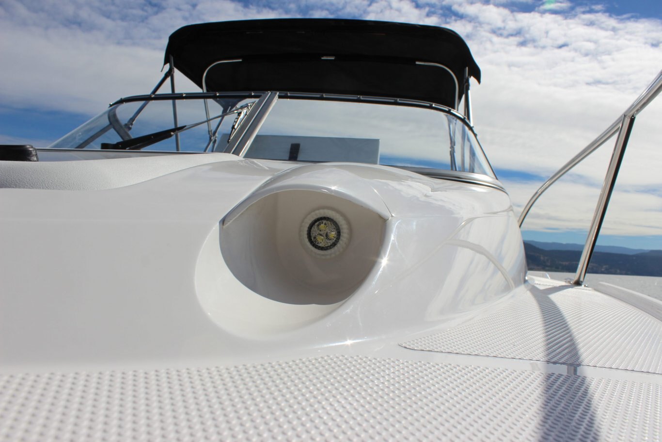 Apex hull Three-dimensional woven fiberglass XL stringer grid Composite transom Kevlar laminate reinforcement Uni-bond deck joint Color coordinated gel coat feature Fiberglass cockpit w/overboard drainage Bow rope locker Integrated LED docking lights