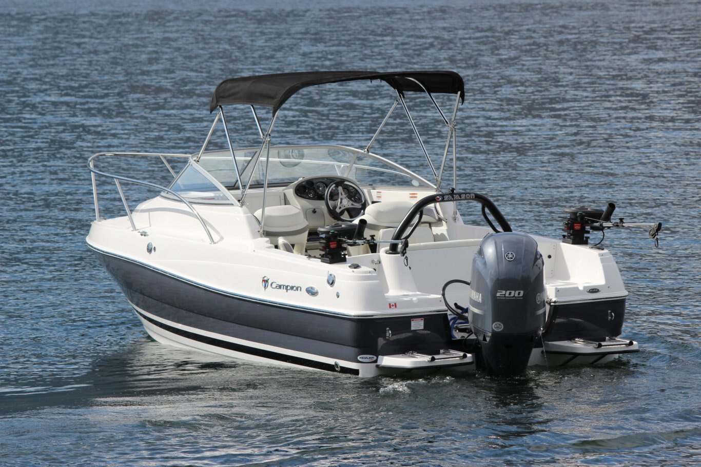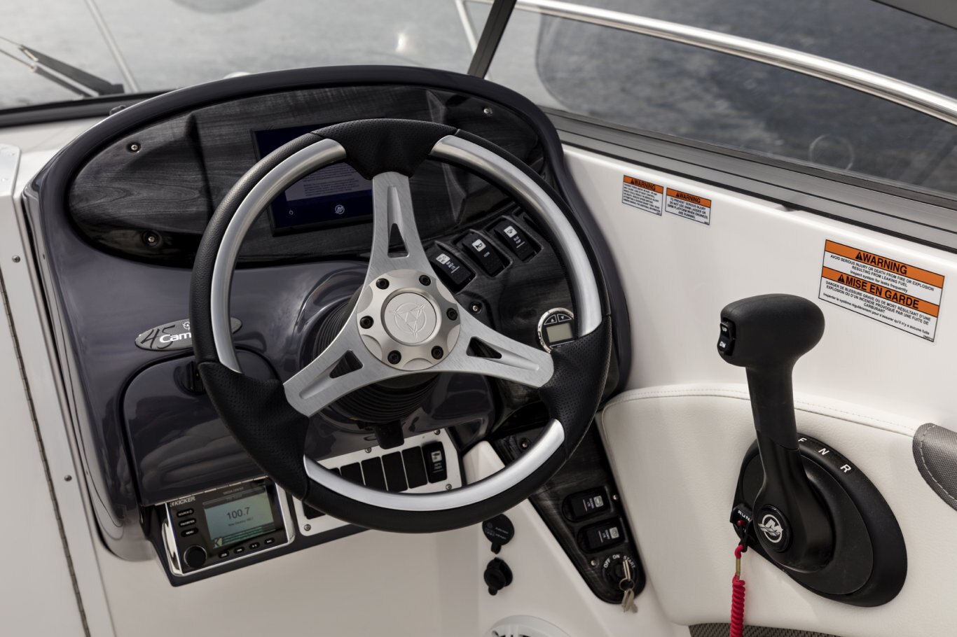 Color coded electrical system w/fused circuit protection Kicker® KMC100 Media Center, AM/FM, Bluetooth, USB, iPod Driver-side stereo remote 4 Kicker® exterior speakers Tilt steering Hourmeter In-dash depth sounder Electric horn Powerpoint Automatic bilge pump Cuddy cabin w/storage and lighting Compound curve windshield Enviro responsible resin Battery tray White extended swim platform w/telescoping ladder Lockable bi-fold door Porta Potti w/pump out Full instrumentation Transom tilt switch