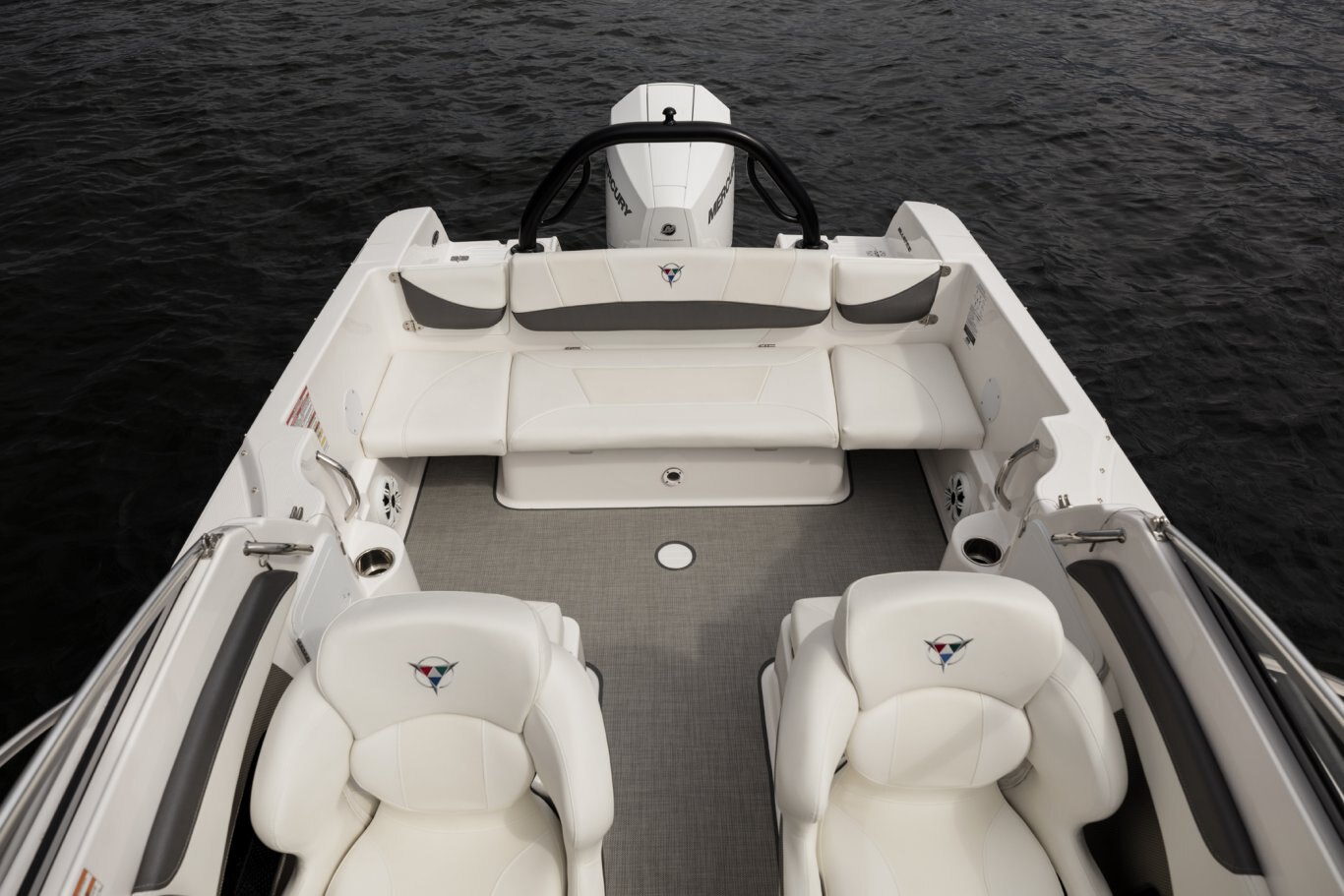 LED courtesy lighting Convertible table w/fill in cushions Premium snap in marine flooring Portable cooler Gunnel side storage Stainless steel cup holders Razor ultra suspension bucket seat with starboard & port flip bolsters with fore & aft slider base Walk-thru transom Aft lounge w/flip backrest Glove compartment / ice box Portable storage bins Gunnel side storage Padded engine cover/sun pad w/bench seat & storage under Bow seating with storage under Wrap around aft seating w/storage under Ski locker