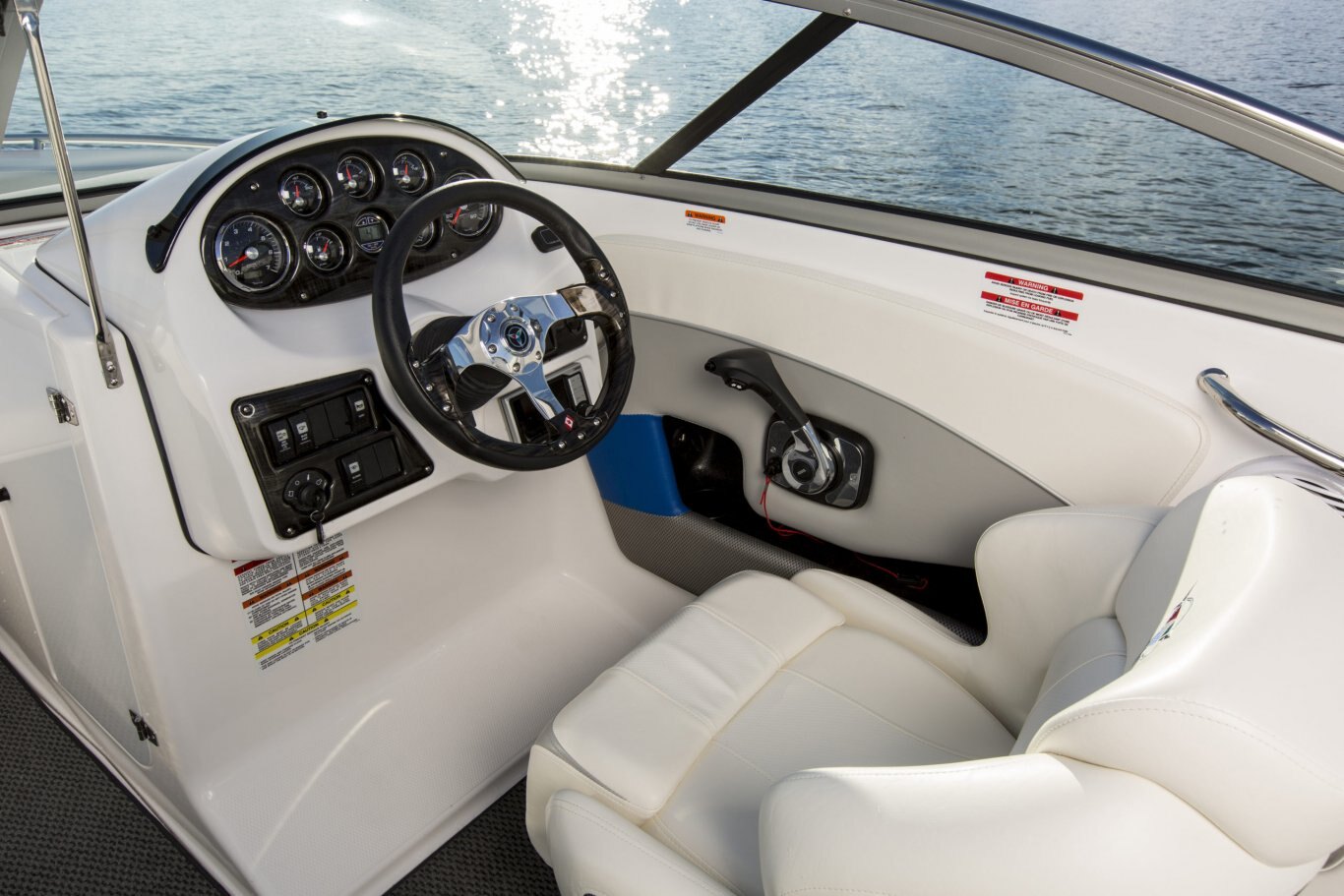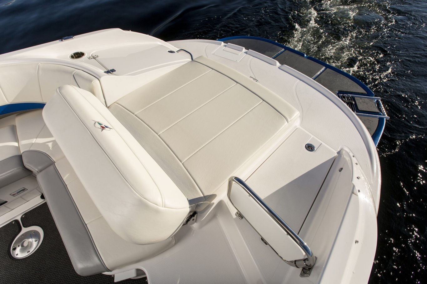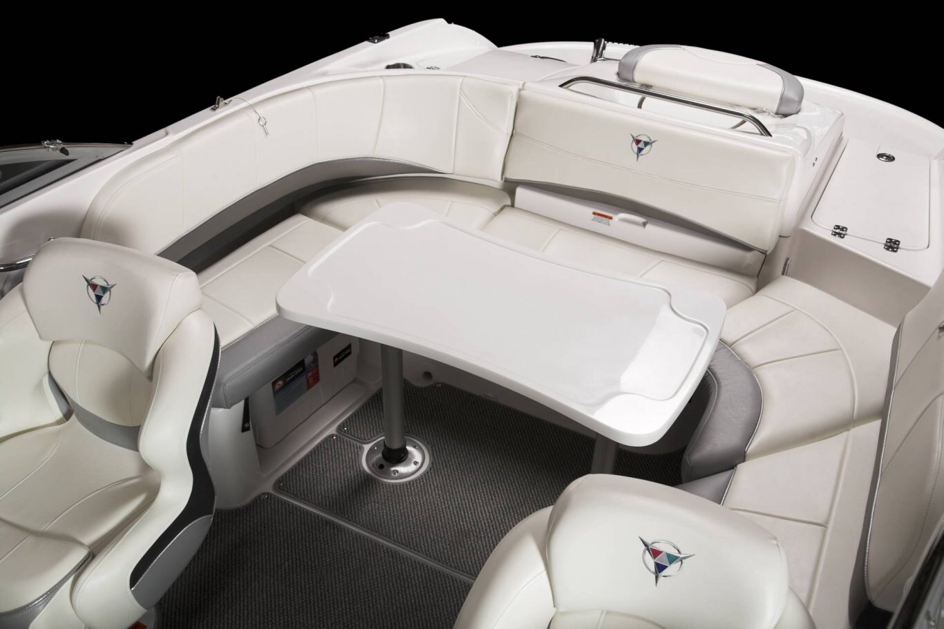 LED courtesy lighting Convertible table w/fill in cushions Premium snap in marine flooring Portable cooler Gunnel side storage Stainless steel cup holders Razor ultra suspension bucket seat with starboard & port flip bolsters with fore & aft slider base Walk-thru transom Aft lounge w/flip backrest Glove compartment / ice box Portable storage bins Gunnel side storage Padded engine cover/sun pad w/bench seat & storage under Bow seating with storage under Wrap around aft seating w/storage under Ski locker