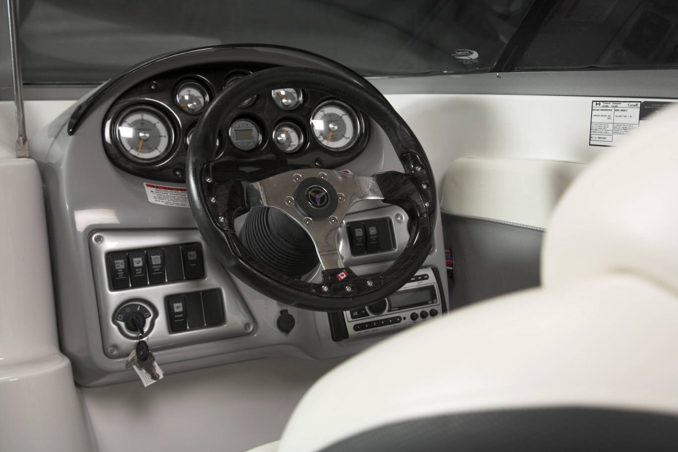 Color coded electrical system w/fused circuit protection Kicker® KMC100 Media Center, AM/FM, Bluetooth, USB, iPod Driver-side stereo remote 4 Kicker® exterior speakers Tilt steering Hourmeter In-dash depth sounder Electric horn Powerpoint Automatic bilge pump Cuddy cabin w/storage and lighting Compound curve windshield Enviro responsible resin Battery tray White extended swim platform w/telescoping ladder Lockable bi-fold door Porta Potti w/pump out Full instrumentation Transom tilt switch