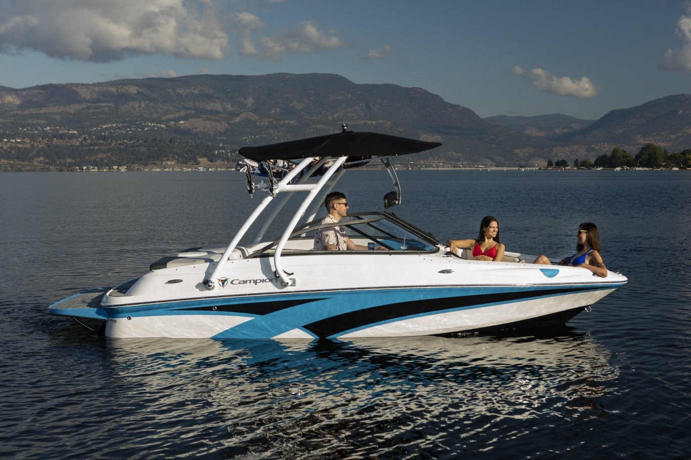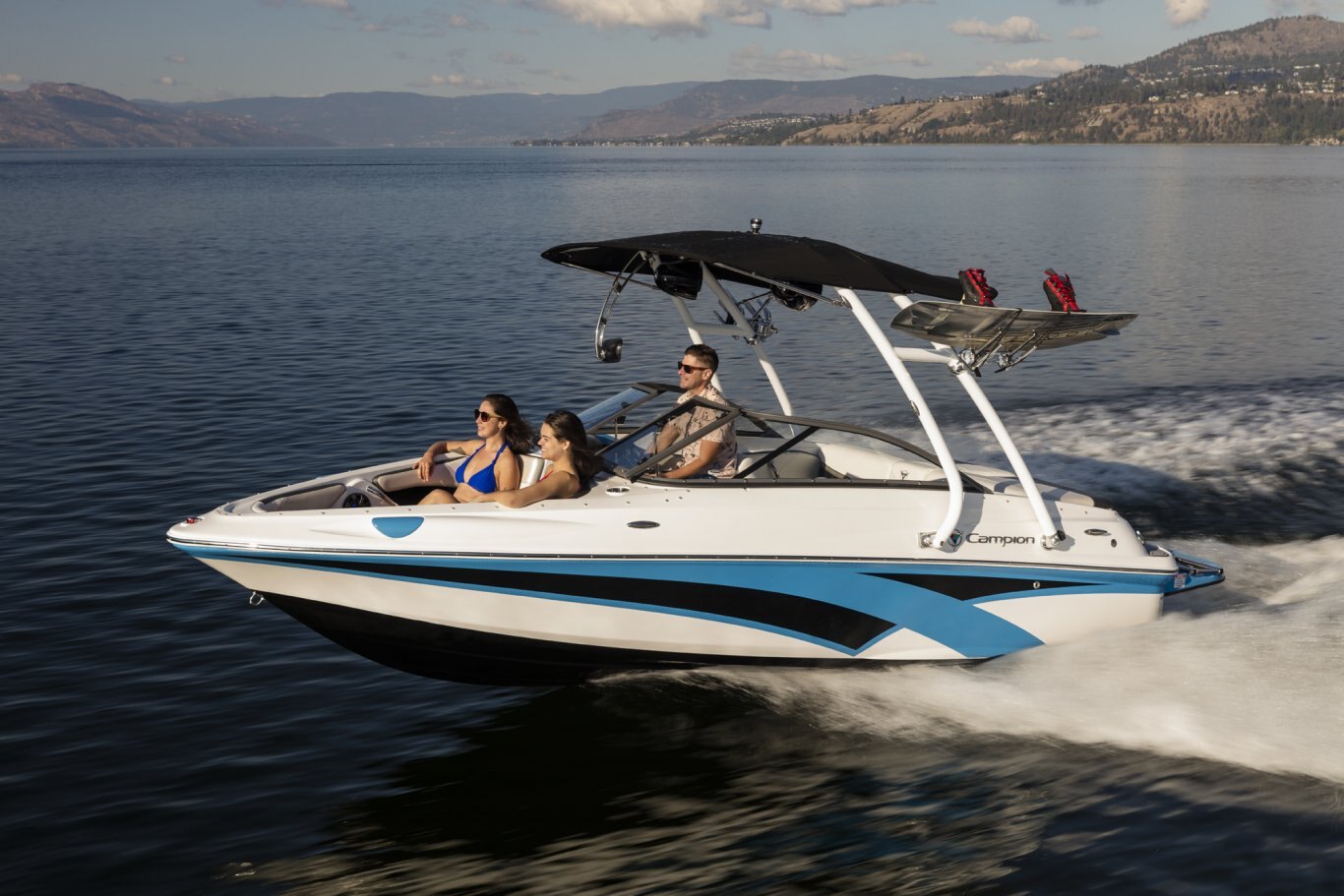 Apex hull Three-dimensional woven fiberglass Fiberglass stringer grid Composite transom Kevlar laminate reinforcement Uni-bond deck joint Wake board tower reinforcement Fiberglass cockpit Color matched extended swim platform with telescoping ladder Integrated LED docking lights Campion Marine Deck Telescoping four-step ladder Watersports Edition custom gel coat Compound curve windshield Ballast system Enviro responsible resin