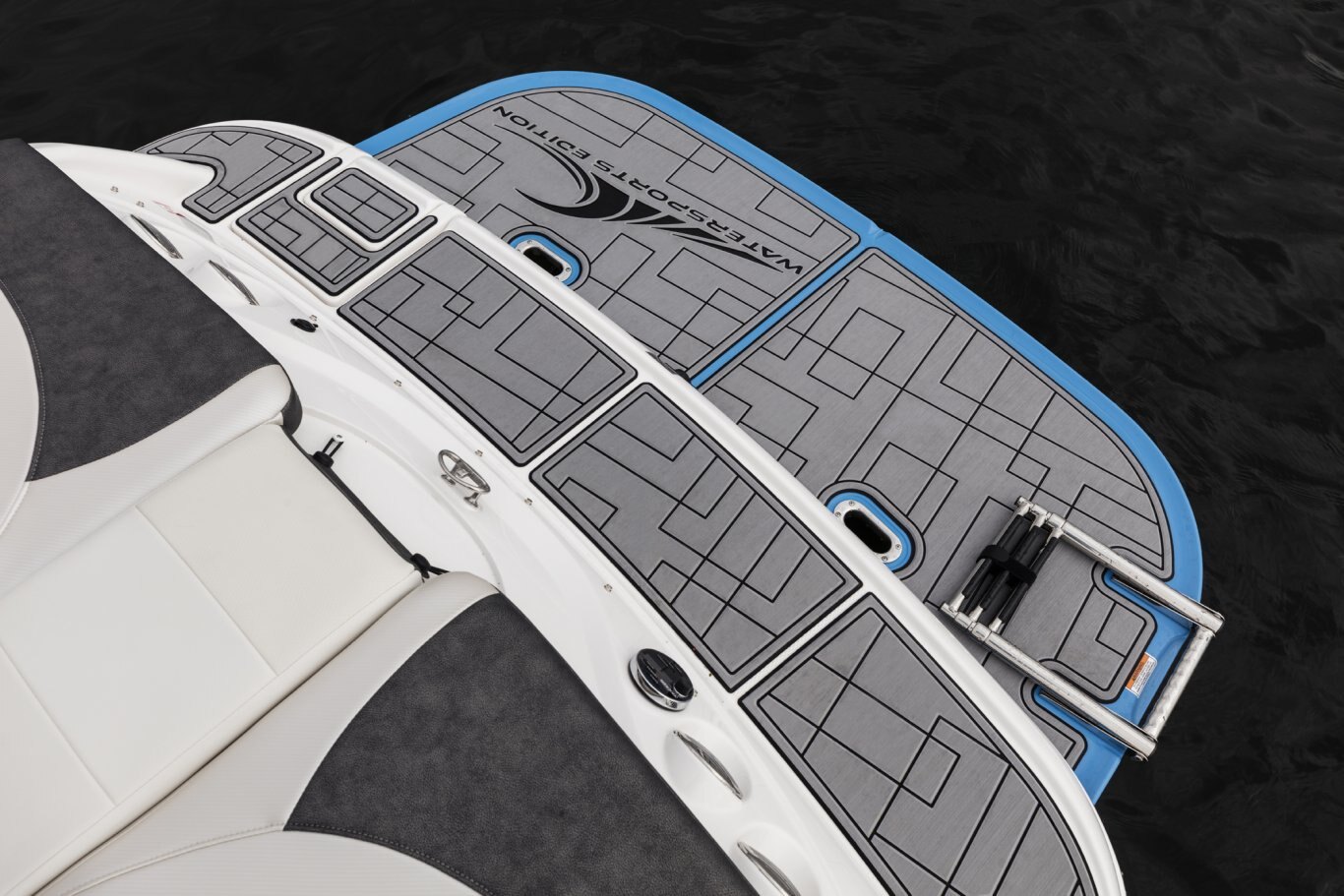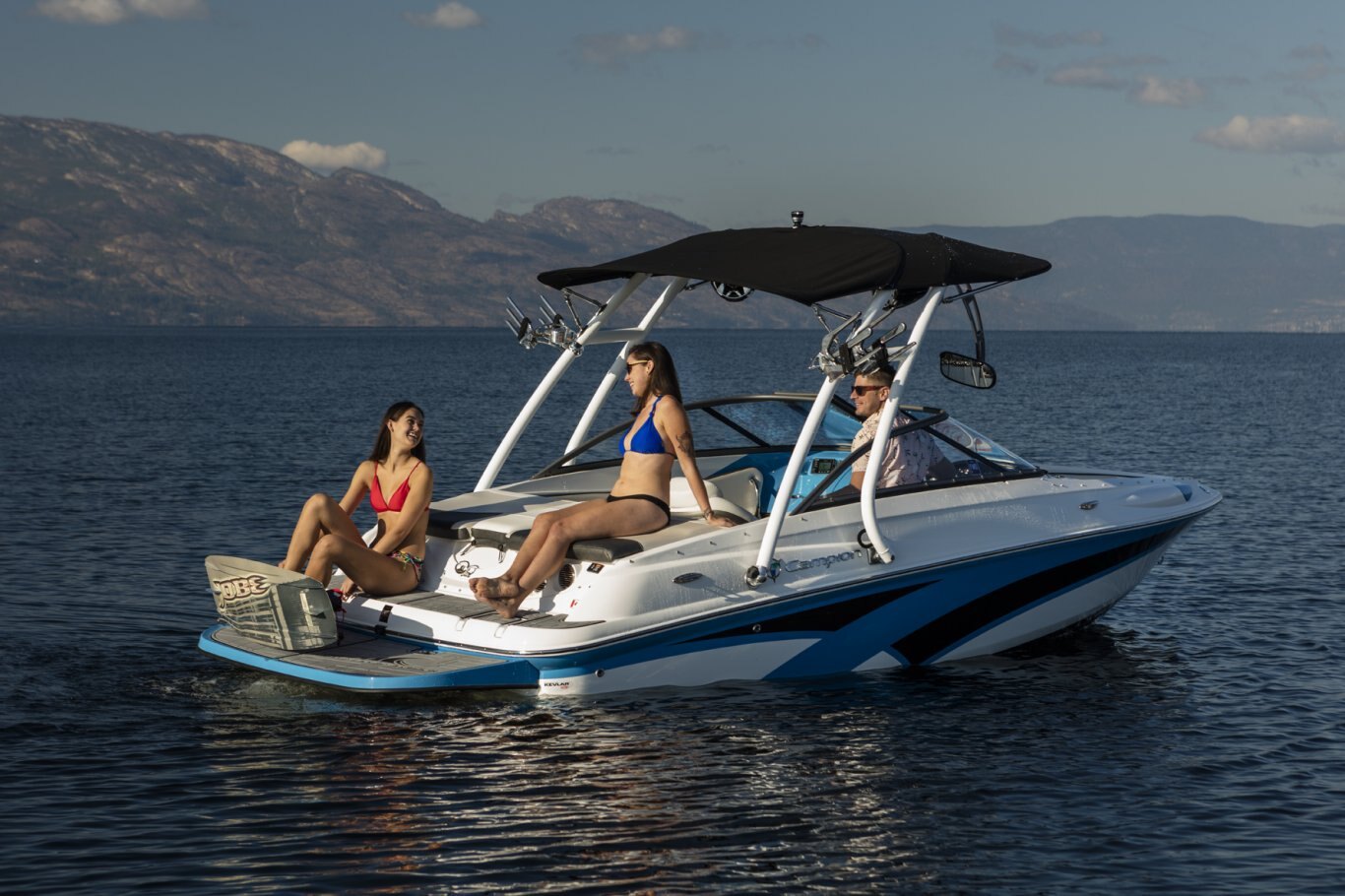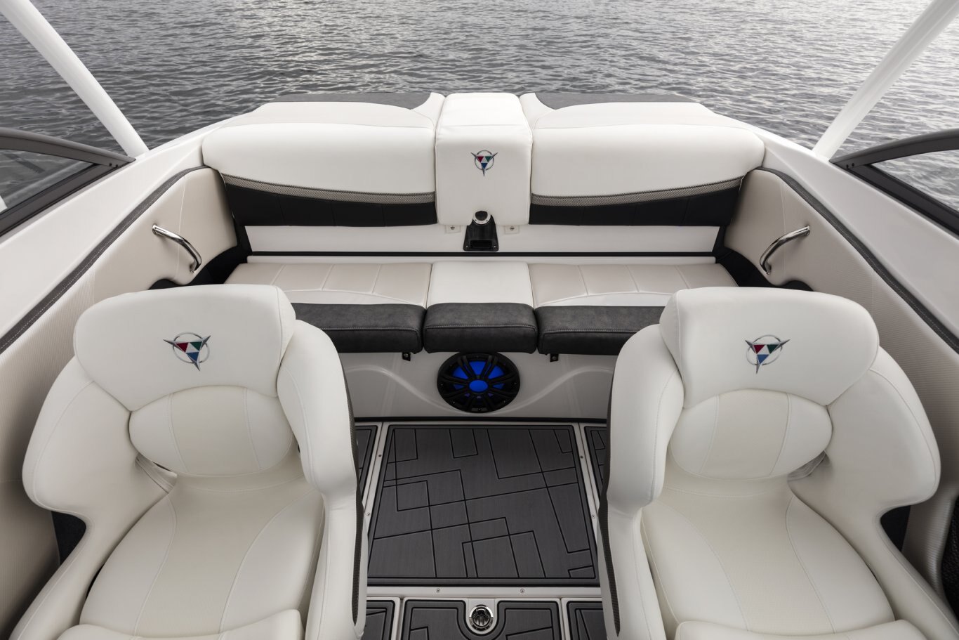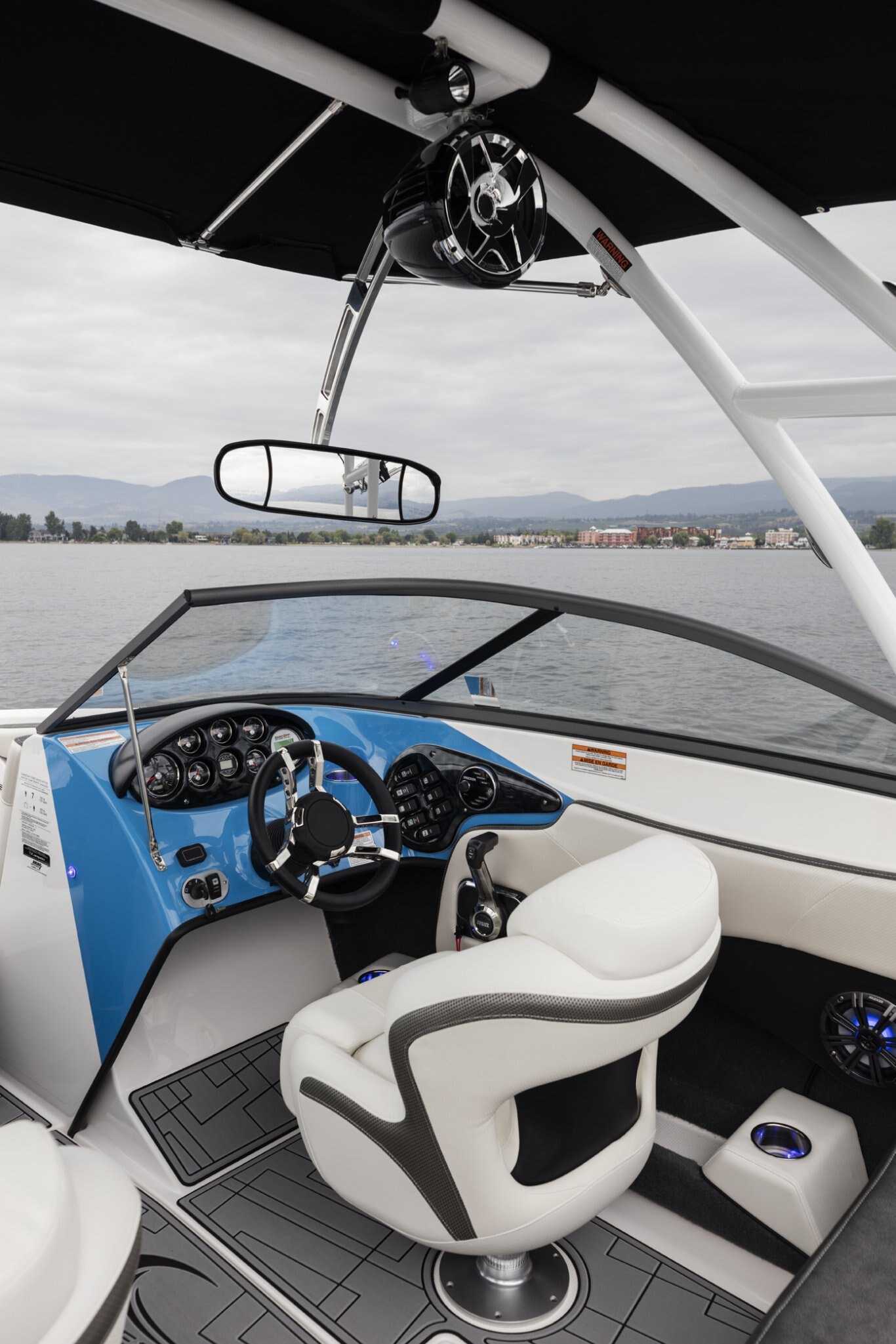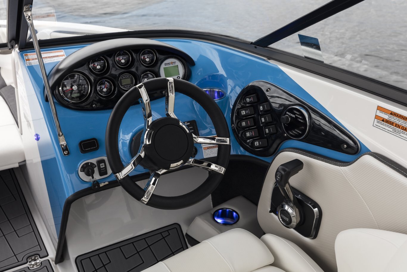 Color coded electrical system w/fused circuit protection Kicker® KMC100 Media Center, AM/FM, Blue- tooth, USB, iPod 4 Kicker® exterior speakers Tilt steering Transom stereo remote Electric horn Powerpoints Automatic bilge pump Full instrumentation Transom tilt switch Zero Off ® Speed Control System (upgrade) Surf Tabs (upgrade) Dual battery switch / second battery tray