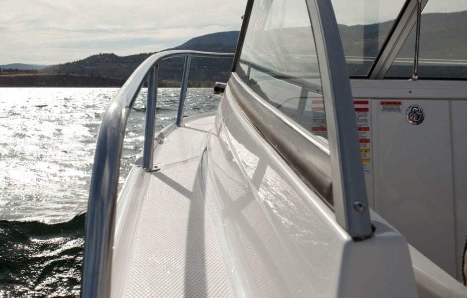 Stainless steel deck hardware Stainless steel bow rails Stainless steel steering wheel Windshield w/stainless steel split handrail Stainless steel rod holders
