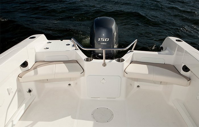 Stainless steel cup holders LED courtesy lighting Gunnel rod storage & side storage Bait tank Built-in tackle box Deck rod holders Swivel bucket seats w/fore & aft slider base Removable jump seat cushions Removable aft seat cushions Black Sunbrella® acrylic bimini top, side curtains, sloper & boot Black Sunbrella® acrylic cockpit cover (over windshield)
