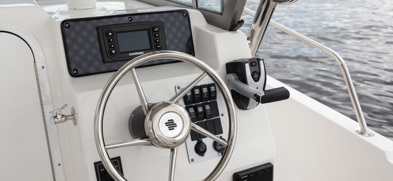 Powerpoint Automatic bilge pump Speedometer, compass, electric horn Fuel gauge Raw water washdown system Heavy-duty articulated wiper (starboard) Hydraulic tilt steering Dual battery switch & second battery Kicker® KMC100 Media Center, AM/FM, Bluetooth, USB, iPod Color-coded electrical system w/fused circuit protection