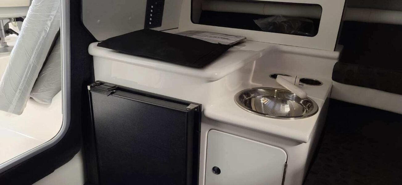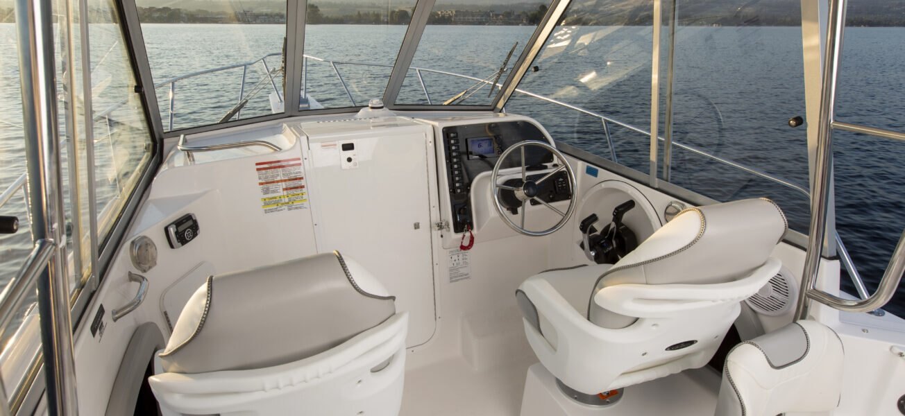Stereo remote (driver side) 2 Interior & 2 exterior speakers Dash light dimmer Powerpoint Automatic bilge pumps (3) Battery tray Speedometer, compass, electric horn Fuel gauge Raw water washdown system Heavy-duty articulated wiper (starboard) Heavy-duty articulated port wiper Galley w/sink, icebox & alcohol stove Trim tabs w/indicators Hydraulic tilt steering 12V Refrigerator exchange Kicker® KMC100 Media Center, AM/FM, Bluetooth, USB, iPod Color-coded electrical system w/fused circuit protection