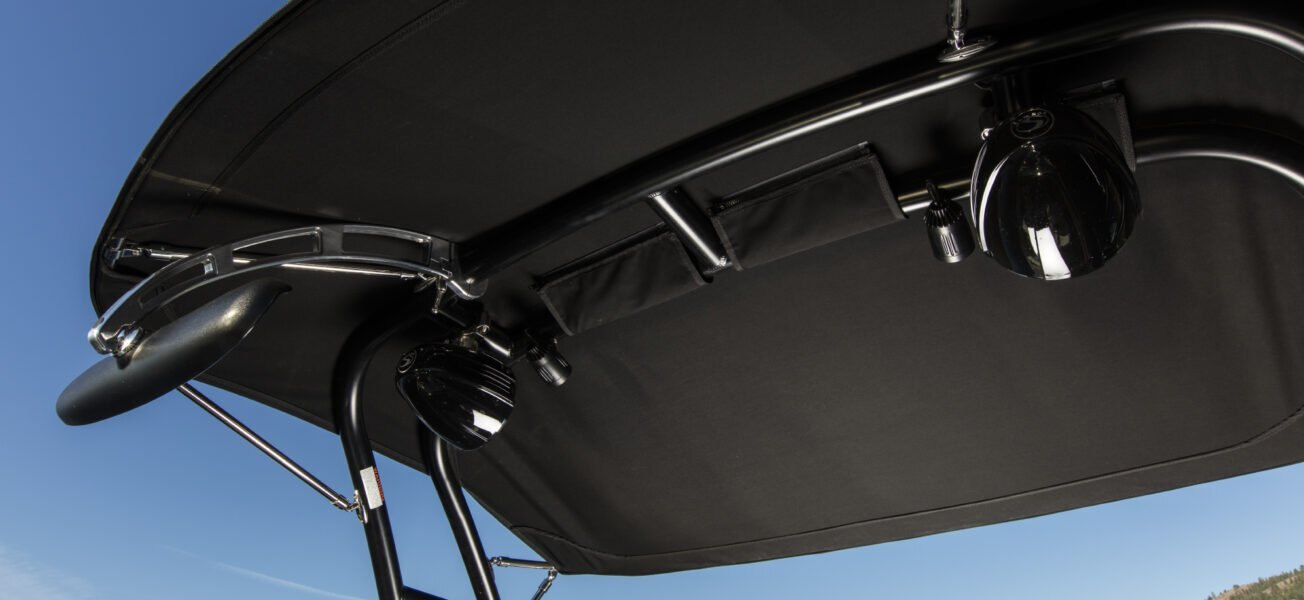 Three-dimensional woven fiberglass Wraparound aft seating w/storage under Integrated LED docking lights Compound curve windshield