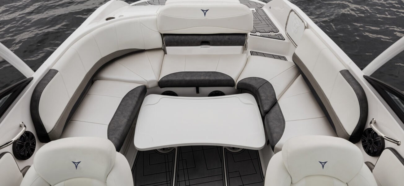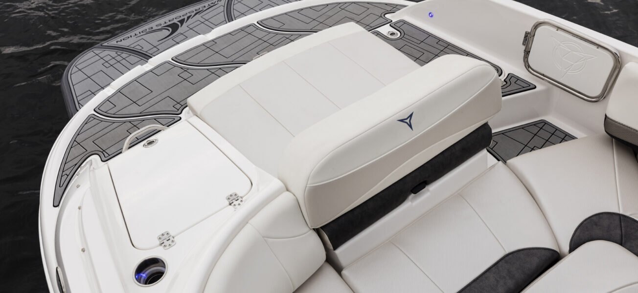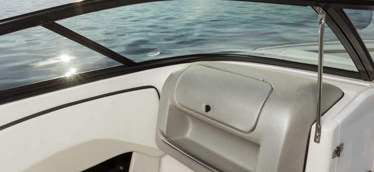 Glove compartment LED courtesy lighting Ski locker Gunnel side storage Aft lounge w/flip backrest Aft bench seat w/storage under Portable cooler Wrap around aft seating w/storage under Walk thu transom Bow seating w/storage under Convertible table w/fill-in cushion Premium leather-wrapped steering wheel In-dash depth sounder Color-coordinated dash LED cupholder & cockpit lighting package Console storage w/access doors Bow filler cushion Black Sunbrella® acrylic bow cover Black Sunbrella® acrylic cockpit cove Campion Marine Flooring through cockpit and swim platform Razor ultra suspension bucket seats w/ starboard & port flip bolsters with fore & aft slider base
