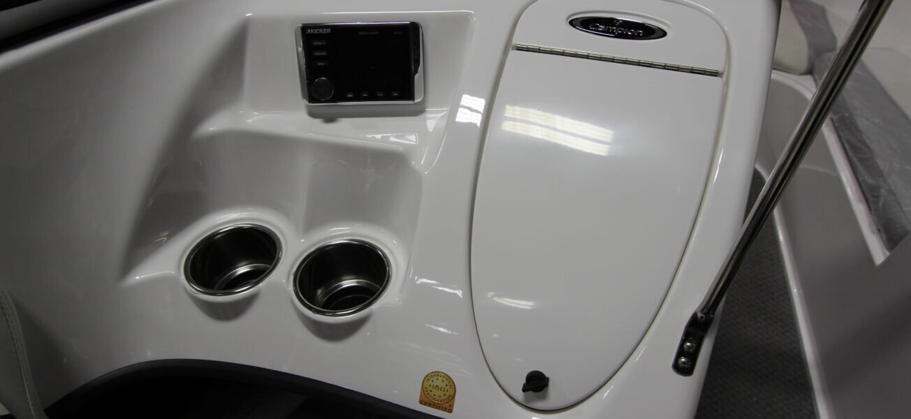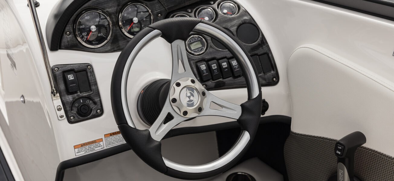 Four Kicker® exterior speakers Electric horn Powerpoint Automatic bilge pump Hydraulic tilt steering In-dash depth sounder Stereo power package -stereo w/amp, subwoofer, stereo remote & dual battery switch Color-coded electrical system w/fused circuit protection Kicker® KMC100 Media Center, AM/FM, Bluetooth, USB, iPod