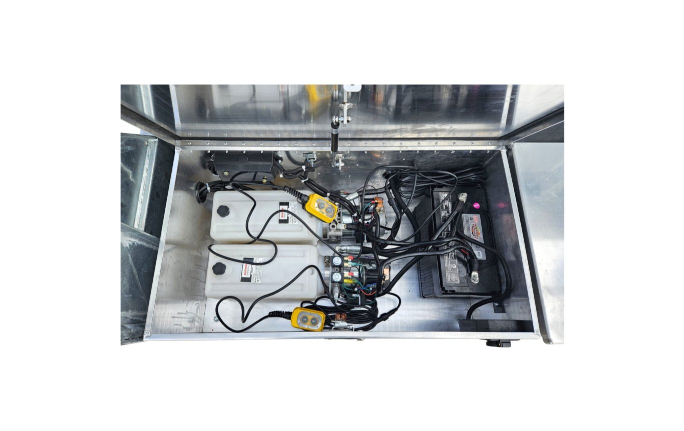 3,000 psi Hydraulic Power Pack 20' Hand Remote and Wireless Remote 5" Hydraulic Cylinder & Scissor Hoist Interstate Extreme Cycle Battery and Plug In Charger Lockable Steel Toolbox