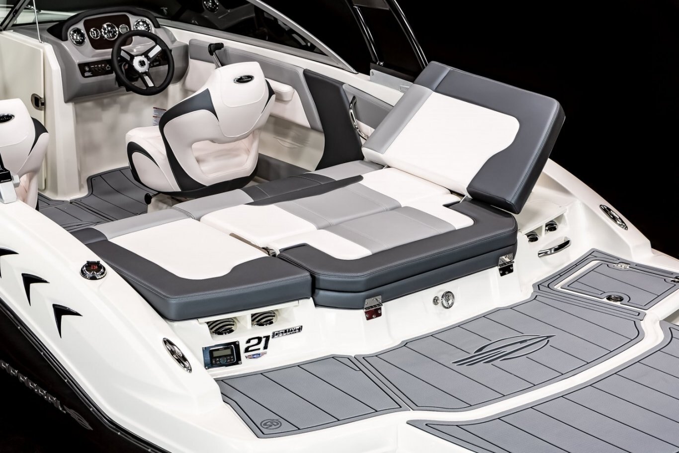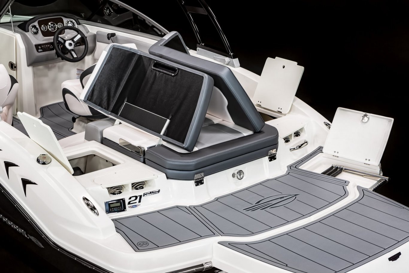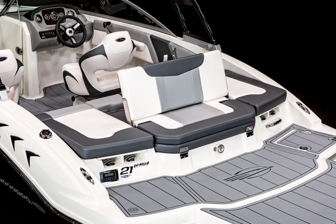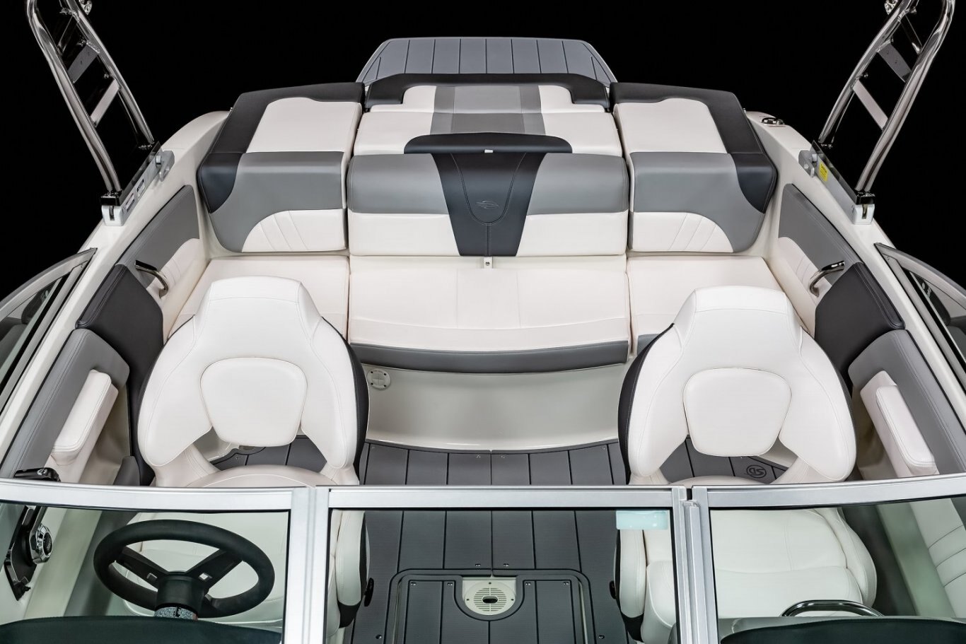 - Cockpit Layout: Two Bucket Seats (Slide and Swivel) with Logo Badging, Rear Bench Seat and Aft Hinged Sundeck with Walk-Thru, Lounge Position and Aft Facing Seat