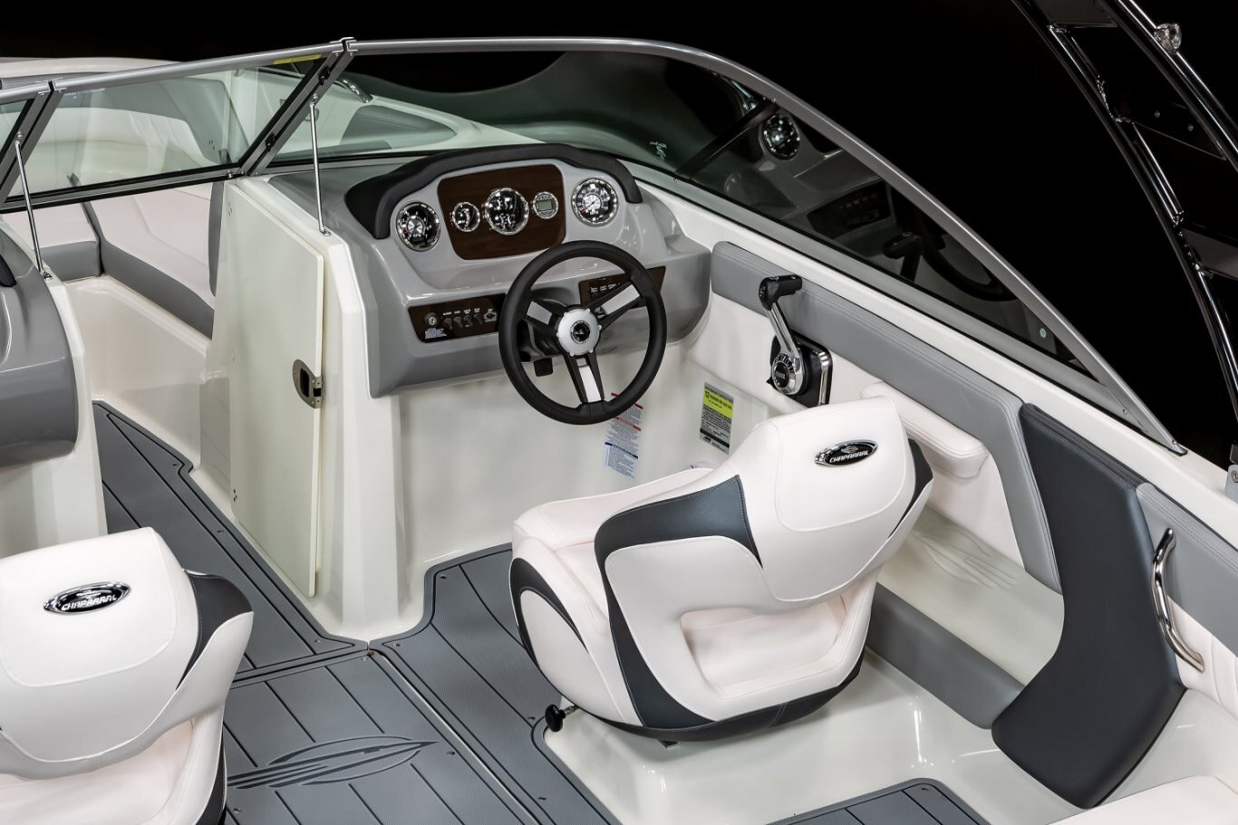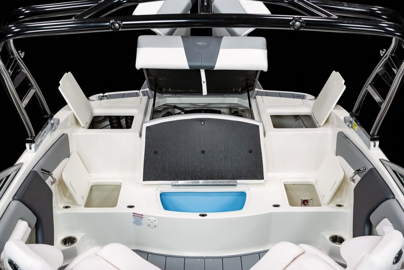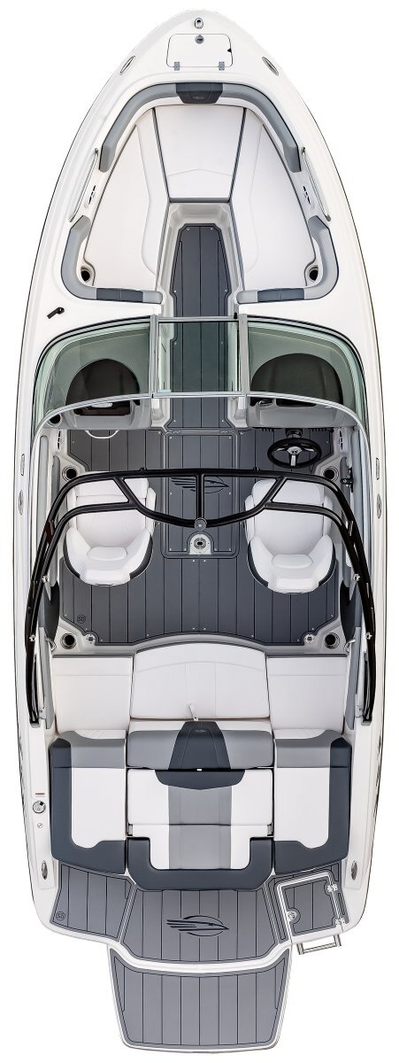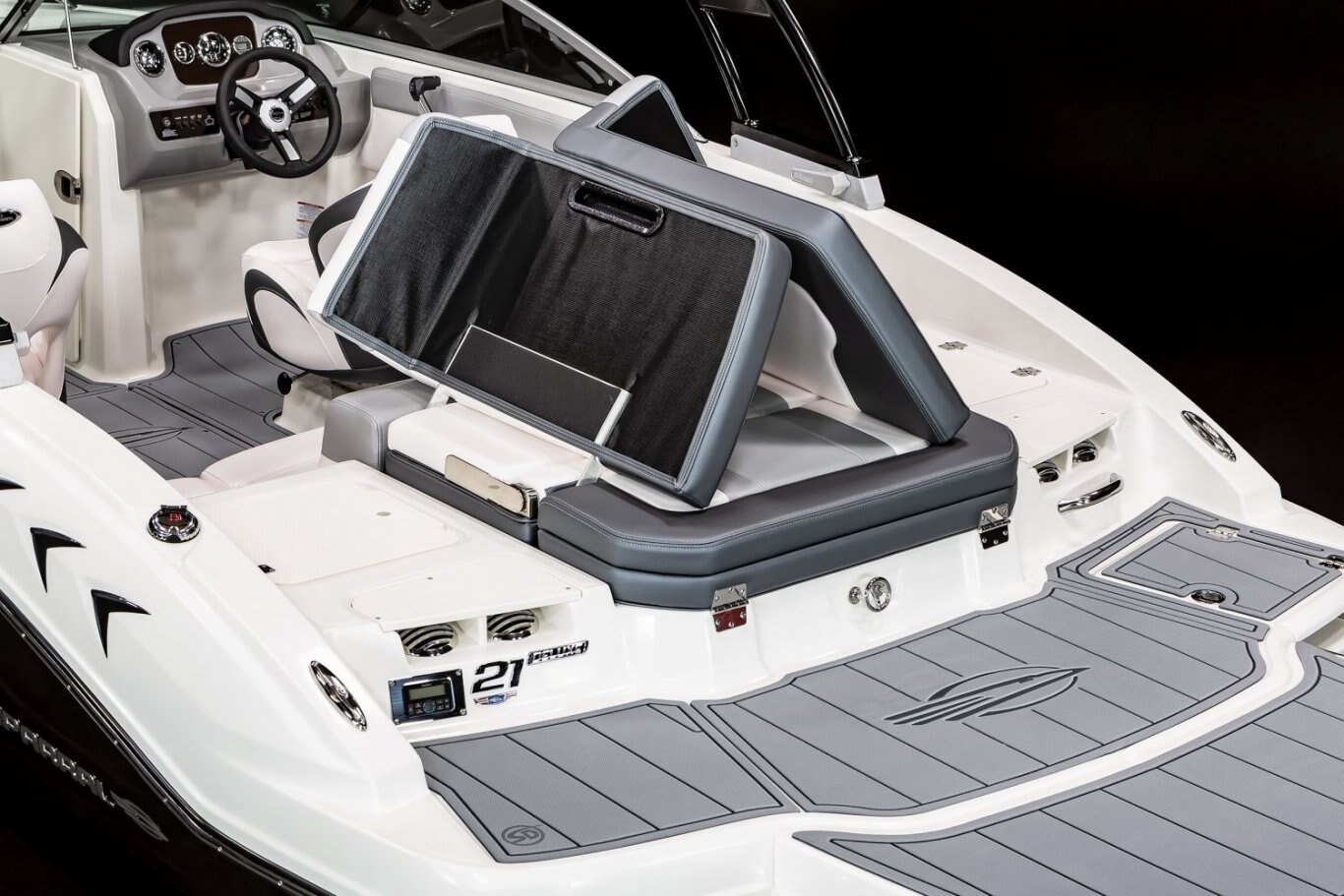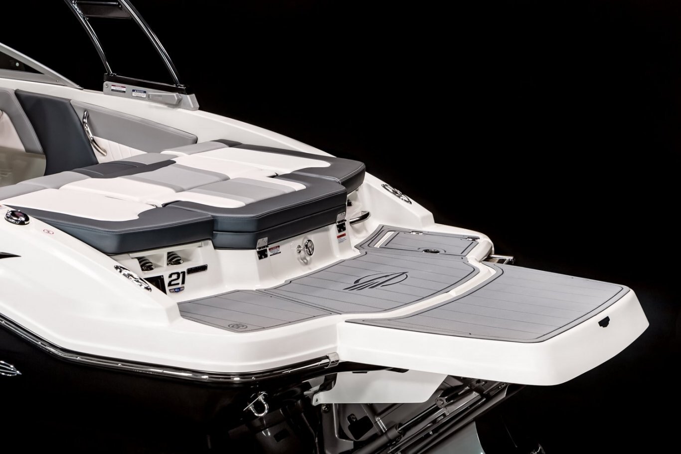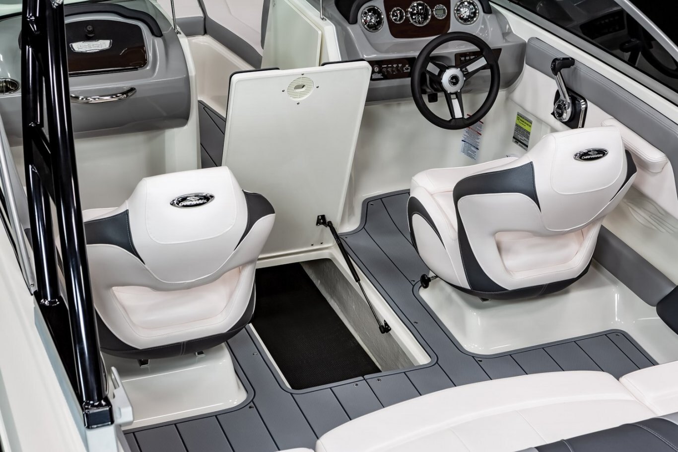 - Cockpit Layout: Two Bucket Seats (Slide and Swivel) with Logo Badging, Rear Bench Seat and Aft Hinged Sundeck with Walk-Thru, Lounge Position and Aft Facing Seat