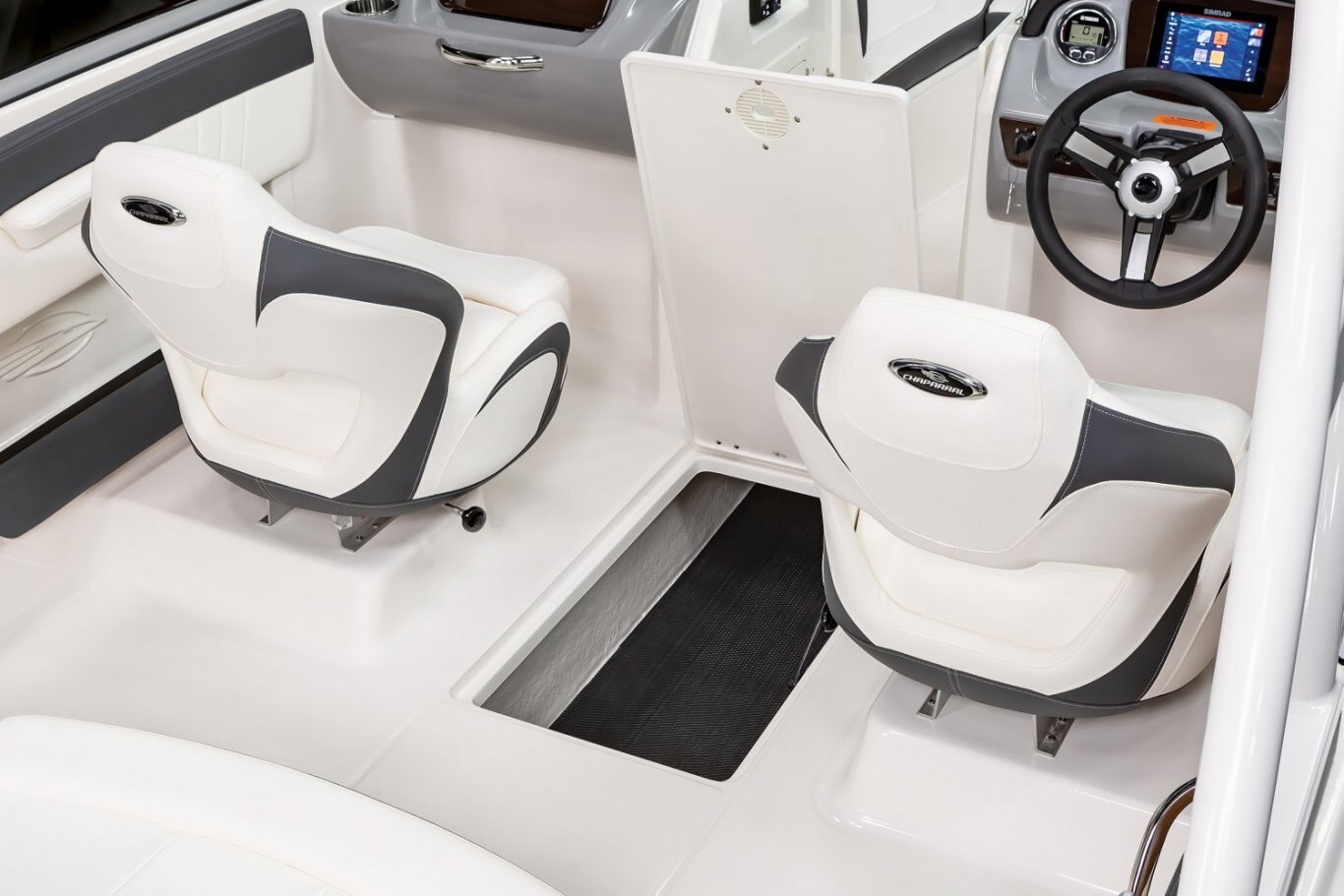 Cockpit Layout: Two Bucket Seats (Slide and Swivel) with Logo Badging and Rear Removable Fishing Seats and Aft Sundeck with Storage Below, Port and Starboard