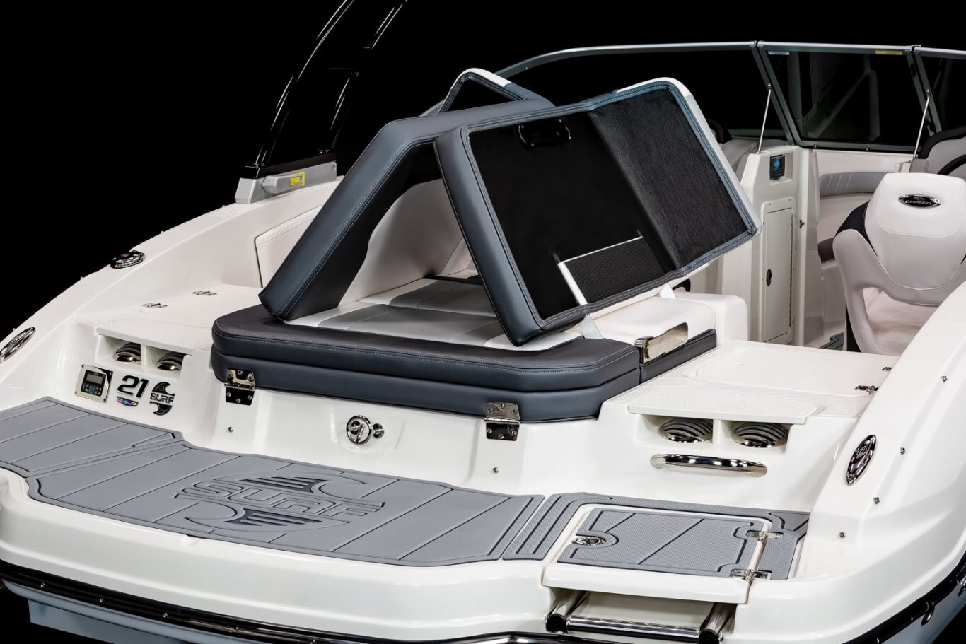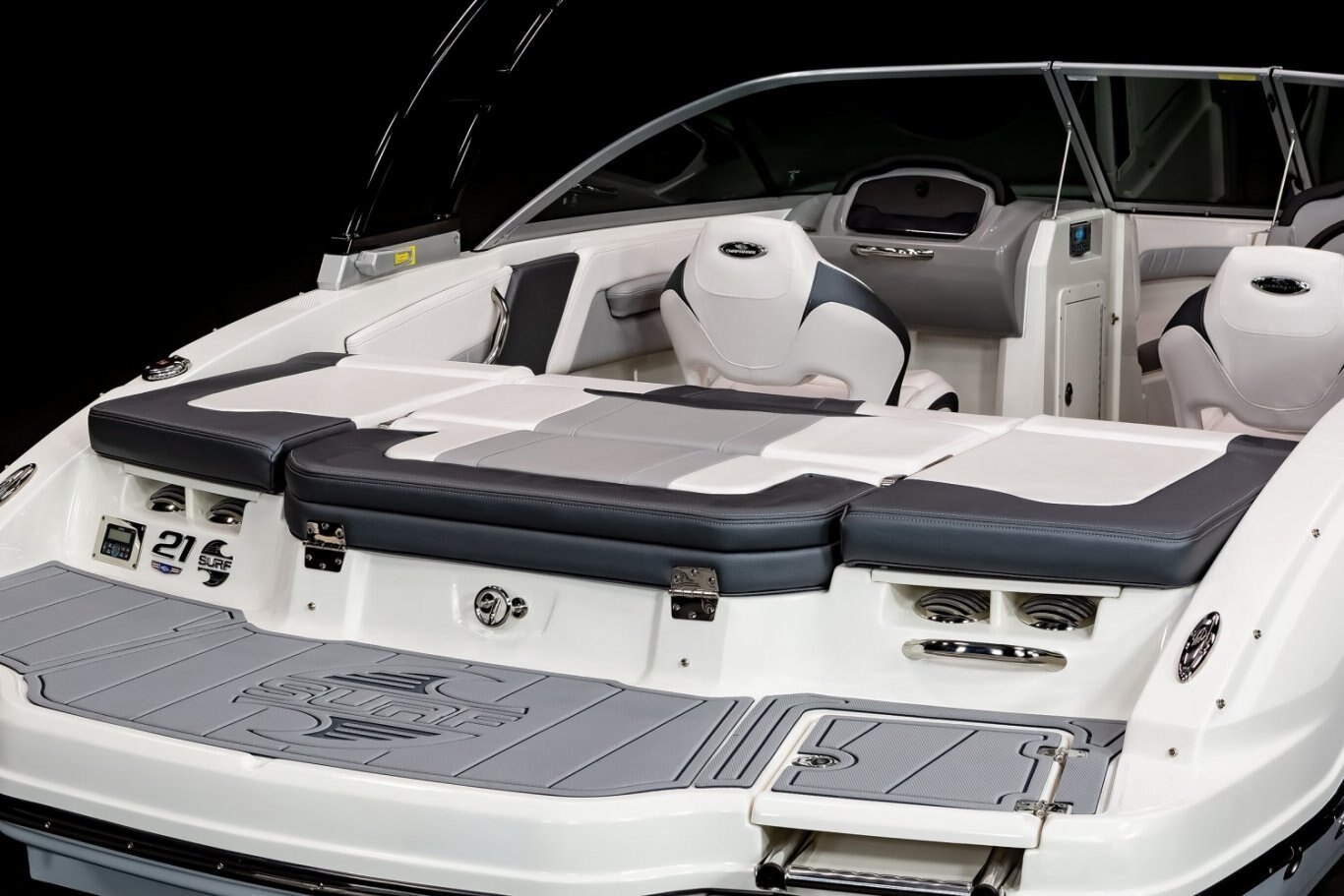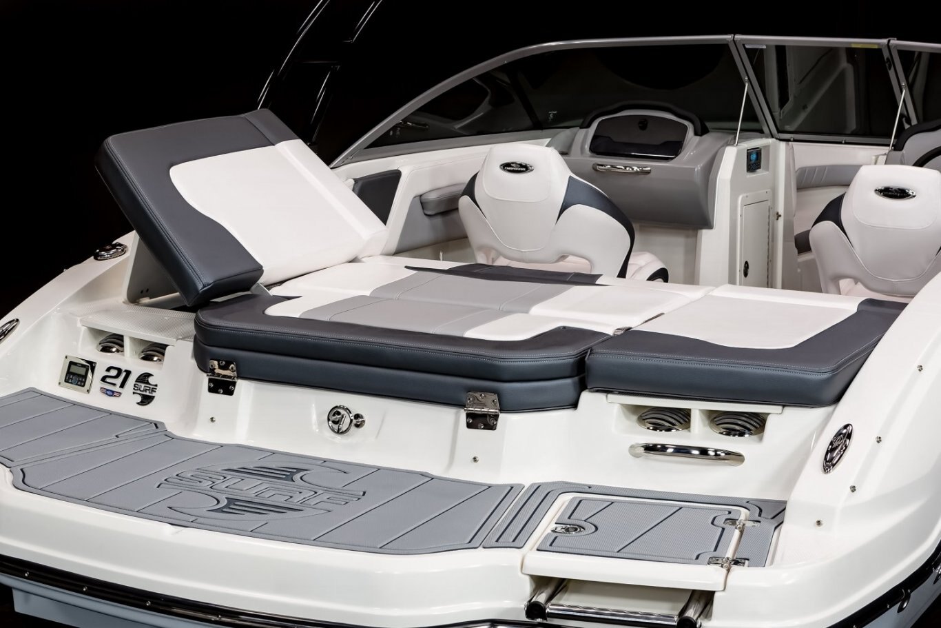 - Cockpit Layout: Two Bucket Seats (Slide and Swivel) with Logo Badging, Rear Bench Seat and Aft Hinged Sundeck with Walkthrough, Lounge Position and Aft Facing Seat