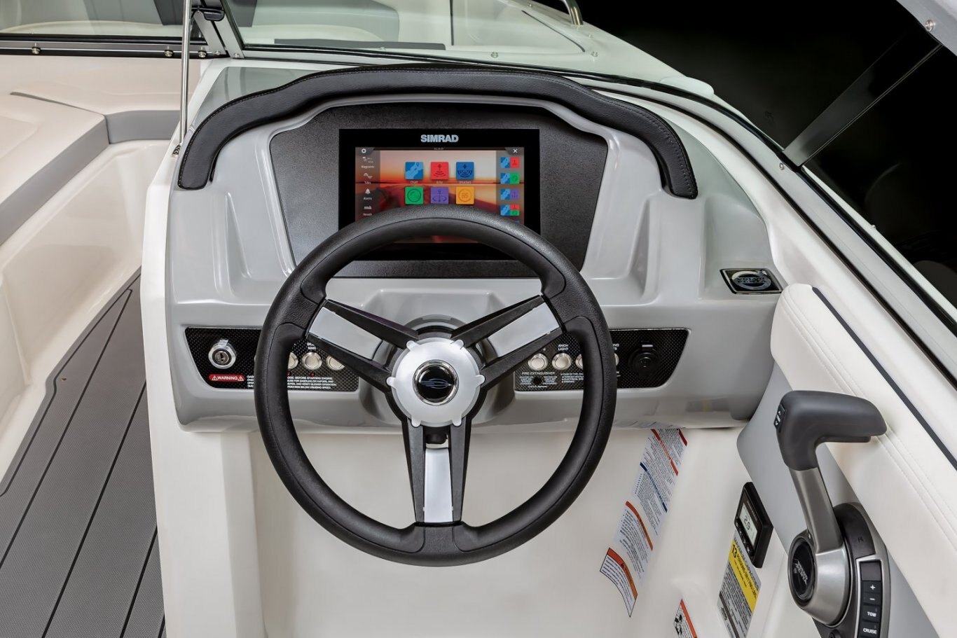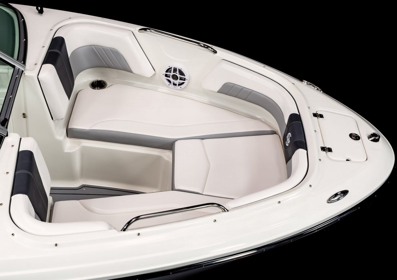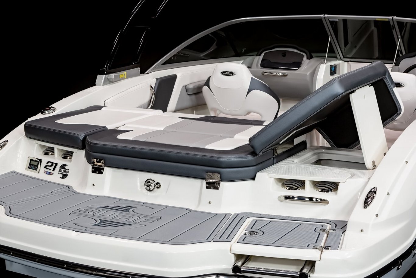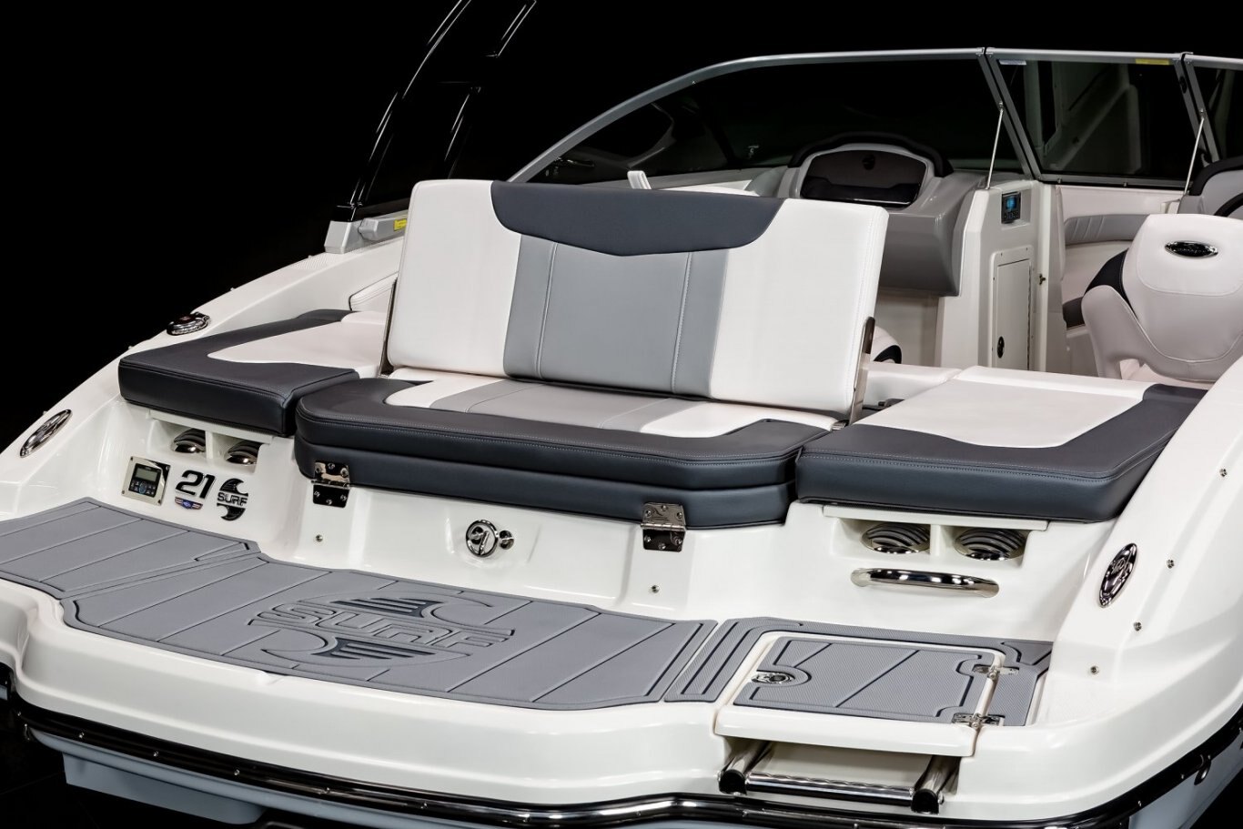 - Cockpit Layout: Two Bucket Seats (Slide and Swivel) with Logo Badging, Rear Bench Seat and Aft Hinged Sundeck with Walkthrough, Lounge Position and Aft Facing Seat