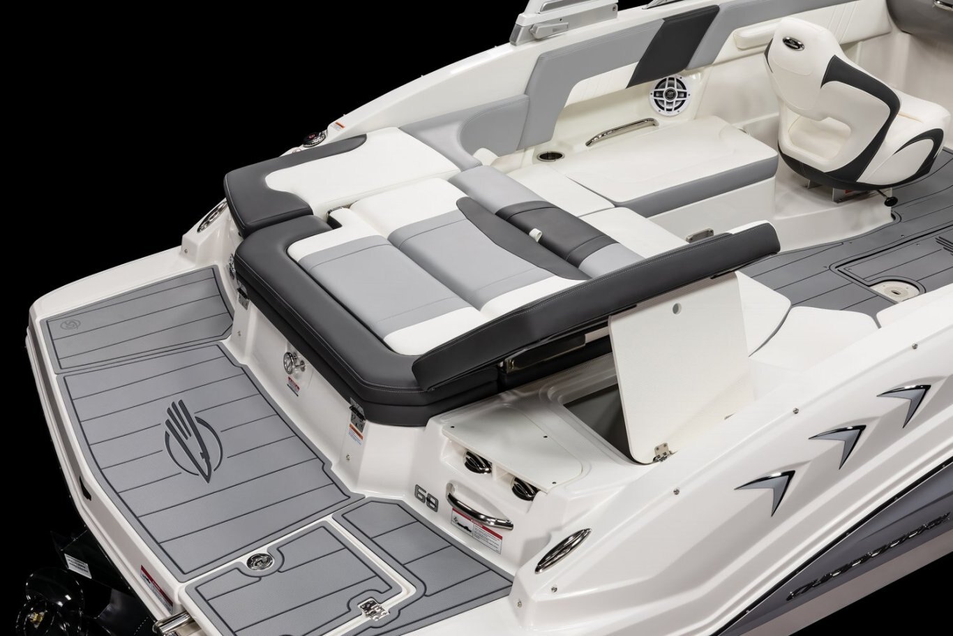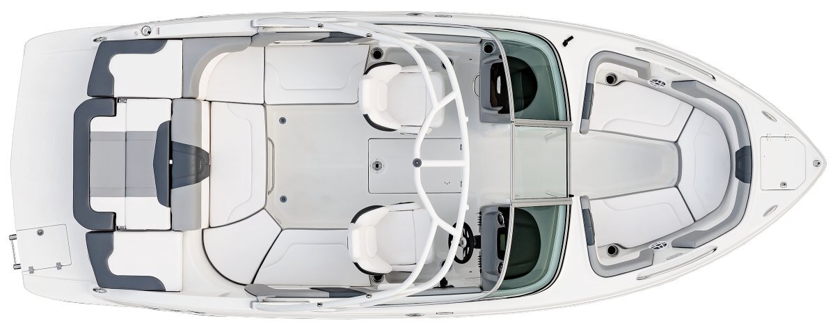 Cockpit Layout: Two Bucket Seats (Slide and Swivel) with Logo Badging, U-Shaped Seating and Aft Hinged Sundeck with Walk-Thru, Lounge Position and Aft Facing Seat