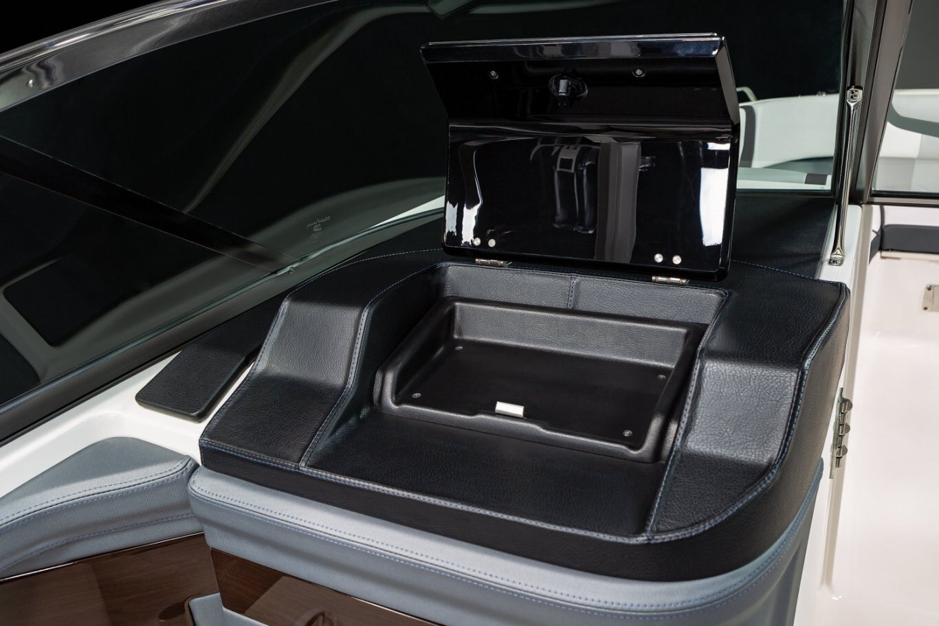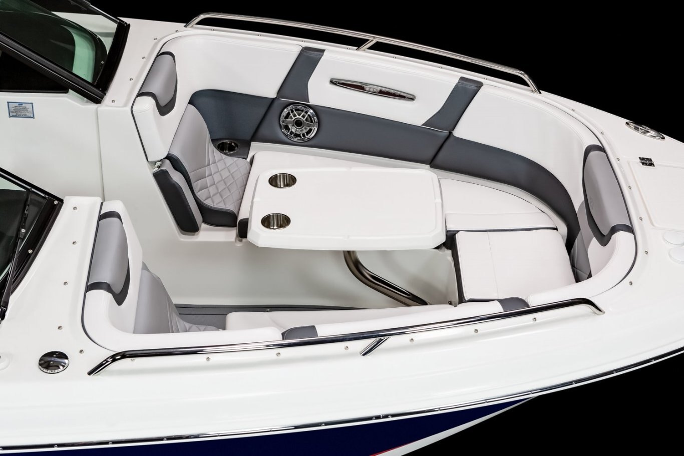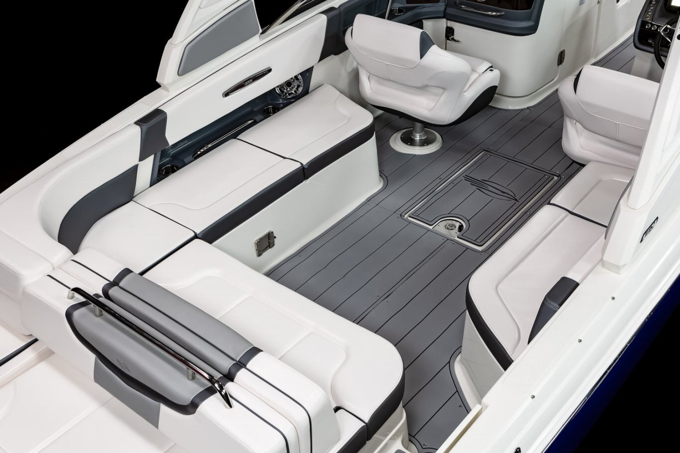 The 307 SSX is a leader in design, performance, and function. The helm features an all-new glass dash with dual touchscreen displays. The cockpit is open, and spacious and features a multi-position sun lounger aft. The 9' beam means the cockpit is wide open all the way to the bow area which features hinged storage beneath luxuriously appointed upholstery. The standard Infinity Power Step swim platform makes watersports setup a breeze. Chaparral went to great lengths to create a powerful and agile craft that glides through the water with minimal noise.