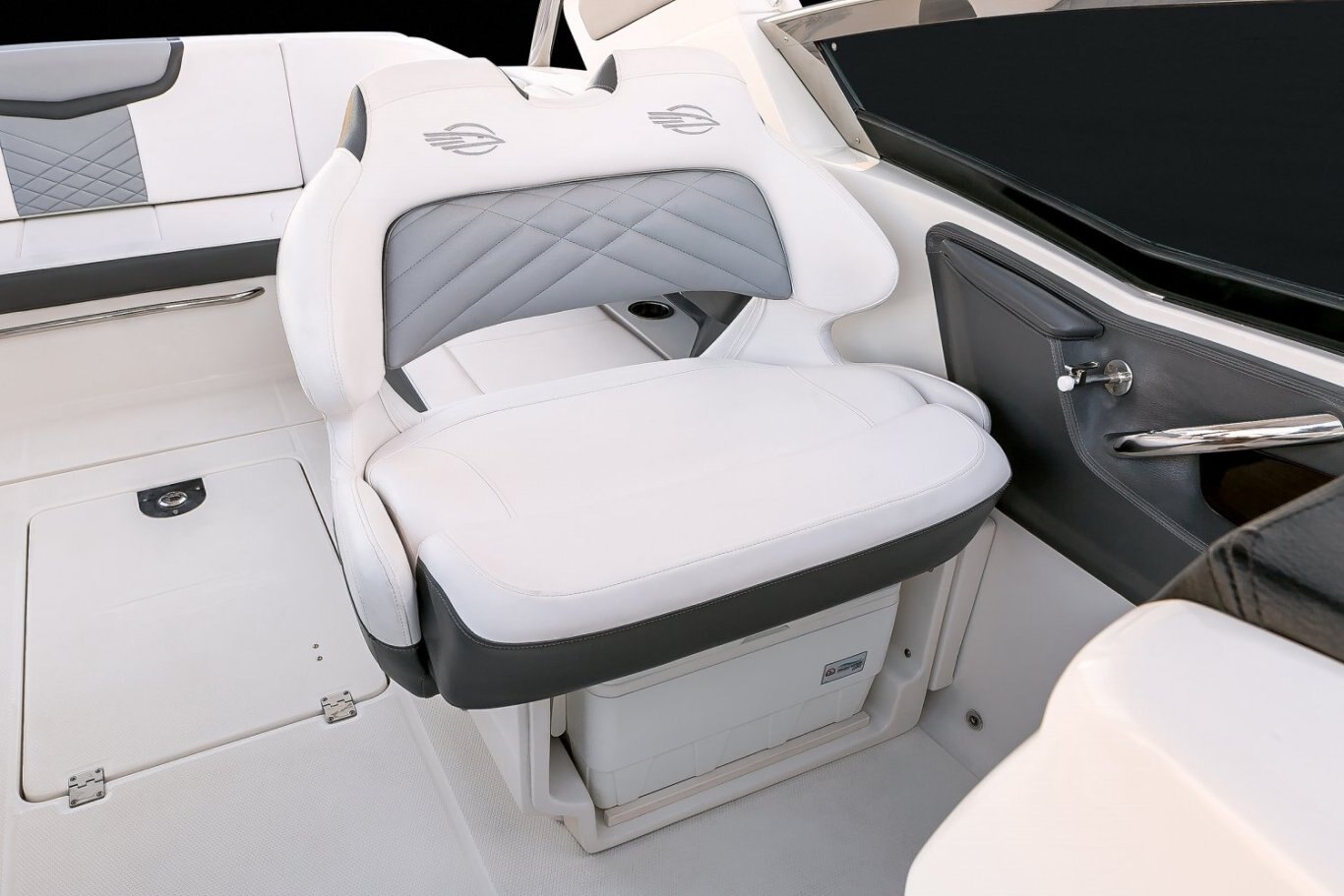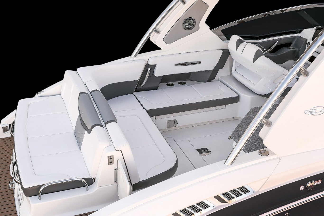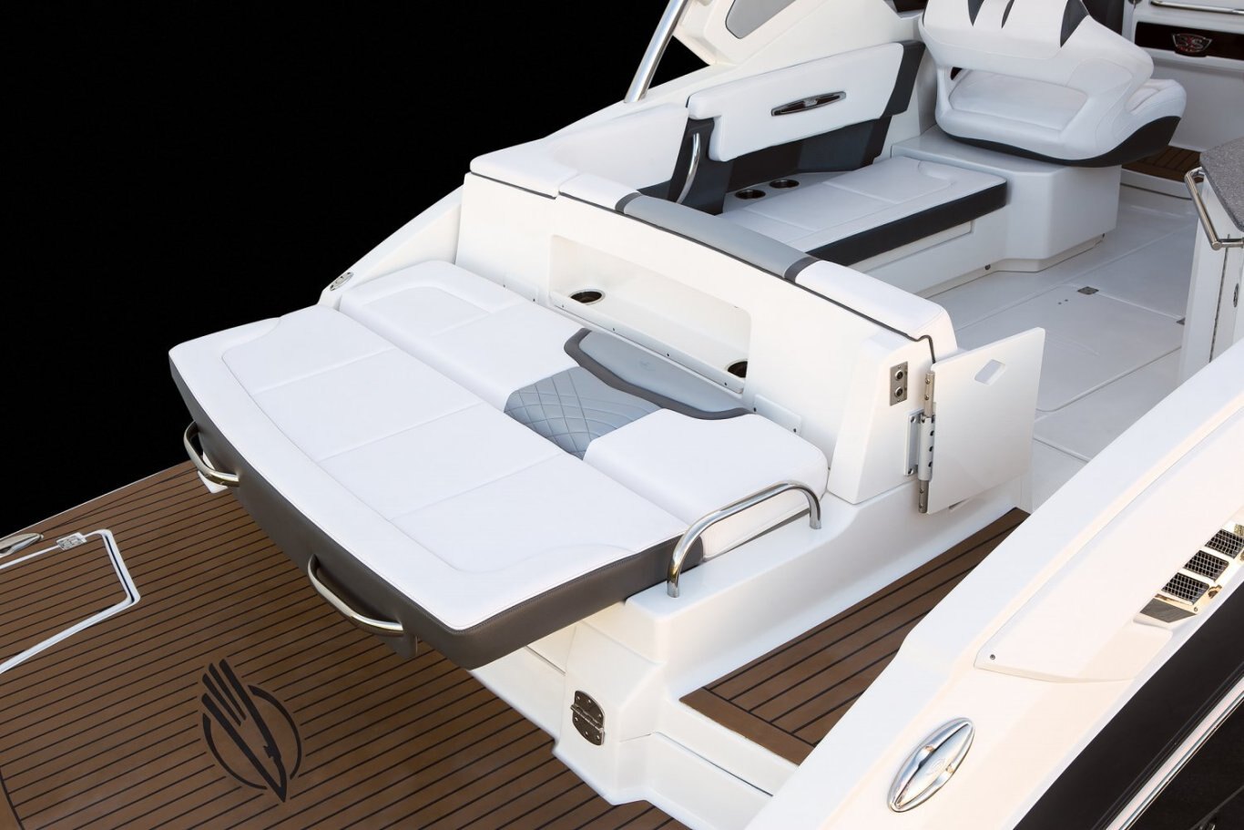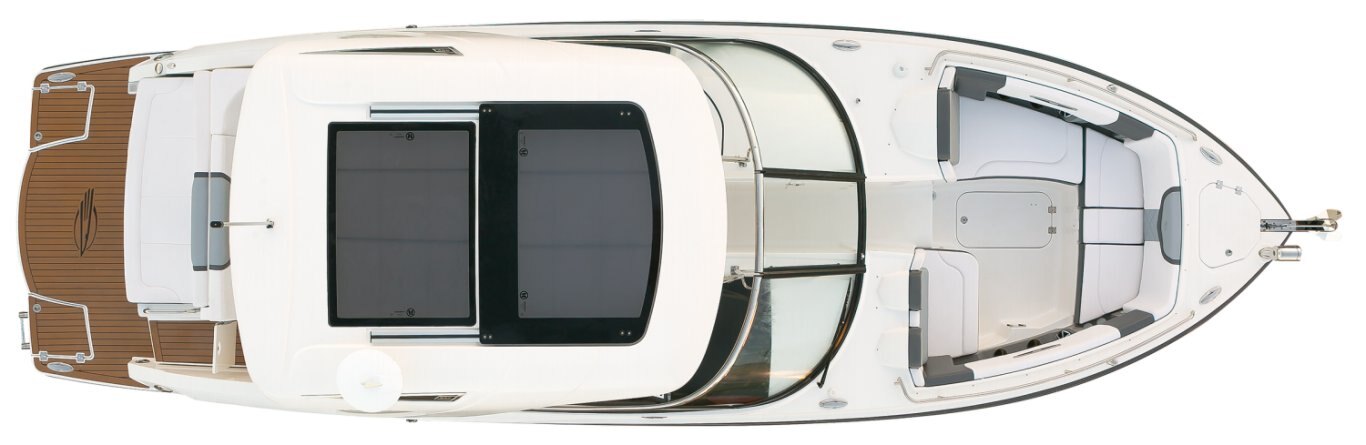 STANDARD FEATURES Aft "Sun Lounge" Seating- Converts from Full Bench Seat to Sunpad Bow Cushion - Hinged with Storage Underneath Bow Floor Storage with Fiberglass Tub Bow Ice Chest (Insulated) Bow Walk-Thru Door Carry On Cooler with Dedicated Storage - 36 Quart Cockpit Drainage System (CDS) with Self Bailing Fiberglass Liner Cockpit Floor Storage - Floor Garage 70 cu.ft. Cockpit LED Lighting Cockpit Table with Dedicated Storage and Side Mount Bases in Cockpit and Bow (Teak Inlay Table Top) Custom Molded Interior - Silicone Fabric Wrapped Fiberglass Side Panels DC Power Plug - 12volt Diamond Pattern Non-Skid Surfaces Double Companion Seat - Port Fixed Double Helm Seat with Exclusive Seat Lever - Forward and Aft Adjustment Electrically Actuated Engine Room Hatch Fiberglass Molded Bowrider Area Hand-Stitched Interior Upholstery Interior Color Packages Include: Dune, Slate or Cayenne Lockable Glove Box Door Molded In Footrest Premium Stain Resistant Silicone Cockpit Fabric Premium Stereo System: AM/FM Bluetooth, NMEA Interface, Remote Control Displays (2), Cabin Speakers (2), Cockpit Speakers (6), and Sub-Woofer Powered by 8 Channel Amp Recessed Transom Door Sirius Satellite Tuner & Antenna Stainless Steel Bow Rails Stainless Steel Cockpit Grab Handles Stainless Steel Drink Holders (15) Stainless Steel Transom Shower Starboard Cockpit Jump Seat with Storage Below StarLite Seat Bases with Flow Foam Stereo Remotes - Located at Helm and Transom Teak on Swimplatform (Silver or Natural) (Natural required on Black Edition or Cayenne Interior Package) U-Shaped Port Aft Lounge Seating with Storage Below Water Resistant Speakers (6) with Blue LED Lighting Wrap Around Stainless Steel Windshield with Custom Supports