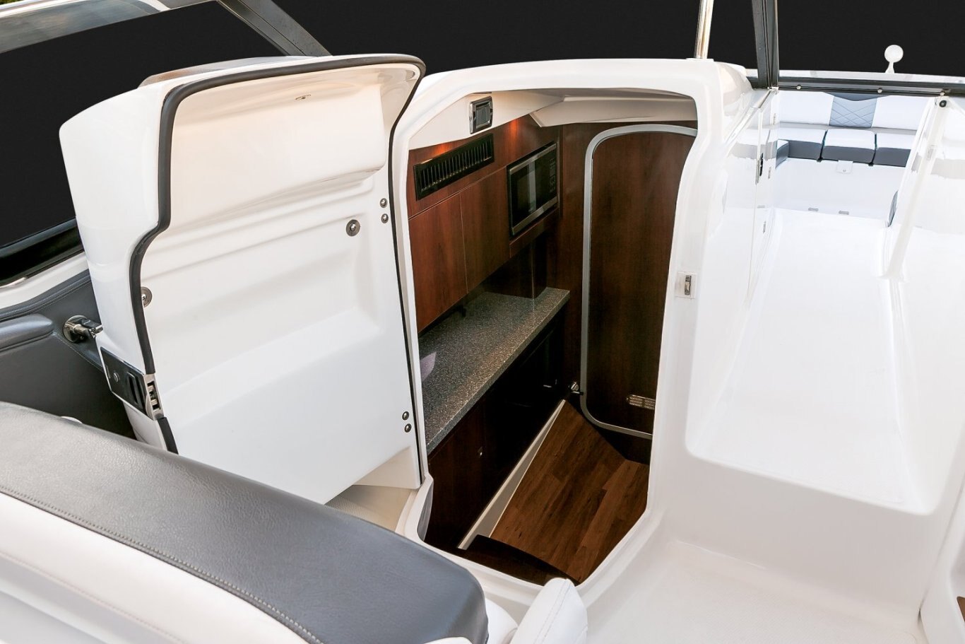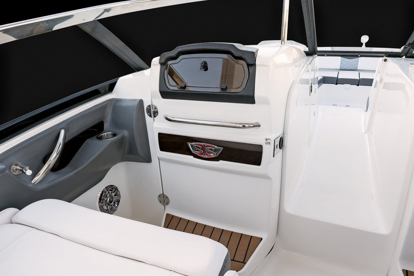 The award-winning 347 SSX offers the most demanding of boaters the best of both worlds with a supersized bowrider layout and a full-beam enclosed cabin. We've never built a boat more versatile or impressive than the 347 SSX. Massive seating capacity. Luxury appointments. Clever features. Go anywhere performance. But the real magic of Chaparral innovation happens when you open the port side entry door and discover a space-defying lavish full-beam cabin. While most rivals at this length settle for a split beam design where neither area satisfies, the 347's unified cabin comes complete with an entertainment console, enclosed head, and overnight accommodations for two.