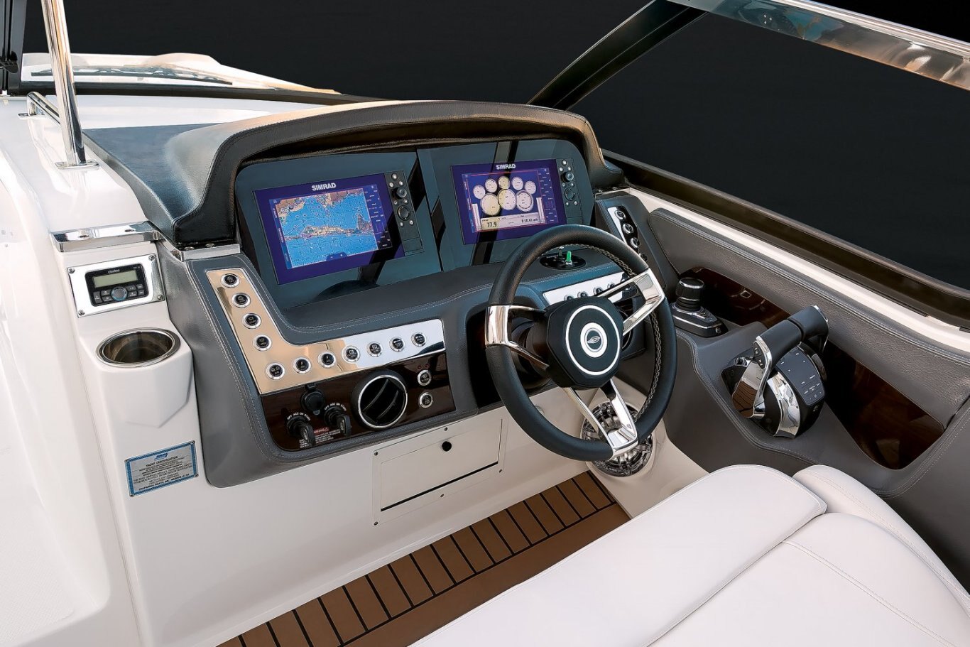 STANDARD FEATURES Aluminum and Stainless Dash Panels Binnacle Mount Throttle and Shifter Control Custom Hand Wrapped Helm Consoles with Hand Stitched Upholstery Visor Custom Leather Steering Wheel with Protective Cover Electrical Connectors Triple O-Ring Sealed and Watertight Emergency Shutdown Lanyard Grounding Bars - Engine and Dash Loom Wrapped Wiring Power Assisted Steering with Tilt Wheel Stainless LED Electronic Push Button Switches Twin Simrad NSS9 EVO3S Chartplotter/Multifunction Display ( Includes: 9" Color Multi-touch Displays with Chartplotter, GPS, Wifi, Insight Charts Inland and Costal, SS60 Transducer, Engine Data and Audio Control) Water Resistant Breakers Located at the Dash in Custom Enclosure Windshield Wiper 2 Speed