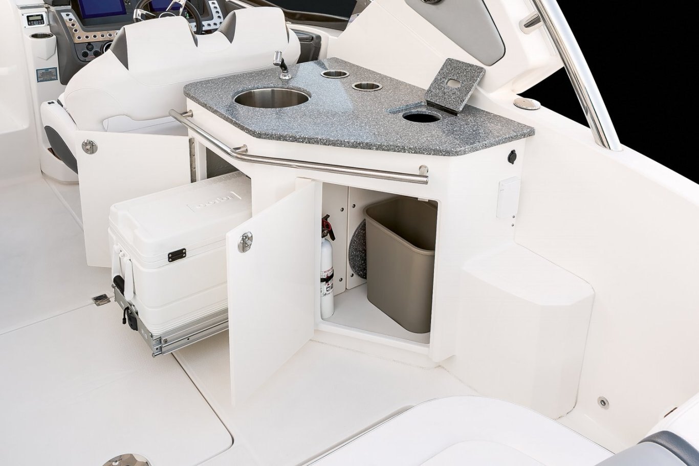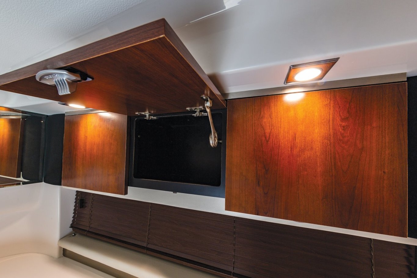 STANDARD FEATURES Enclosed Fiberglass Head Compartment Molded Fiberglass Head Door Opening Portlight with Screen Overhead LED Lighting Porta-Pottie Upper Storage Cabinet Vanity Cabinet with Solid Surface Countertop, Stainless Steel Sink and Faucet Wood Flooring