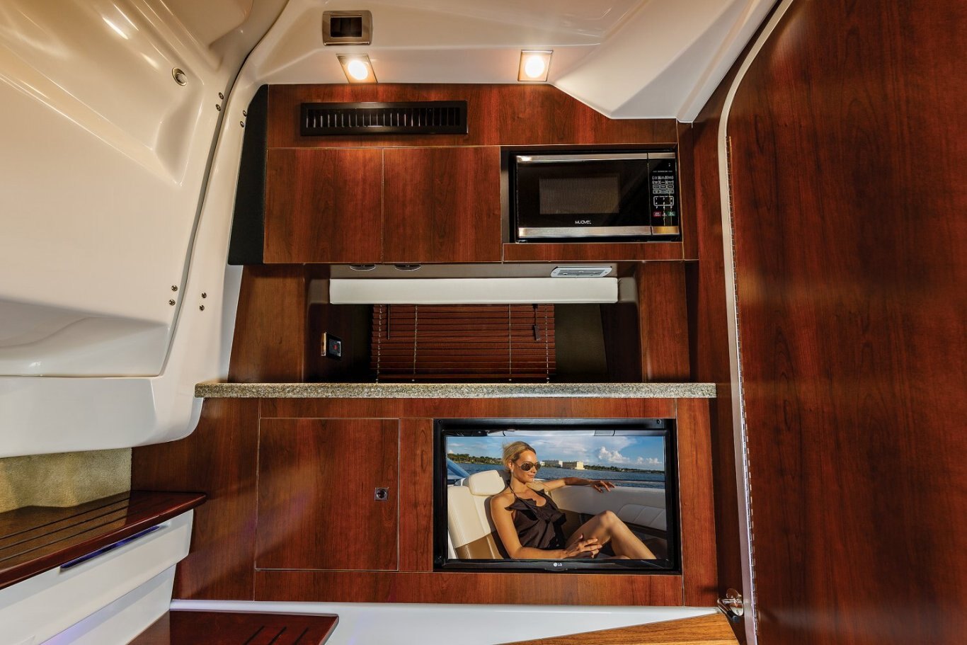 STANDARD FEATURES Cabin 24" LED HD Flat Screen with Remote, Hardtop Antenna and TV Coax to Dockside (120v 60 cycle or 220v 50 cycle) Cabin Overhead and Indirect Lighting - 12 volt Carbon Monoxide Detector Color Coordinated Cabin Silicone Fabric Color Coordinated Solid Surface Countertop Fiberglass Floor and Ceiling Liner Galley Base Cabinet with Storage GFCi 110 Volt Receptacle Gunnel Storage Cabinet Hanging Locker - Cedar Lined with Light L-Shaped Couch - Converts to Full Berth Lockable Fiberglass Cabin Entryway Door w/Glovebox Main Distribution AC/DC Electrical Panels Opening Cabin Portlights (3) with Screens Patented Design allows for Full Beam Cabin Layout Stainless Steel Microwave - 120 Volt Trash Receptacle