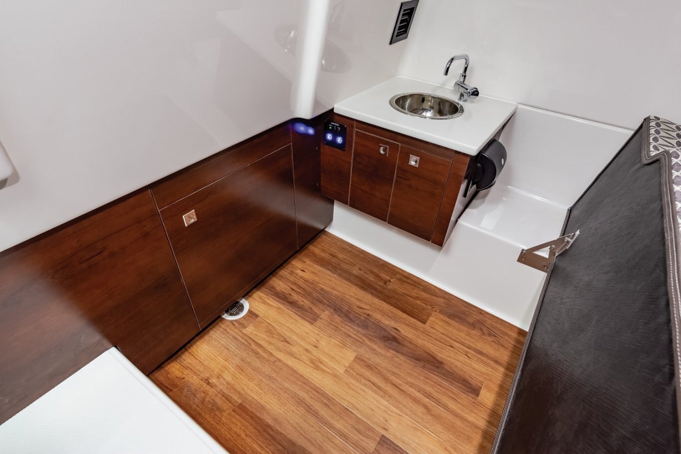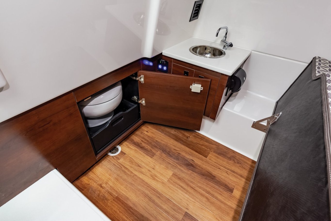 STANDARD FEATURES Cabin Overhead LED Lighting Carbon Monoxide and Smoke Detector Color Coordinated Cabin Fabrics with Scotchgard Protectant Electric Toilet on Hide-Away Slide System Forward Berth with Memory Foam Mattress Forward Bilge Pump with Float Switch Full Fiberglass Cabin and Head Compartment Lockable Opaque Sliding Cabin Entry Door Opening Portlights with Screen Side Storage Cabinet with Solid Surface Countertop Teak Flooring in Cabin Compartment Vanity Cabinet with Solid Surface Countertop, Stainless Steel Sink and Faucet