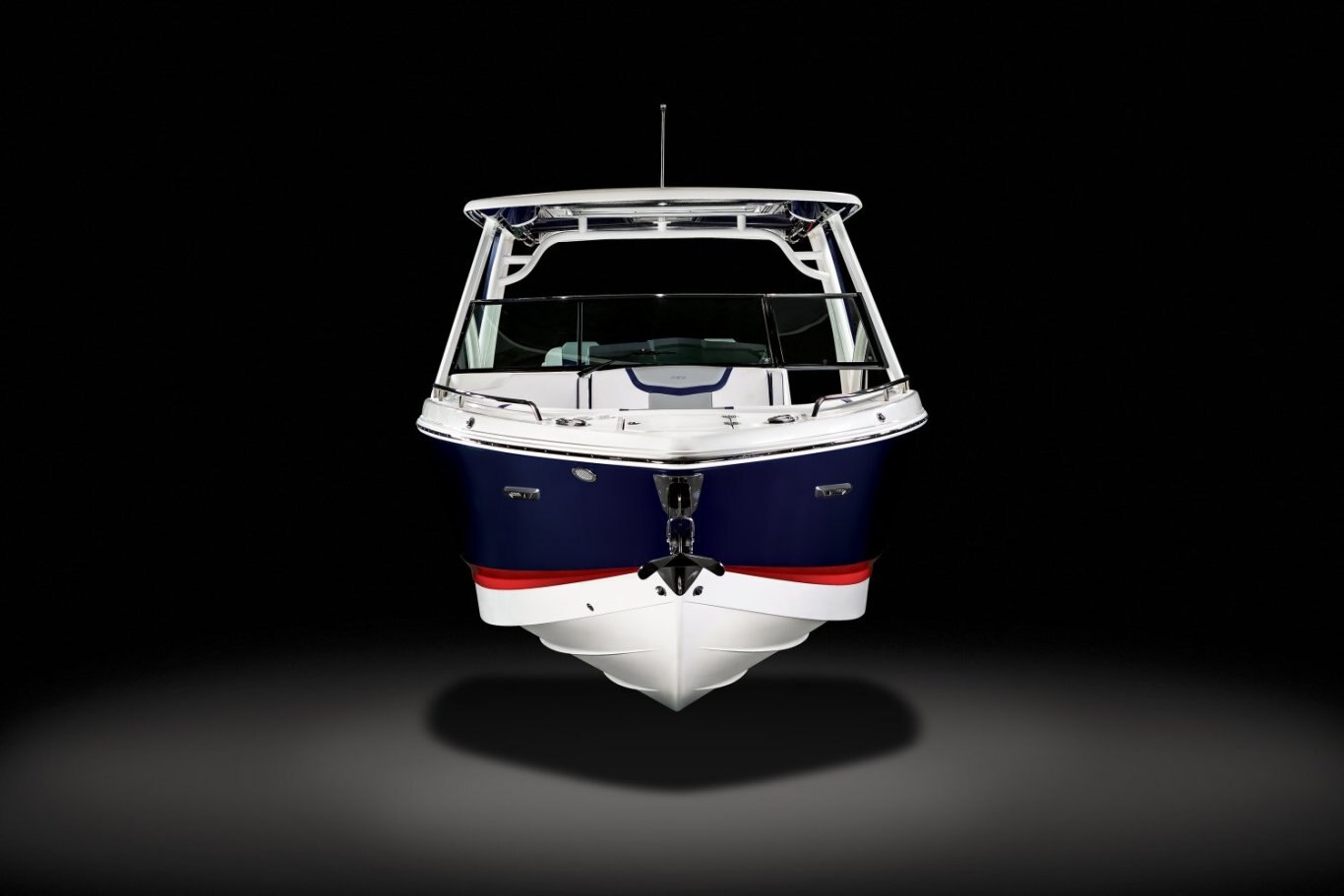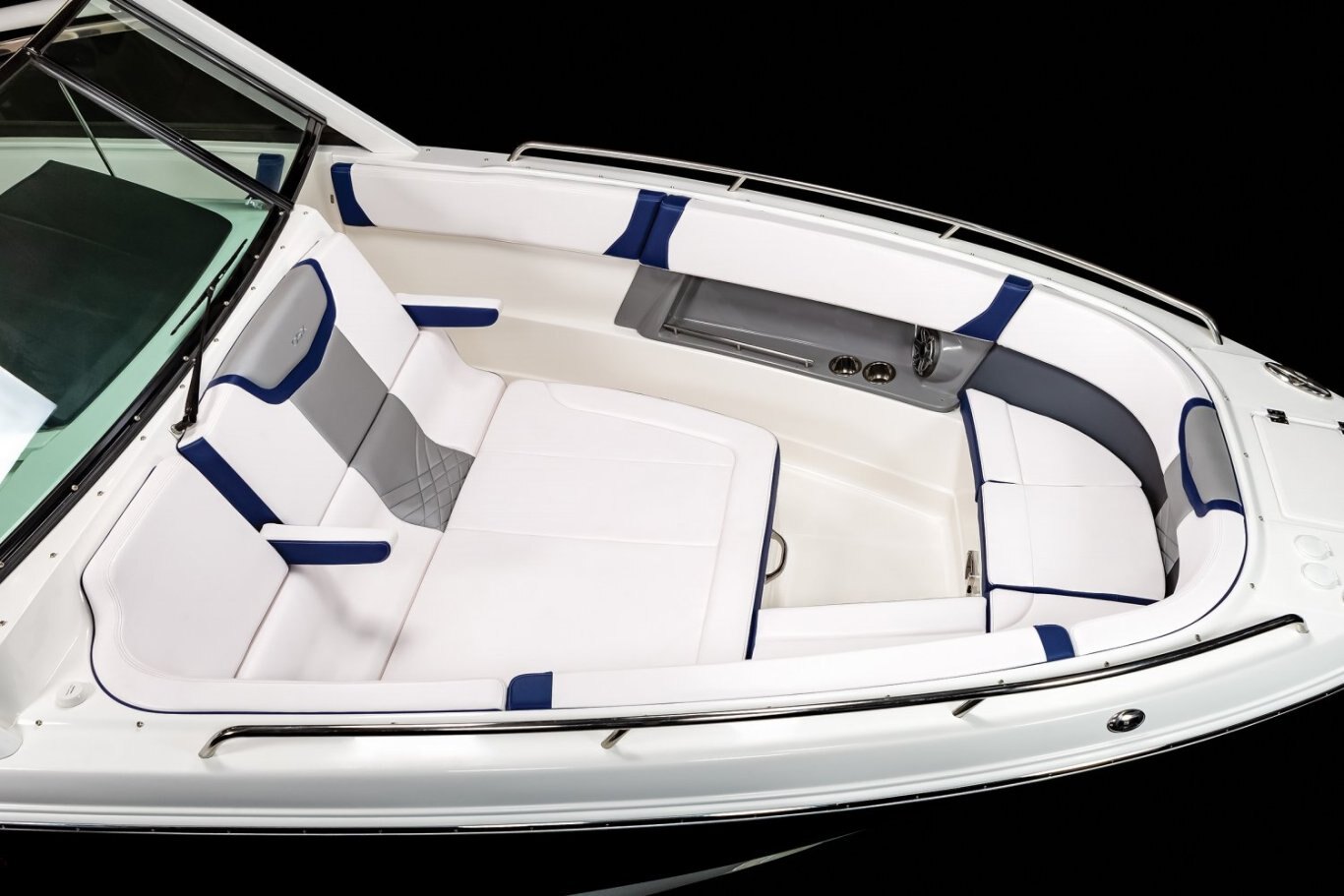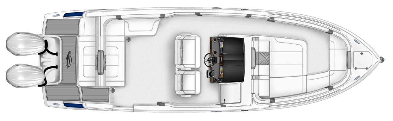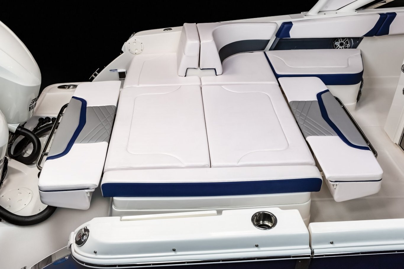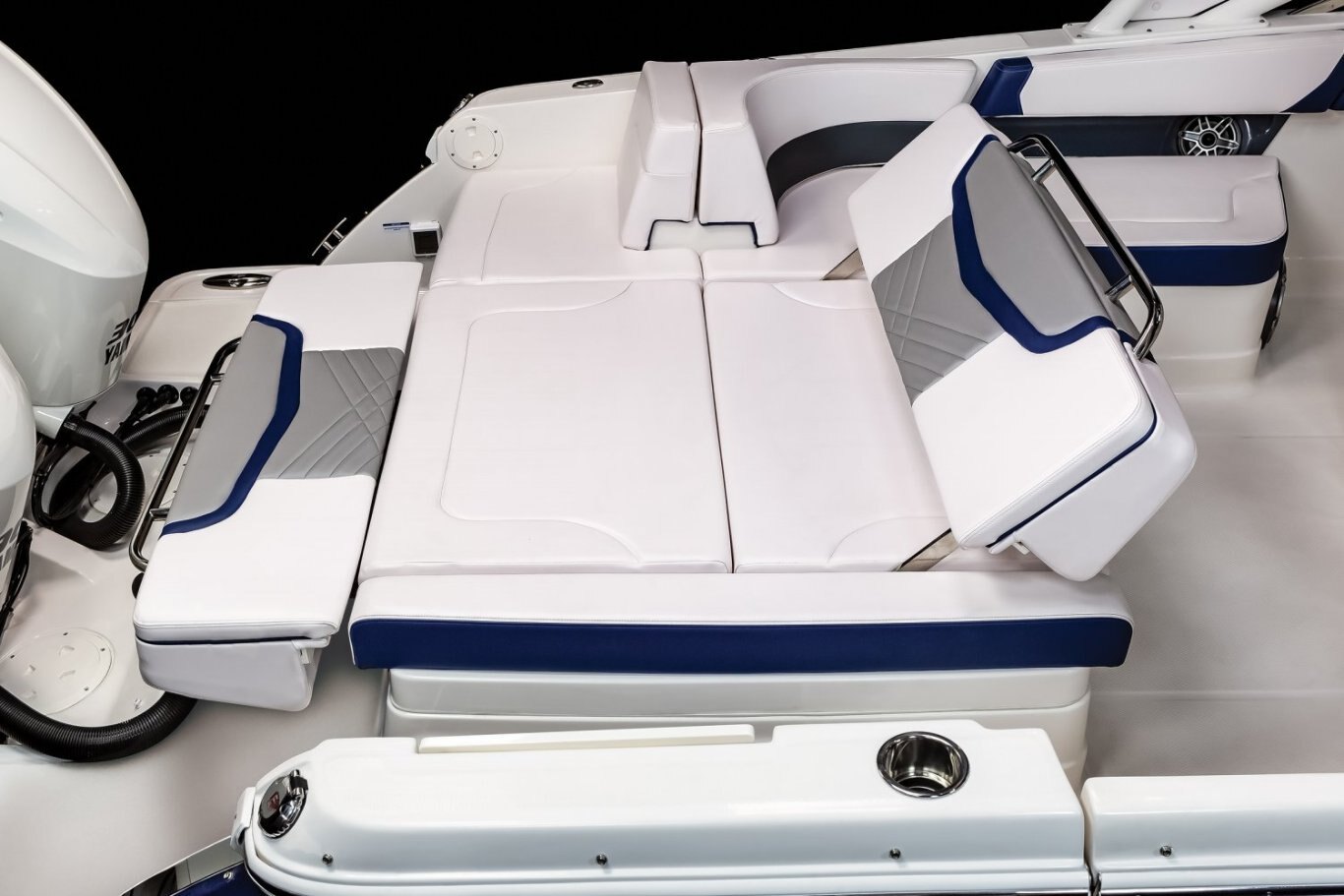 STANDARD FEATURES Bow Lounge Seating with Two Folding Armrests Built-In Insulated Cooler (140 Quart) Under Forward Bow Seat Carry-On Cooler (25 quart) Cockpit and Courtesy Lights - Blue LED Cockpit Drainage System (CDS) with Self Bailing Fiberglass Liner Cockpit Floor Hatch Opens to Accessory Room Cockpit Table with Side Mount Bases in the Cockpit and Bow Custom Helm Chairs with Flip-Up Bolsters and Three Armrests Custom Molded Cockpit Side Panel Storage (Bow and Cockpit) Custom Molded Dash with Hand Stitched Upholstery Visor DC Power Plugs - 12volt Diamond Pattern Non-Skid Surfaces Full Beam Intergrated Swim Platform Hand-Stitched Interior Upholstery Interior Color Packages: Black, Blue, Dune, Slate, Steel Blue or Cayenne L-Shaped Aft Seating with Hinged Port Cushion LED Courtesy Lighting in the Aft Storage Compartment and Cockpit Storages Oversized Bow Bolsters with Logo Stitching Premium Sound System Includes: AM/FM Bluetooth, Remote Control, NMEA Interface, and Display (Compatible for Sirius Satellite) Premium Stain Resistant Silicone Cockpit Fabric Recessed Transom Door Self Bailing Cockpit with Integrated Drain Fittings Sirus Satellite Tuner & Antenna Stainless Steel Bow Rails Stainless Steel Drink Holders (8) Stainless Steel Friction Hinges on Molded Hatches Starboard Cockpit Side Entry Door with Custom Frame and Stainless Steel Hardware Transom Stereo Remote Vista-View Lounge Seat with Reclining Backrests Converts into Sun Lounger Water Resistant Speakers (6), with Blue LED Lighting Wetbar (Includes: Solid Surface Countertop, Stainless Steel Sink, Pull-Out Sprayer, Stainless Steel Refrigerator, Trash Can, Stainless Steel Handrail, and Storage) Wrap Around Stainless Steel Windshield with Custom Supports
