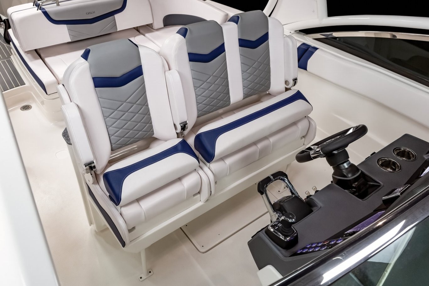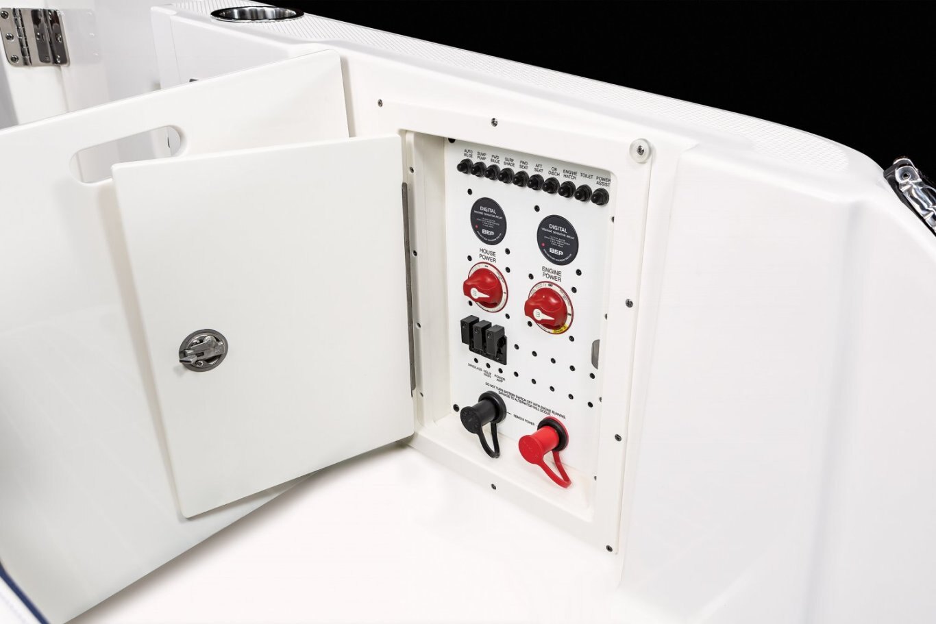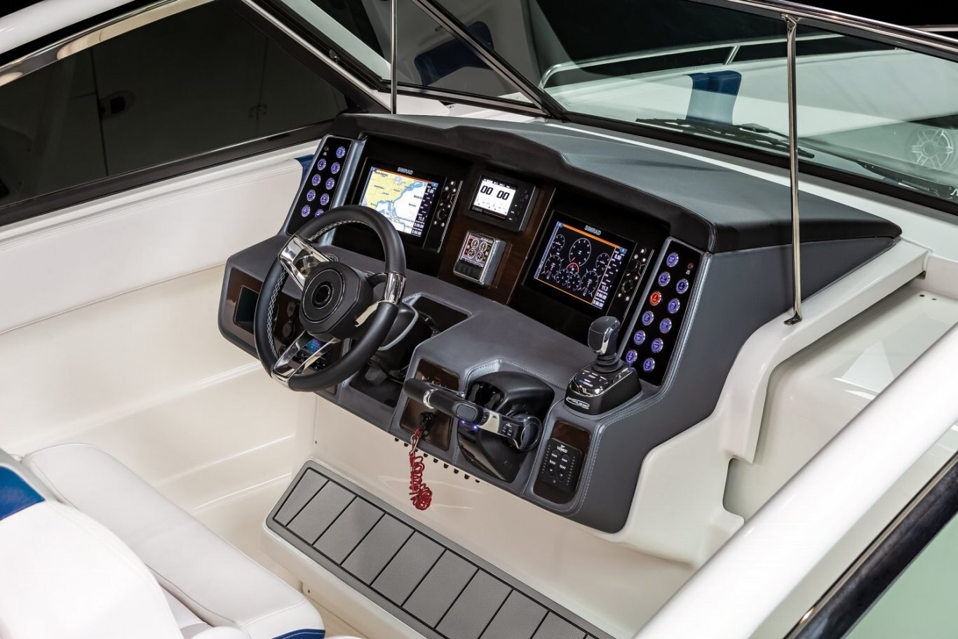 STANDARD FEATURES Aluminum Dash Panels Battery Switches - House and Engine with Emergency Parallel and Voltage Sensing Relay (VSR) Binnacle Mount Throttle and Shifter Control Custom Leather Steering Wheel with Protective Cover DC Power Plug - 12 Volt Digital Gauges Electrical Connectors Triple O-Ring Sealed and Water Tight Emergency Shut Down Switch Grounding Bars - Bilge Engine and Dash Molded-In Footrest at Helm Navigation Lights - LED Power Assisted Sea Star Tilt Hydraulic Steering Stainless LED Electronic Push Button Switches and Water Resistant DC Breakers Tinned Copper Wiring with Waterproof Connectors Twin Simrad NSS9 EVO3S Chartplotter/Multifunction Display Includes: 9" Color Multi-touch Displays with Chartplotter, GPS, Wifi, Insight Charts Inland and Coastal, Transducer, Engine Data and Audio Control Waterproof Wireless Charging Dock Windshield Wiper System
