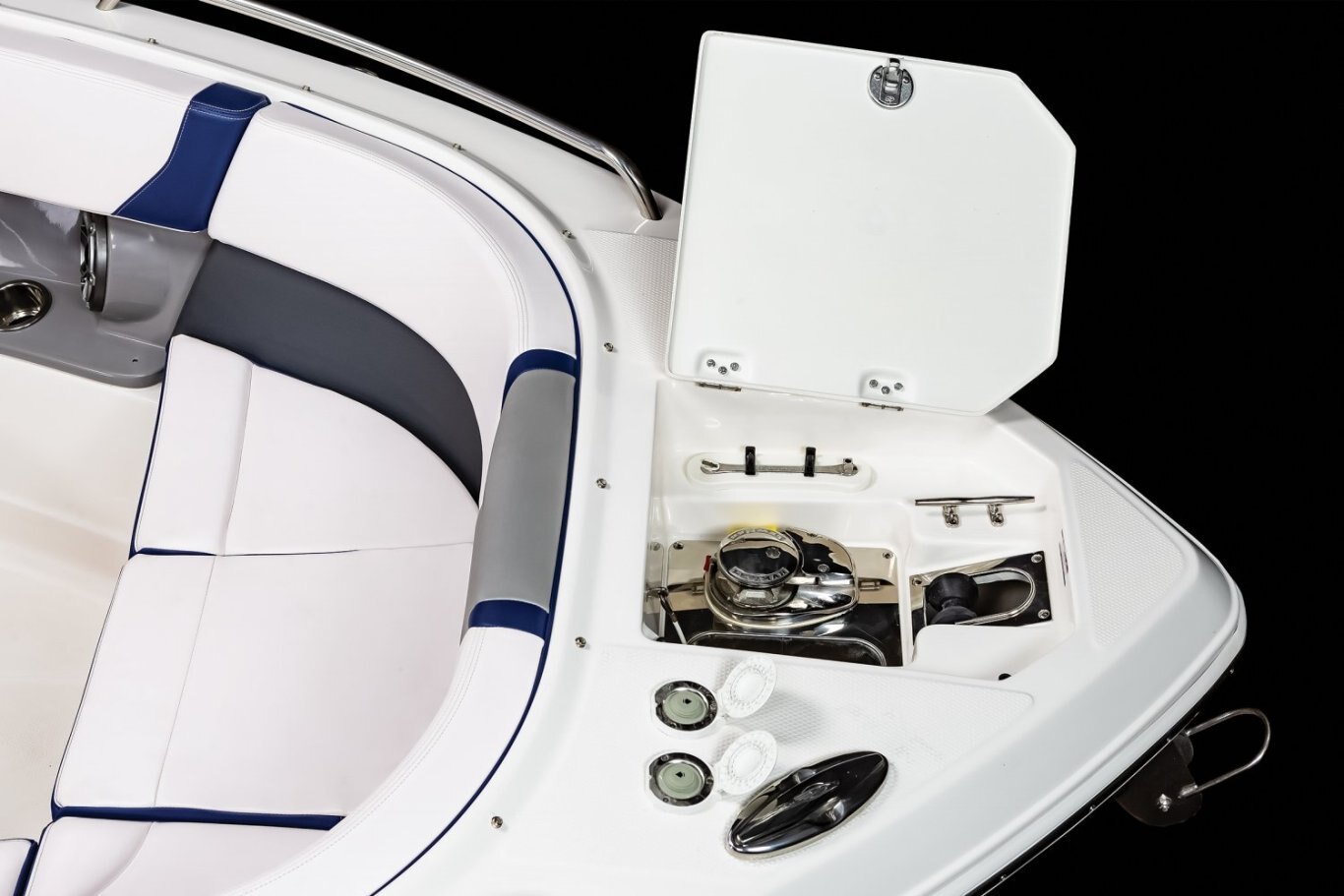 STANDARD FEATURES 25 lb. Galvanized Plow Anchor 250' Anchor Rope, 15' of Chain Anchor Locker with Molded Lid Bilge Pump with Automatic Switch and High Water Alarm Brass Threaded Garboard Drain Electric Hatch Lift into Bilge Compartment Electric Horn Fuel/Water Separator Heavy Duty Rubrail with Stainless Steel Insert Kelvar Re-Inforced Hull Laminate Lifetime Limited Hull Warranty NMMA Certified using ABYC Standards Perma-Panel Structural System Poured Composite Transom Coring Premium Hydropel Resin - Blister Resistant Pressurized Fresh Water System with Transom Shower Remote Power Connection Shore Power 120v Includes: Shore Inlet, Shore Cord, 3 Bank 20 Amp Battery Charger, Breaker Panel and Shore Cord Holder Stainless Steel Bow and Stern Eyes Stainless Steel Four-Step Hideaway Swim Platform Ladder Stainless Steel Pull Up Cleats, Through Bolted with Backing Plates (6) and (2) Fixed Cleats Stainless Steel Thru-Hull Fittings Stowable Aluminum Side Entry Boarding Ladder Through-Hull Stainless Steel Anchor Davit Trim Tabs with Indicator Switch Windlass Package: Includes (270' of Rope, 15' Chain, Anchor Windlass with Lanyard, Foot Switches and Helm Switch)