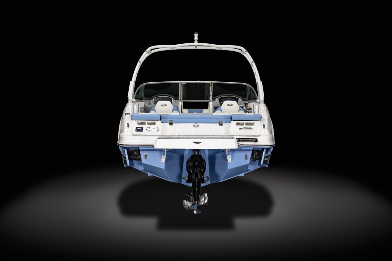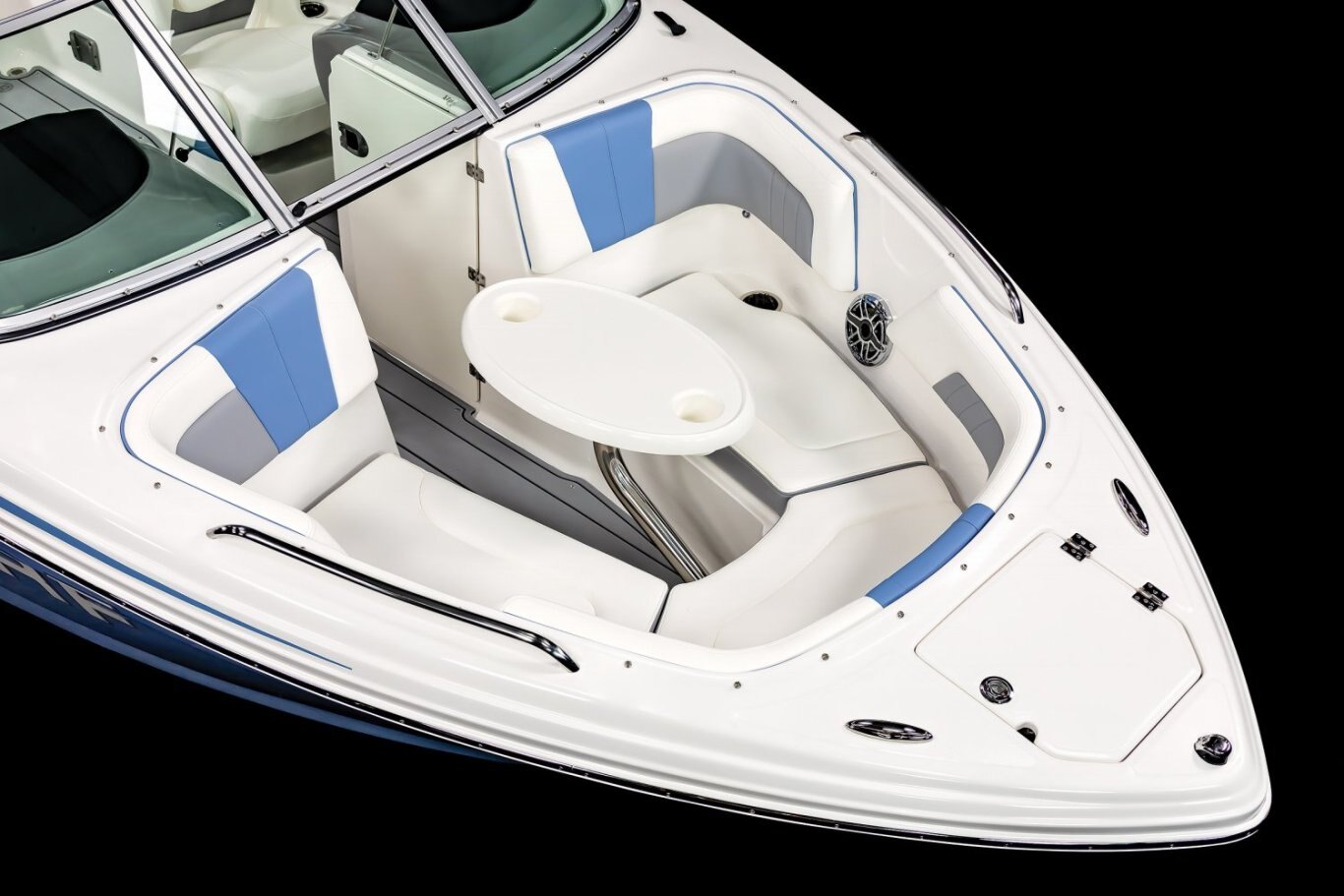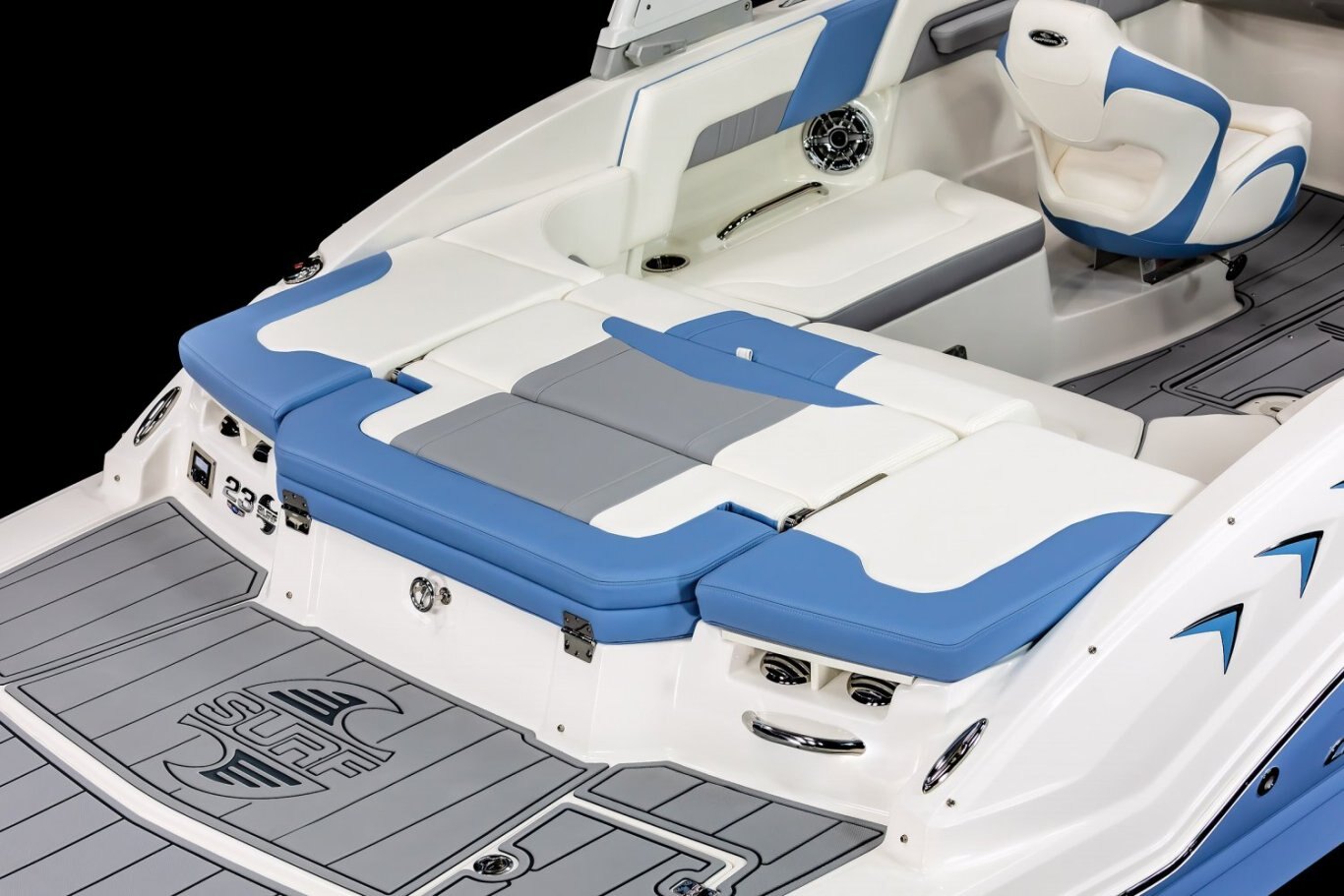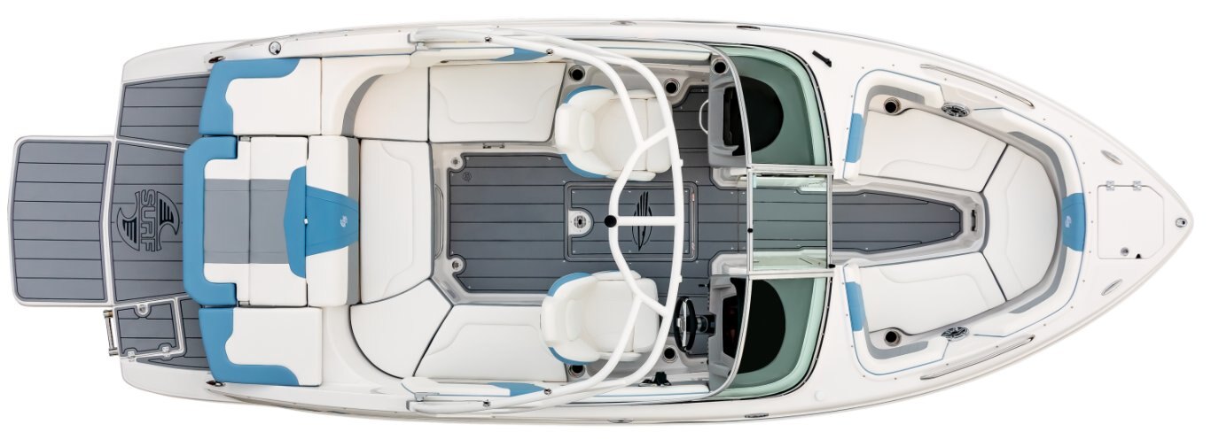 Cockpit Layout: Two Bucket Seats (Slide and Swivel) with Logo Badging, U-Shaped Seating and Aft Hinged Sundeck with Walk-Thru, Lounge Position and Aft Facing Seat