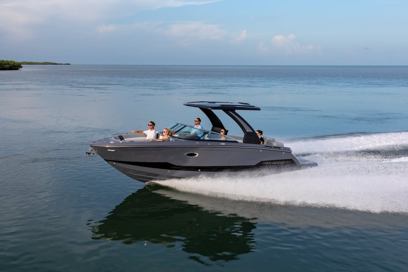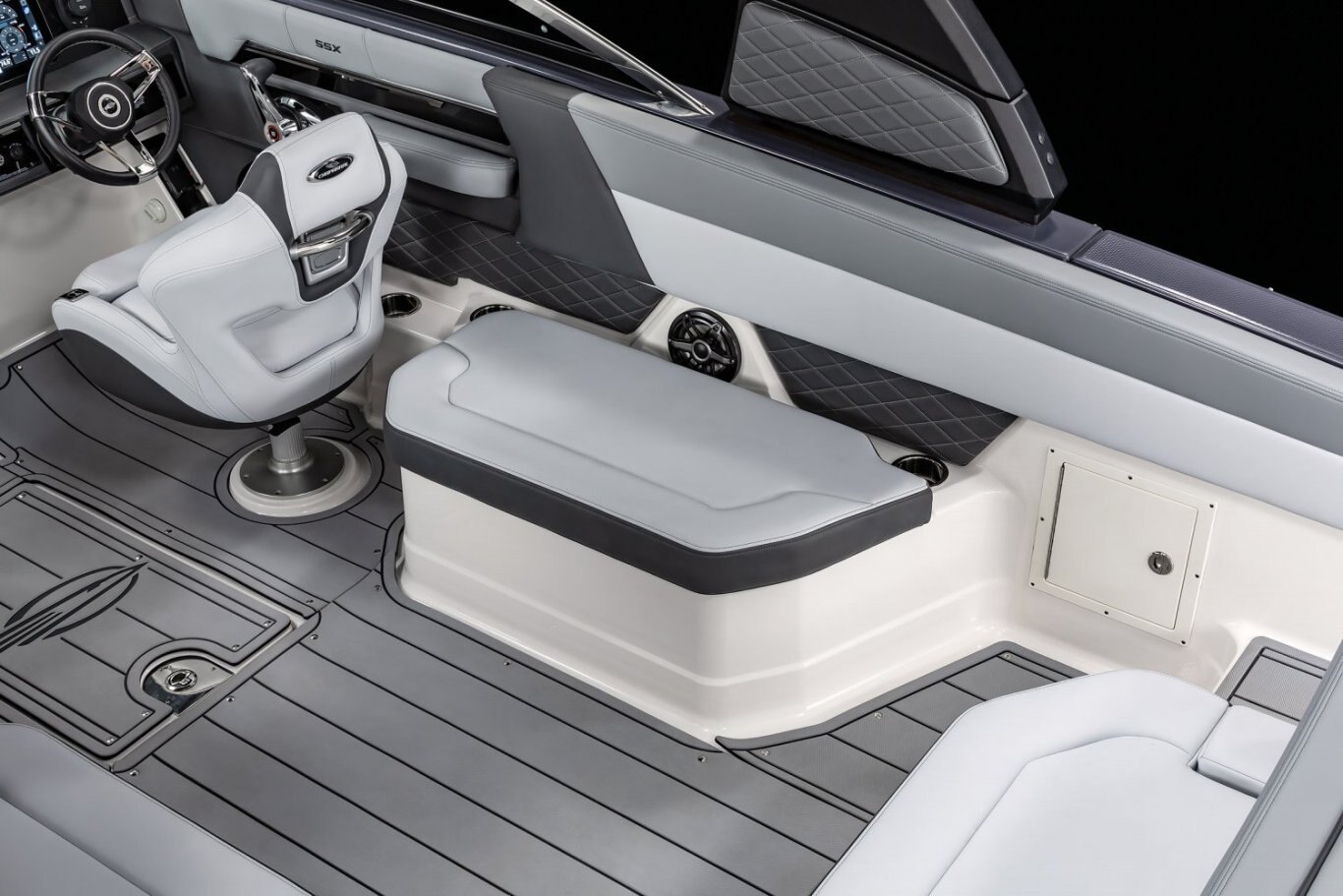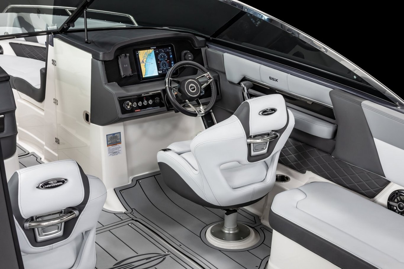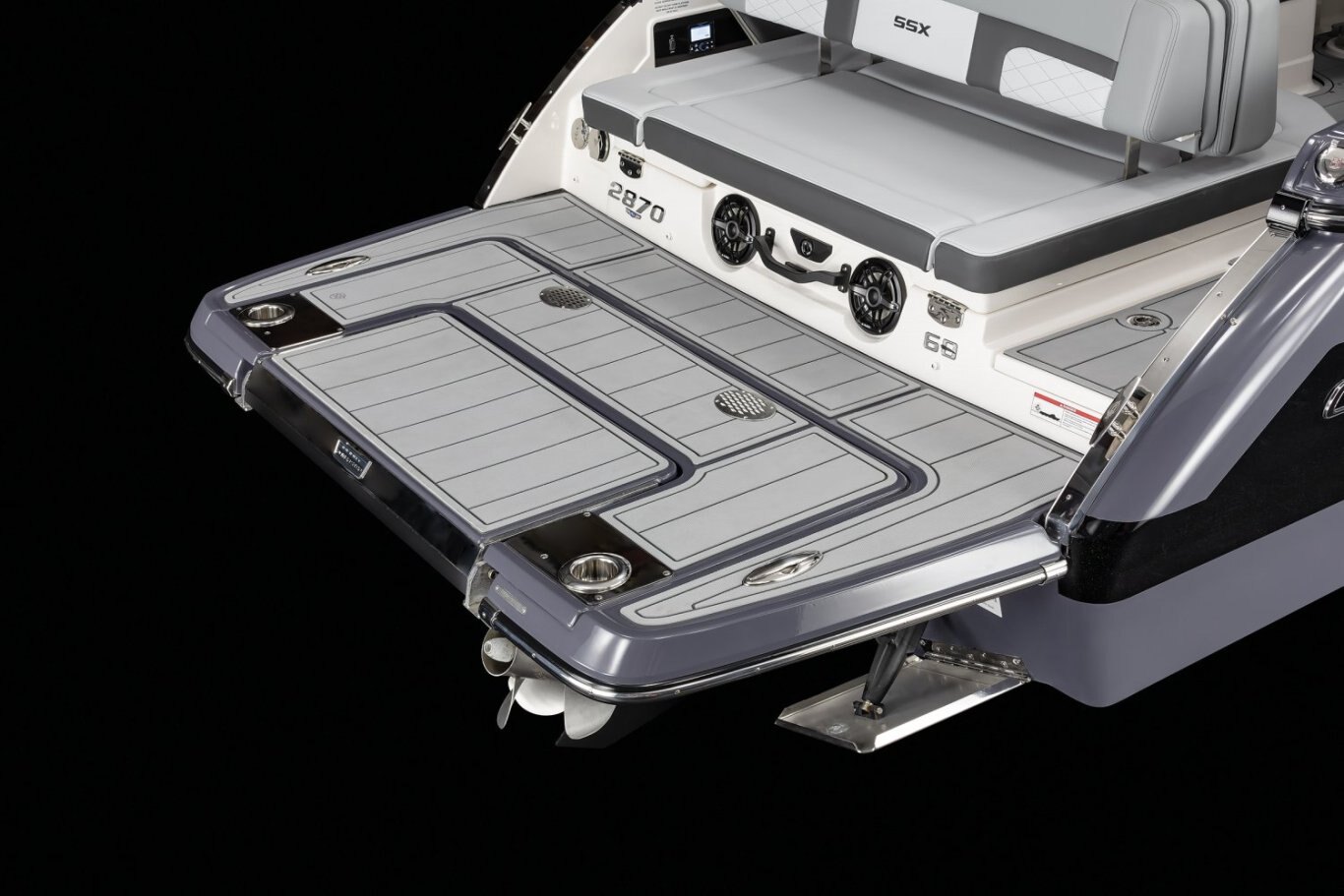 As Chaparral pushes toward the future, innovation is an inevitability. A responsive throttle and extended V-Plane hull will let you glide across the water while reclining on premium silicon upholstery. The furnished head, built-in coolers, and patented Infinity Power Step take the hard work out of a day of boating. New interior packages and gel-coated gunwales paired with the new HTX folding hardtop give the 2870 SSX a distinctive look that sets it apart from the crowd.