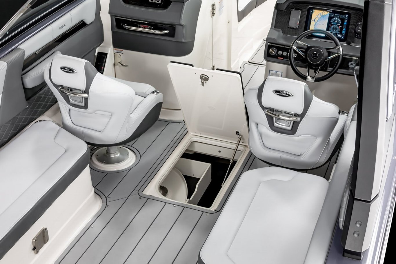 Standard Features Aft Bench Seating with Reversible Backrest System Manually Converts from Double Bench to Sun Lounge Bow Ice Chest Molded In (Insulated) Bow Passenger Seat Backrests Hinge to Access Large Storage Compartments - Port and Starboard Bow Seating with Storage Underneath Bow Walk-Thru Door Charging Stations with Power Plugs - Port and Starboard Helm Cockpit Drainage System (CDS) Cockpit Ice Chest Molded In (Insulated) Cockpit LED Lighting - Blue Cockpit Table with Dedicated Storage and Side Mount Bases in Cockpit and Bow Custom Molded and Wrapped Fibergalss Side Panels Diamond Pattern Non-Skid Surfaces Fiberglass Molded Bowrider Area Gas Assist Lifts Provide Access into Engine Compartment Hand-Stitched Interior Upholstery Interior Color Packages: Cayenne, Lunar, Shadow, or Slate Lockable Glove Box Door Molded-In Footrest Premium Bucket Seats - Port and Starboard Premium Sound System Includes: AM/FM Bluetooth, Remote Control, NMEA Interface, and Transom Remote (Compatible for Sirius Satellite) Premium Stain Resistant Silicone Cockpit Fabric Pressure Water System Self Bailing Cockpit with Integrated Drains Stainless Steel Bow Rails Stainless Steel Cockpit Grab Handles Stainless Steel Drink Holders with LED Lighting Stainless Steel Transom Shower StarLite Seat Bases with Flow Foam Storage in Floor with Large Hinged Fiberglass Hatch and Rubber Mat Storage under STBD Helm with Protective Mat and Trash Receptacle U-Shaped Aft Cockpit Seating with Double Arm Hinged Cushions Water Resistant Speakers (8), with Blue LED Lighting Wrap Around Stainless Steel Walkthrough Windshield with Custom Supports