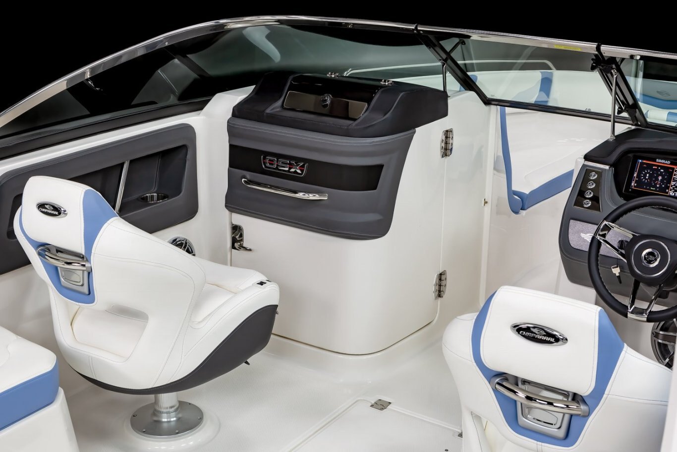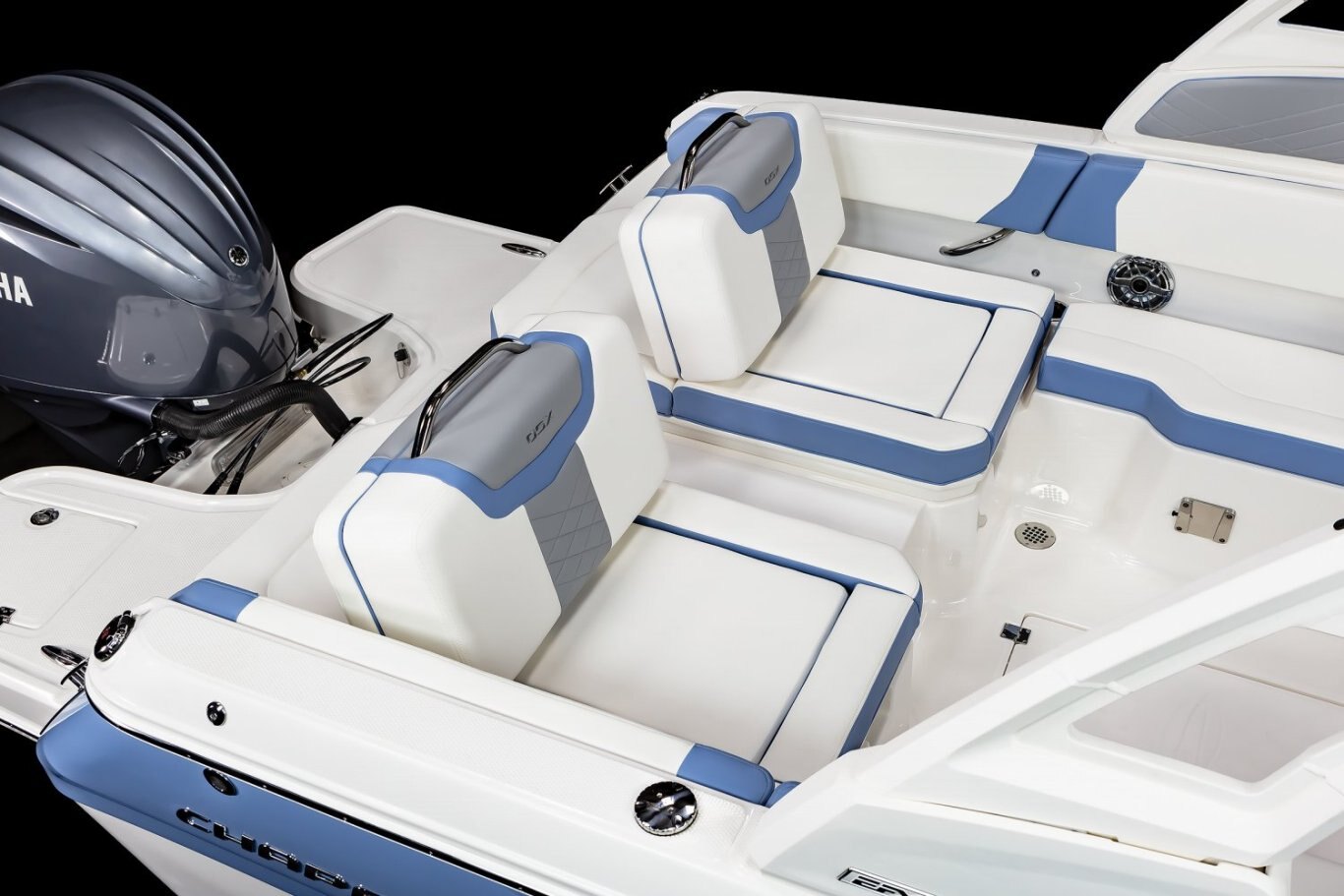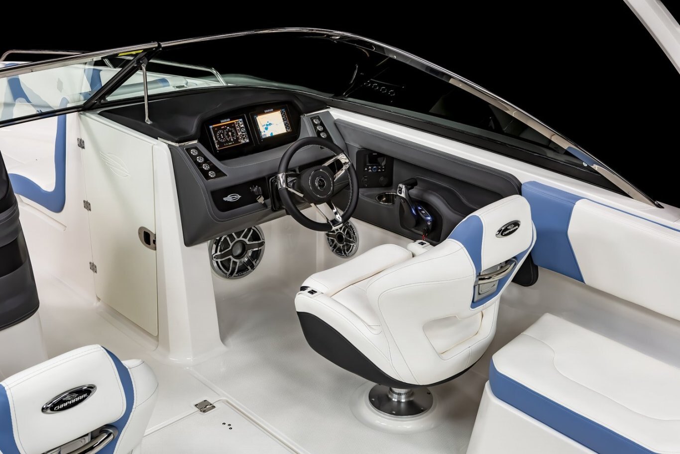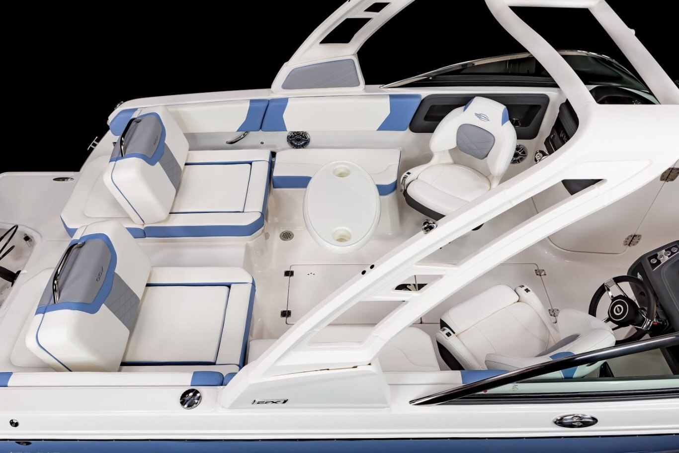 Standard Features Aft Split Bench Seating with Reversible Backrest System Manually Converts to Individual Sun Lounges Bow Cushion - Hinged with Storage Compartment Underneath - Port Bow Ice Chest (Insulated) Bow Passenger Seat Backrest Hinged to Access Large Storage Compartment - Starboard Bow Walk-Through Door Cockpit Draining System (CDS) Cockpit Layout - Helm Bucket Seats with Logo Badging and U-Shaped Aft Bench Seat Custom Molded Interior - Silicone Fabric Wrapped Fiberglass Side Panels Custom Removable Storage Tubs under Rear Seats - Port and Starboard Diamond Pattern Non-Skid Fiberglass Molded Bowrider Area Gas Assist Lifts Provide Access into Stern Storage Interior Color Packages: Cayenne, Lunar, Shadow, or Slate LED Lighting in Cockpit - Blue Lockable Port Glove Box Storage Mechanical Room Storage in Aft Cockpit Floor with Rubber Mat Molded Cooler under Starboard Bench Seat with Overboard Drain - 50 Quarts Molded-In Footrests Premium Stain Resistant Silicone Cockpit Fabric Self Bailing Cockpit with Integrated Drains Ski and Kneeboard Storage in Floor with Rubber Mat Stainless Steel Bow Rails Stainless Steel Cockpit Grab Handles Stainless Steel Drink Holders with LED Lighting StarLite Seat Bases with Flow Foam Storage under Starboard Console with Protective Mats Ultra-Comfort Pedestal Seats with Flip-Up Bolsters Water Resistant Speakers (6), with Blue LED Lighting Wrap Around Stainless Steel Walk-Through Windshield with Custom Supports