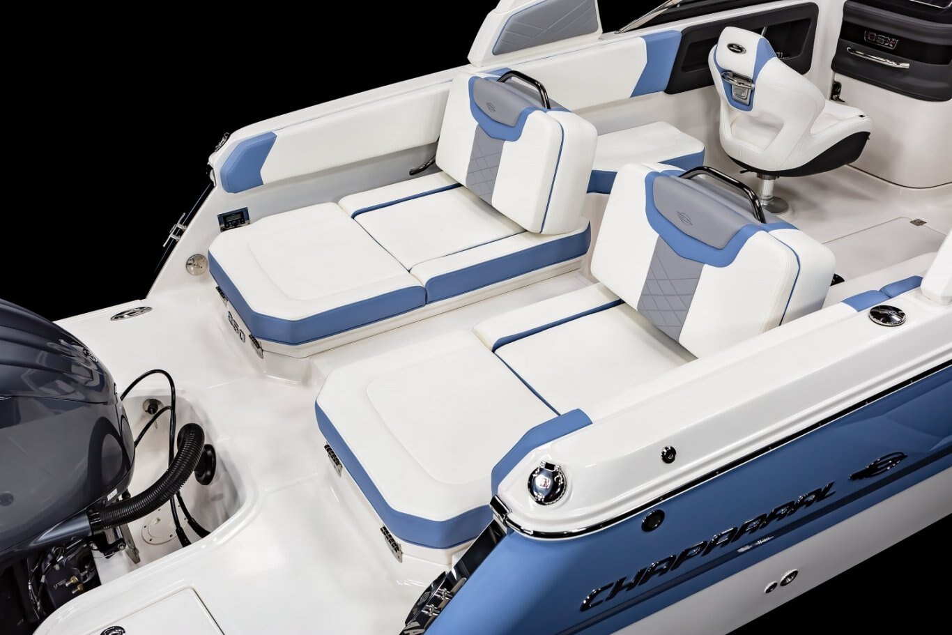 The 250 OSX packs all of your favorite Chaparral features into an affordable package with a length overall of 24' 6". Comfort, safety, and convenience are built into the DNA of each 250 OSX featuring pull-up cleats, dual fuel fills, and our diamond pattern non-skid found on almost every surface of the boat. The dual aft Vista-view lounges are the largest in class and can accommodate guests in a variety of positions with large storage tubs built beneath them for storing gear. Our luxury, appointed Envision Sio wrapped upholstery, optional bow filler cushion, and snap-in SeaDek flooring can be added for more versatility and all provide maximum comfort.