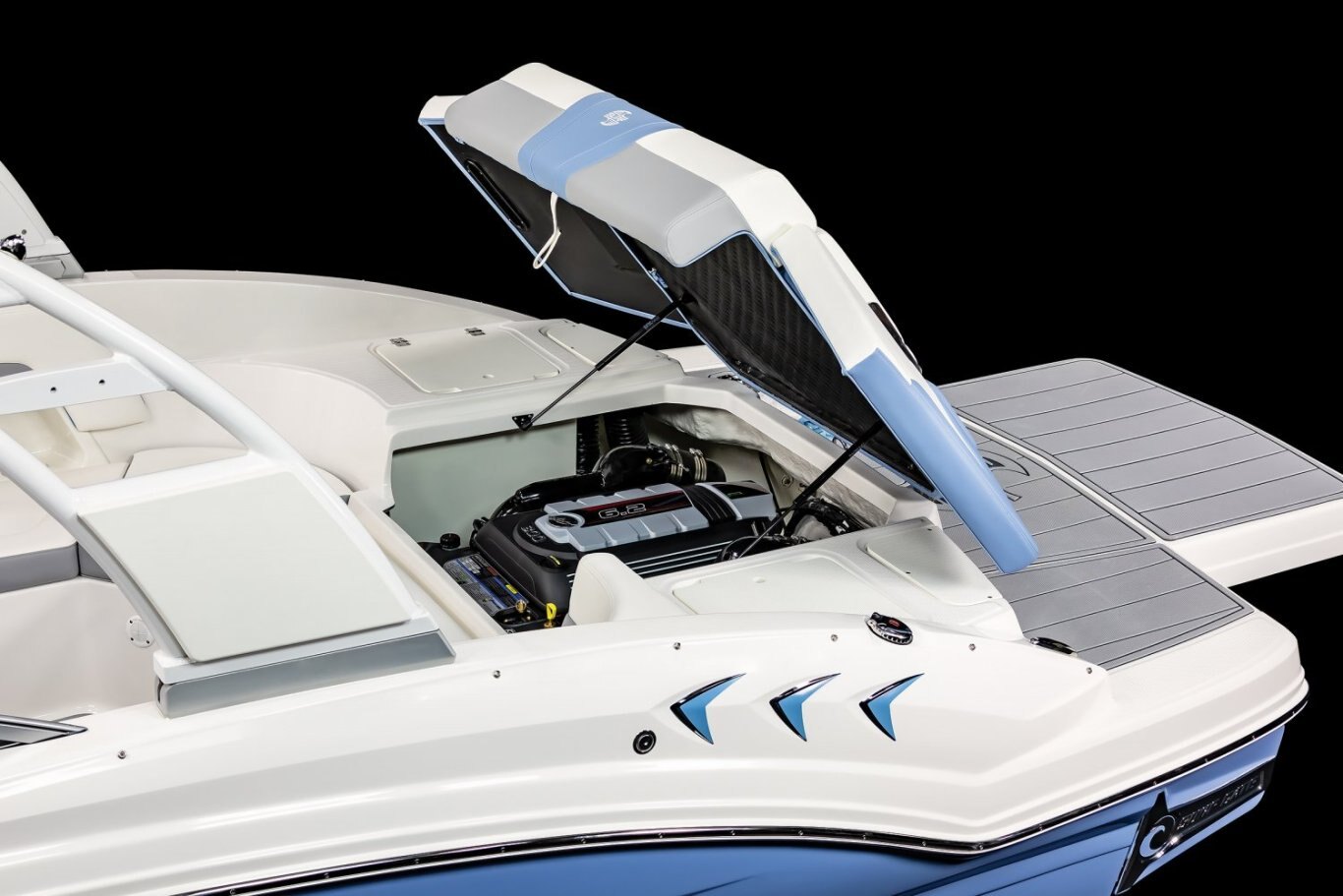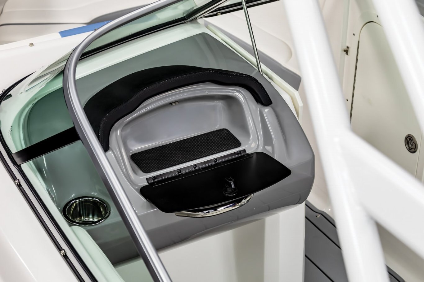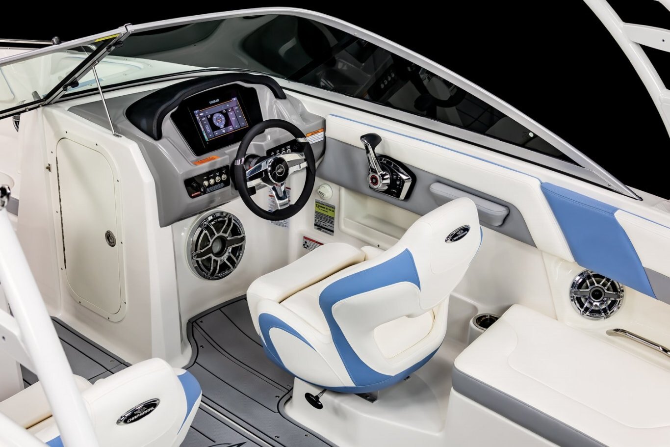 The 23 Surf comes standard with a Simrad Multifunction Touch Screen control, a custom molded fiberglass dash with a hand stitched vinyl wrapped visor and a steering wheel mounted on a tilt base. With this advanced helm, critical information such as engine performance, fuel level, and depth is always in view or just a touch away.