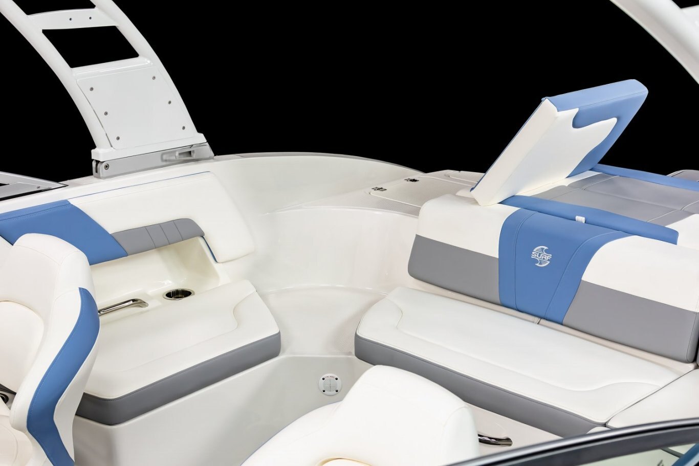 Cockpit Layout: Two Bucket Seats (Slide and Swivel) with Logo Badging, U-Shaped Seating and Aft Hinged Sundeck with Walk-Thru, Lounge Position and Aft Facing Seat