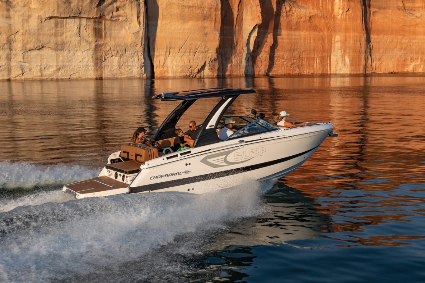 Surf the perfect wave all summer long with the 26 Surf. Malibu Surf Gates make this boat a surfer's paradise, and the EFX electric folding arch tower lets wakeboarders join in the fun. The award-winning Infinity Power Step makes reboarding a breeze with its one-button operation. A forward-facing drive keeps swimmers safe and the spacious cockpit will let everyone relax with plenty of space for storage.