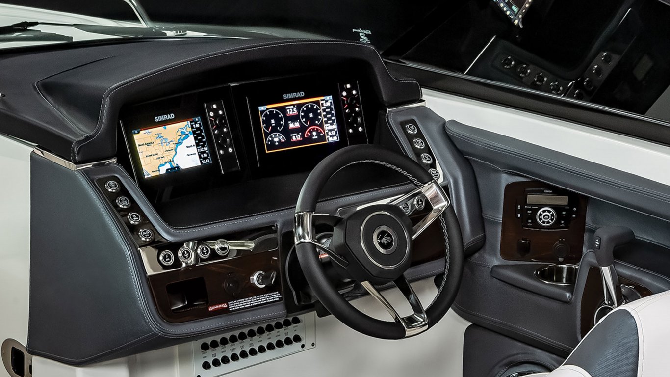 Standard Features Custom Hand Wrapped Helm Consoles with Stainless Steel Accents Custom Leather Steering Wheel with Protective Cover Electrical Connectors Triple O-Ring Sealed and Water Tight Emergency Shut Down Switch Grounding Bars - Engine and Dash Loom Wrapped Wiring Owner's Dry Bag Power Assisted Steering with Tilt Wheel Rack & Pinion Steering Stainless LED Electronic Push Button Switches and Water Resistant DC Breakers Twin Simrad NSS7 EVO3 Chartplotter/Multifunction Displays Includes: 7" Multi-touch Displays, Gauge Screen, Cruise Icon, Settings Menu, and Surf Gate Screen Windshield Wiper - 2 Speed
