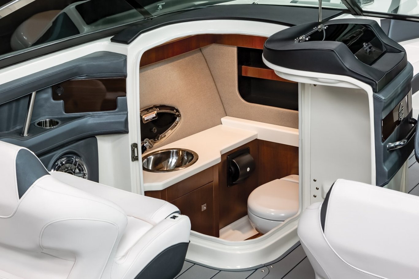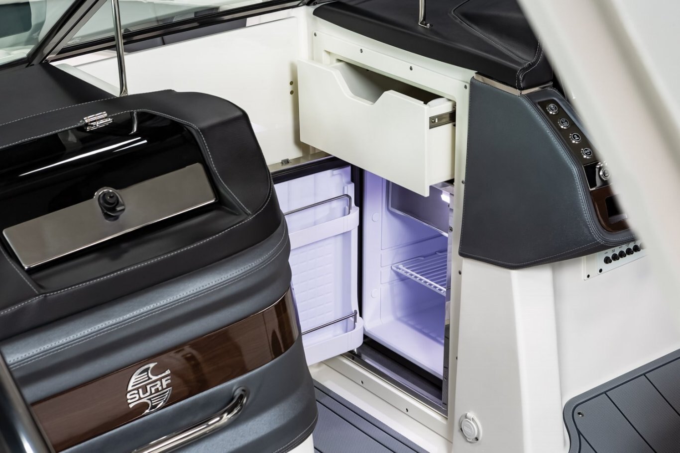 Optional Features Bowrider Filler Cushion Infinity Power Step Mat - Cayenne Infinity Power Step Mat - Slate Snap-In Seadek Cockpit Flooring - Cayenne Snap-In Seadek Cockpit Flooring - Slate Stainless Steel Refrigerator Teak for Cockpit Table