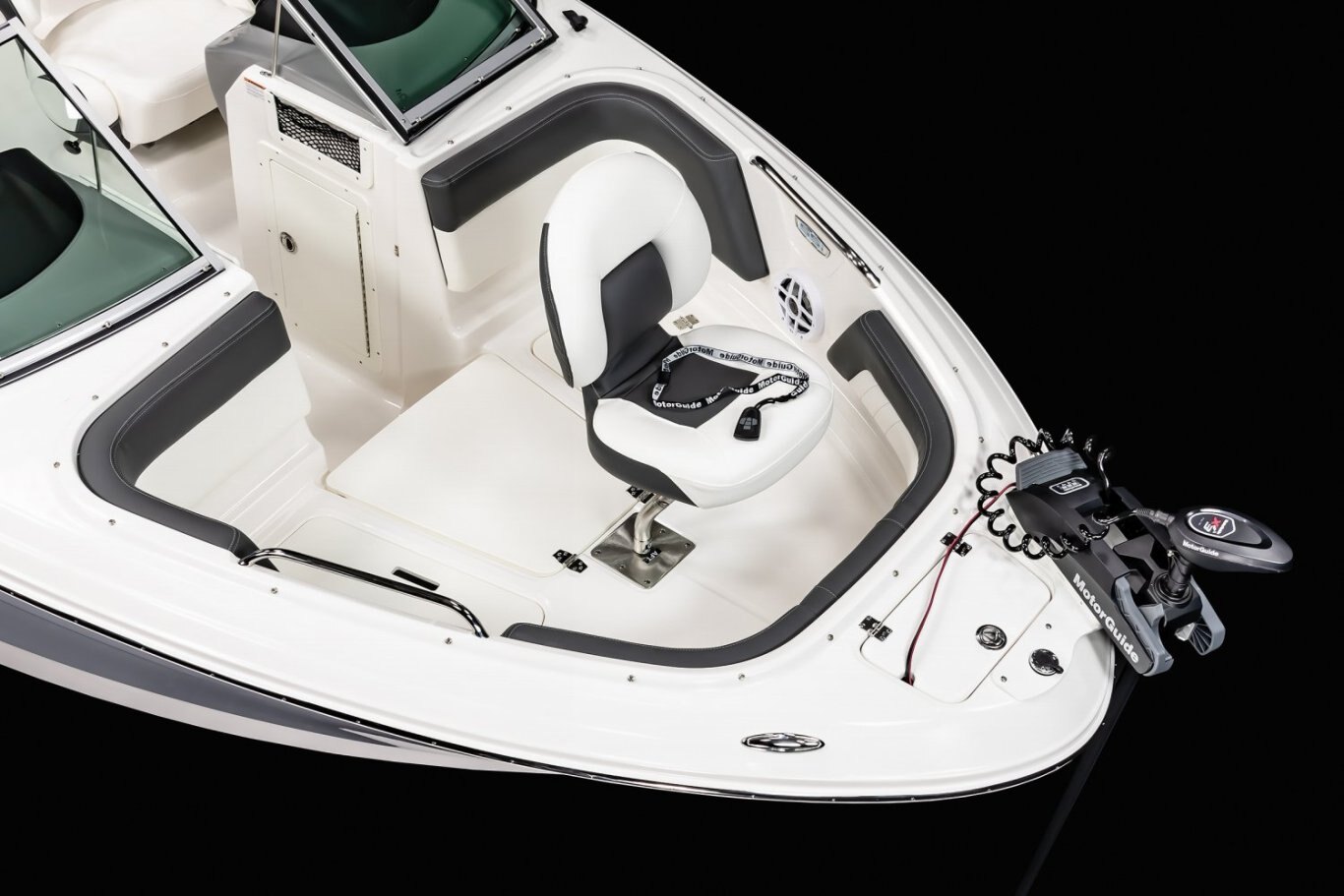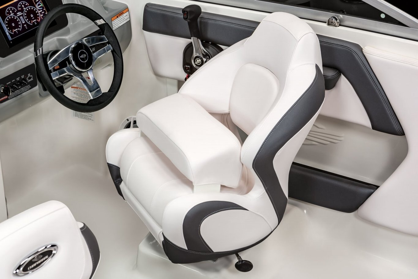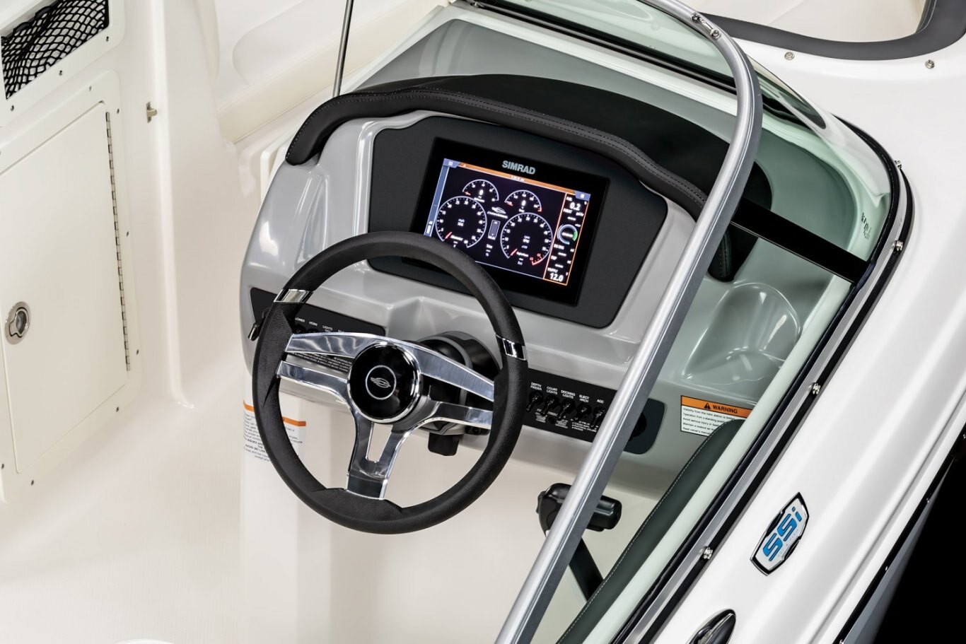 ENJOY THE RIDE.Set against an all-new helm design featuring a custom hand-stitched brow, the touchscreen Simrad GO7 will give you all the information you need for a safe day of boating. This all-in-one package will provide engine information, a depthfinder, a chartplotter, and stereo controls. |
